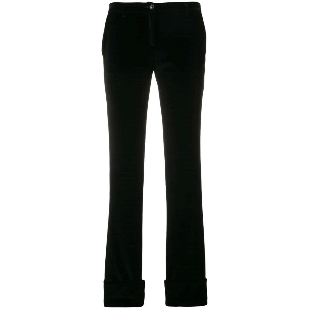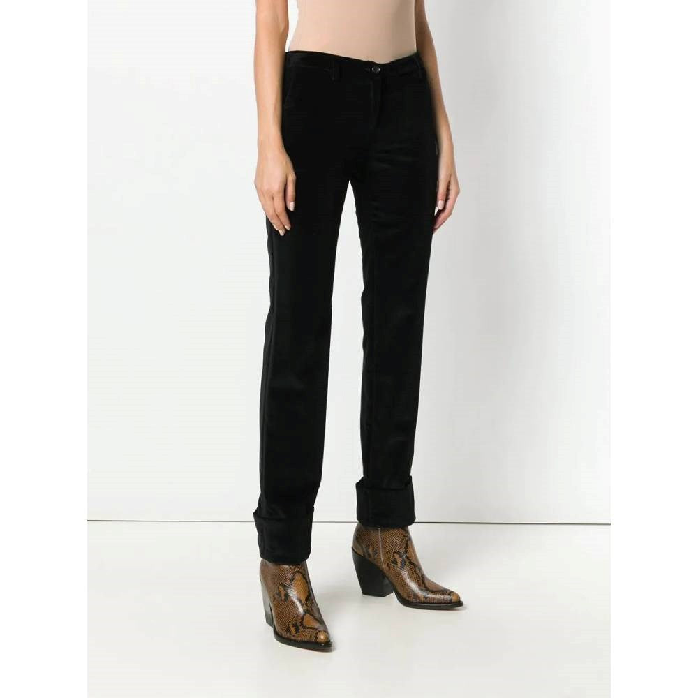 Romeo Gigli black cotton velvet turn-up tailored trousers. Waistband with belt loops, button fastening, regular length, turn up hems and a straight leg.