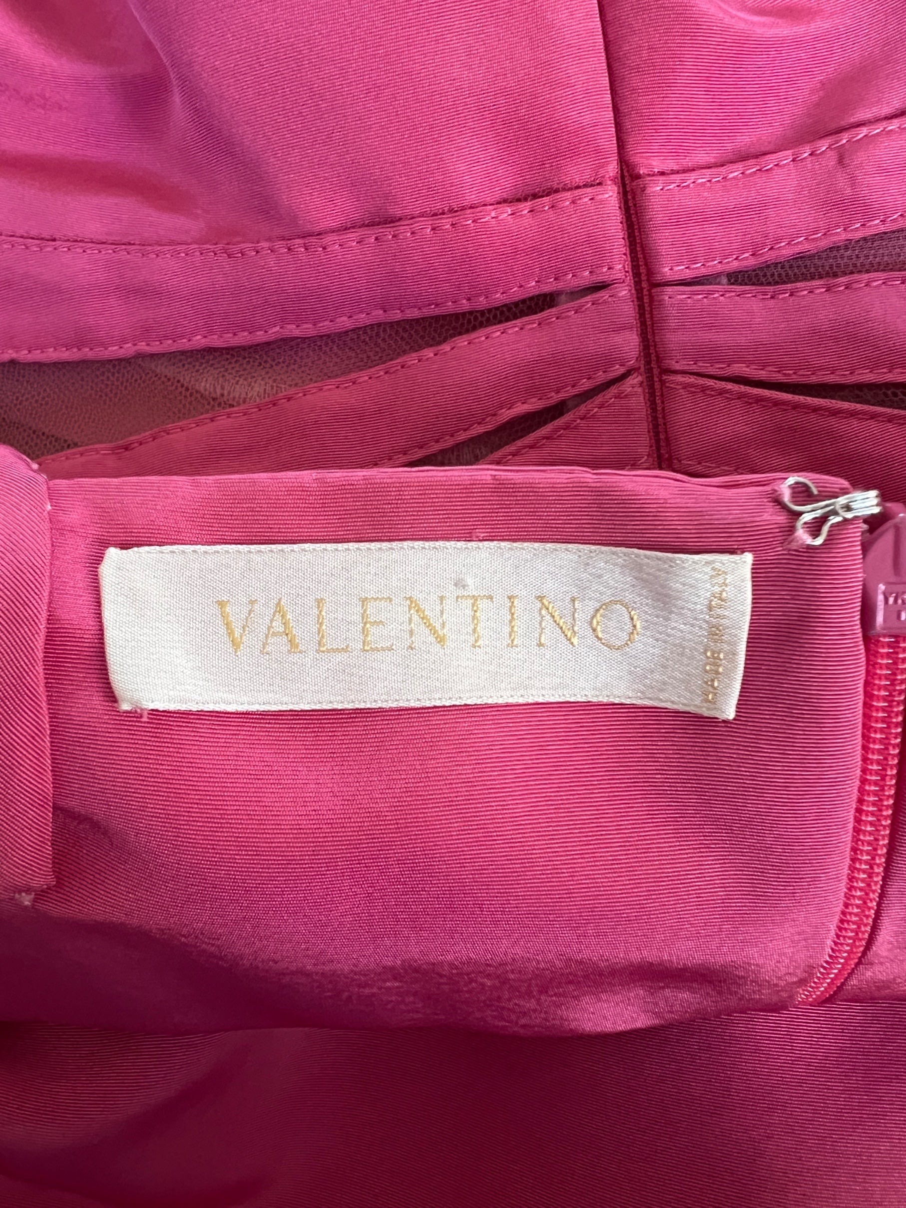 This spotlight stealing, Valentino candy pink maxi dress was designed during the very early 2000s and was probably a Cruise collection piece. It was certainly designed pre 2008, when Valentino Garavani himself was still at the helm of his eponymous fashion house. Crafted from silk faille fabric in vibrant pink - a colour that has become a signature of the house, the stiffened fabric ensures that the gown holds its shape. Tailored to a theatrical fish-tail shape which hugs the bust and hips and flares out dramatically from the top of the thigh. The bust is tailored with a straight neckline and, below this, peekaboo cut-out stripes filled with sheer nude mesh curves around the sides of the body and offer flashes of skin. The cut-outs continue around to the back of the dress, forming a stunning starburst shape at the rear. The front of the bust is adorned with decadent embroidered and beaded roses in shimmering iridescent pink. The straps are smothered with beaded roses that mirror the detail at the bust. The dress is lined, only at the bust, with pink taffeta. It fastens down the middle of the back with a hidden tonal zip and hook-and-eye clasp. The label reads “Valentino” is glittering gold thread on white cloth.