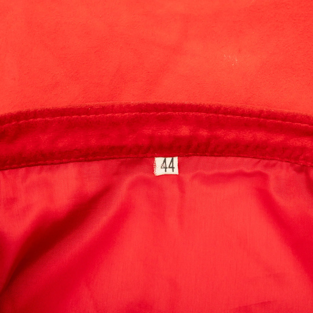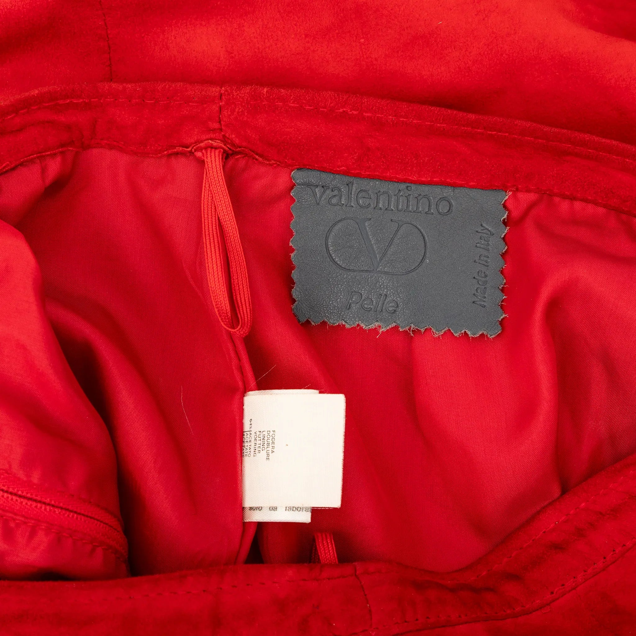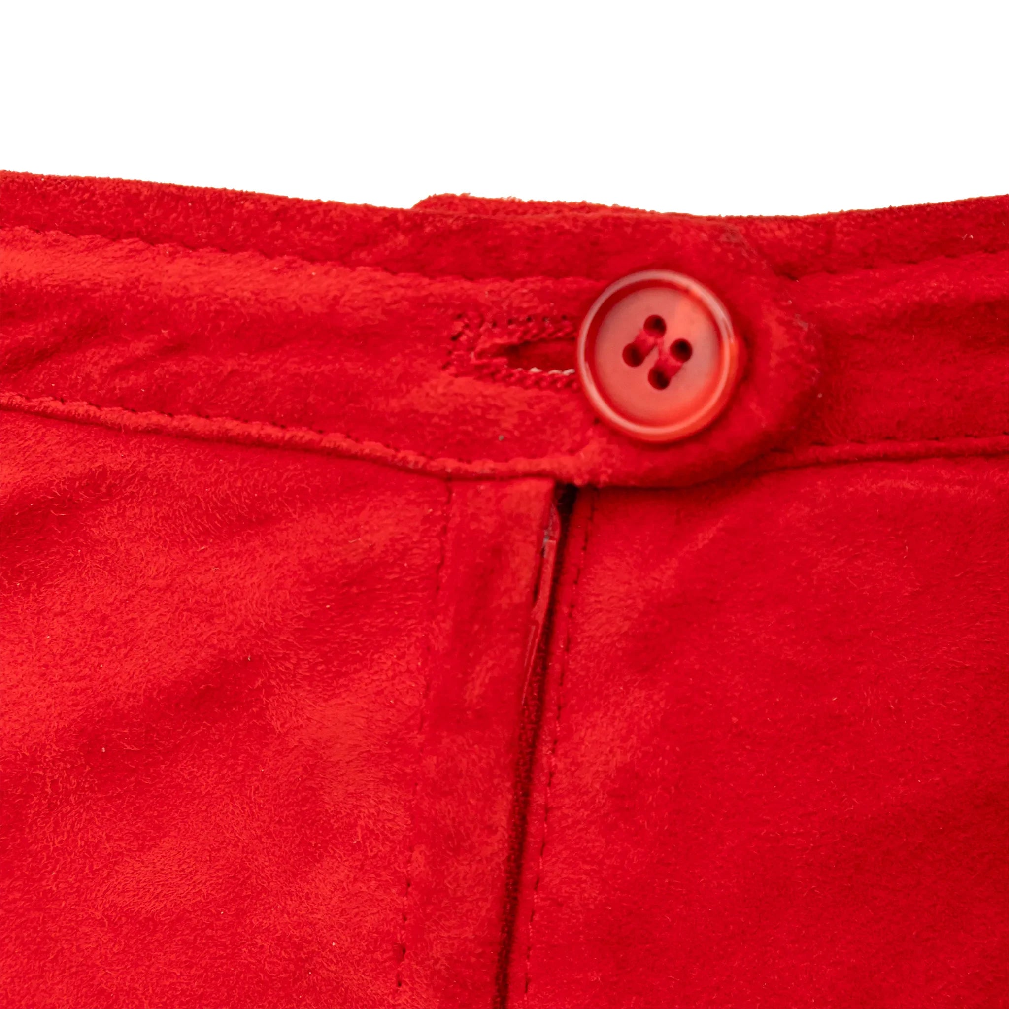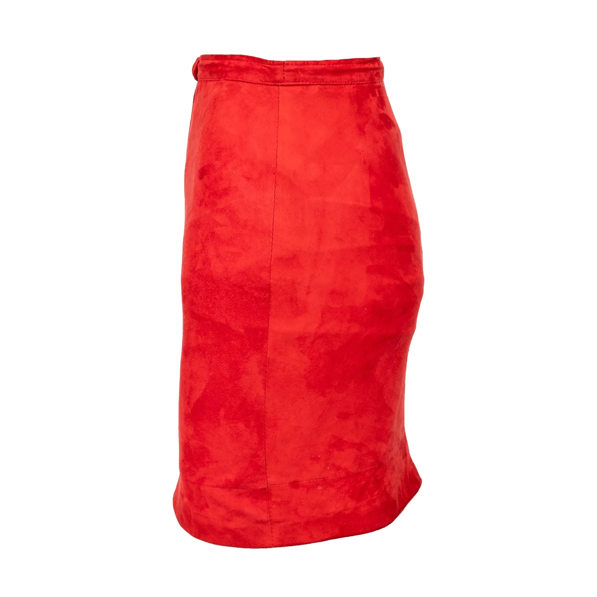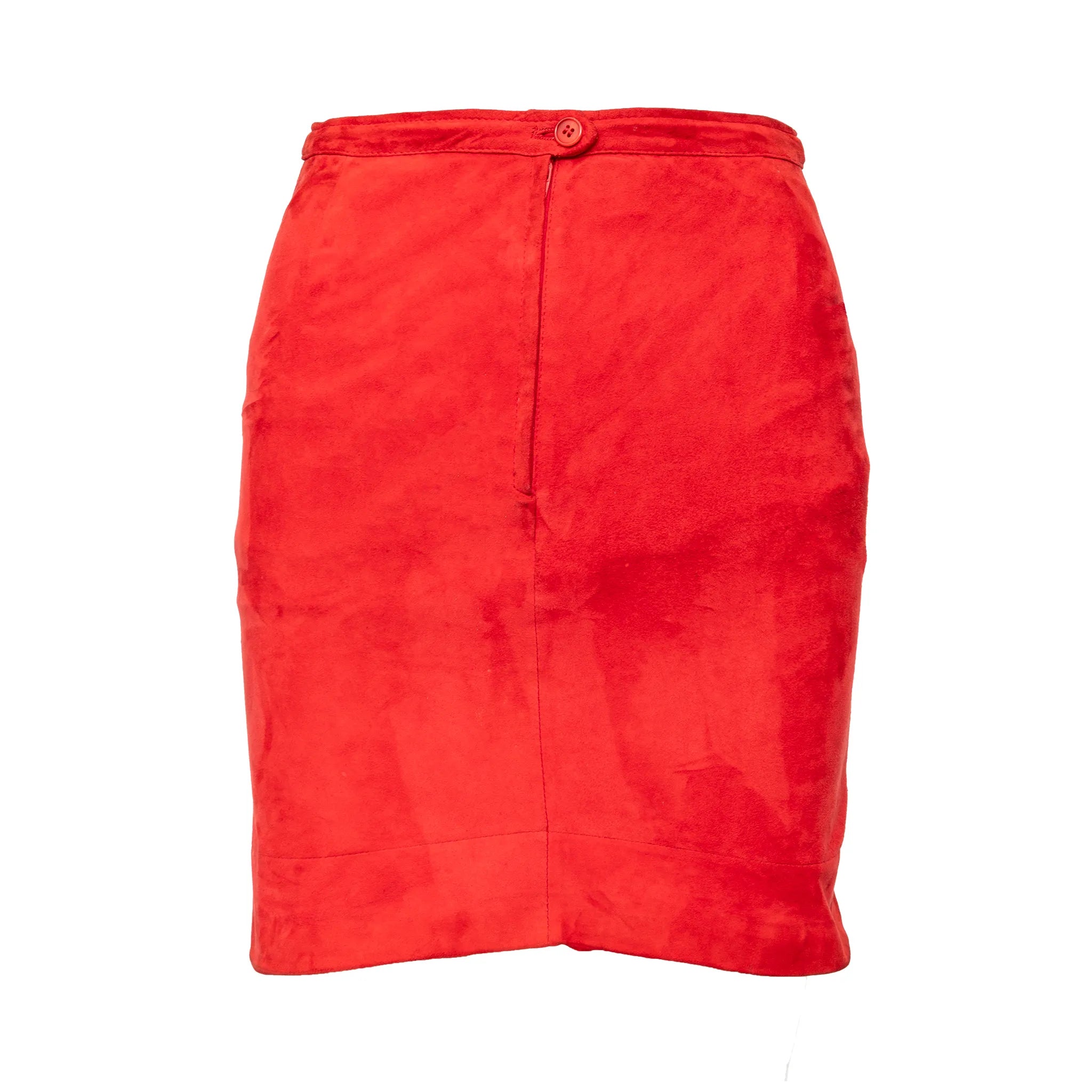 Red suede leather mini skirt with a fitted silhouette, back zipper, and button closure. Bold and chic, perfect for elevating day-to-night looks.