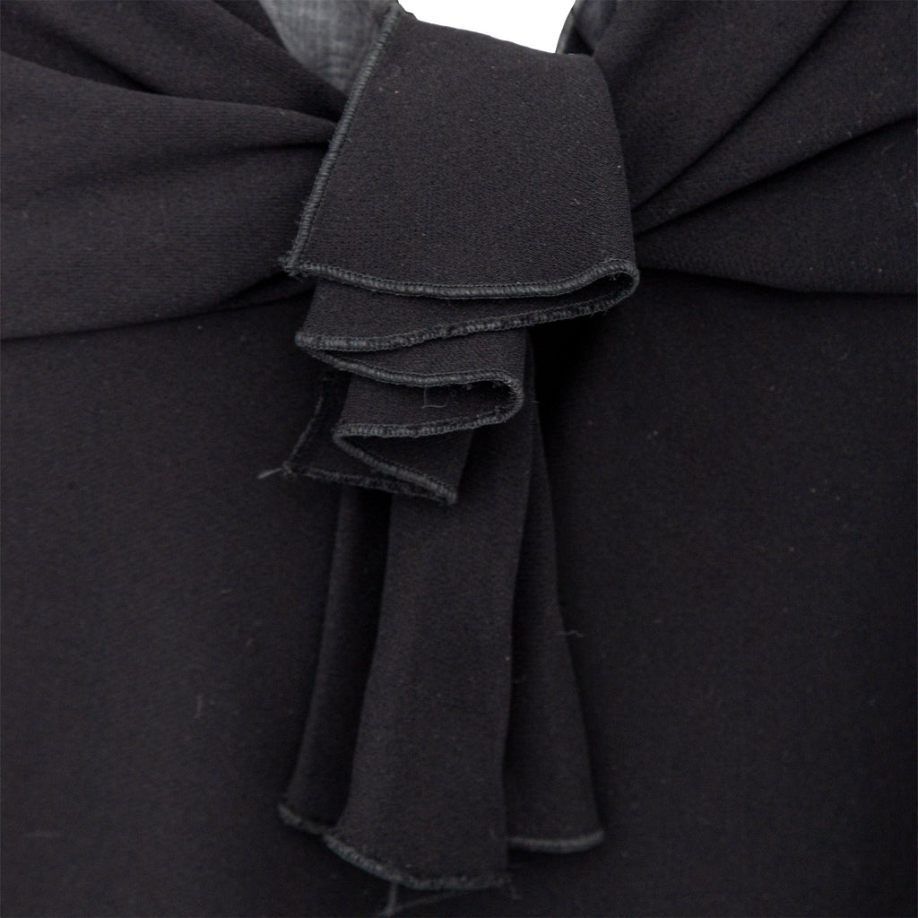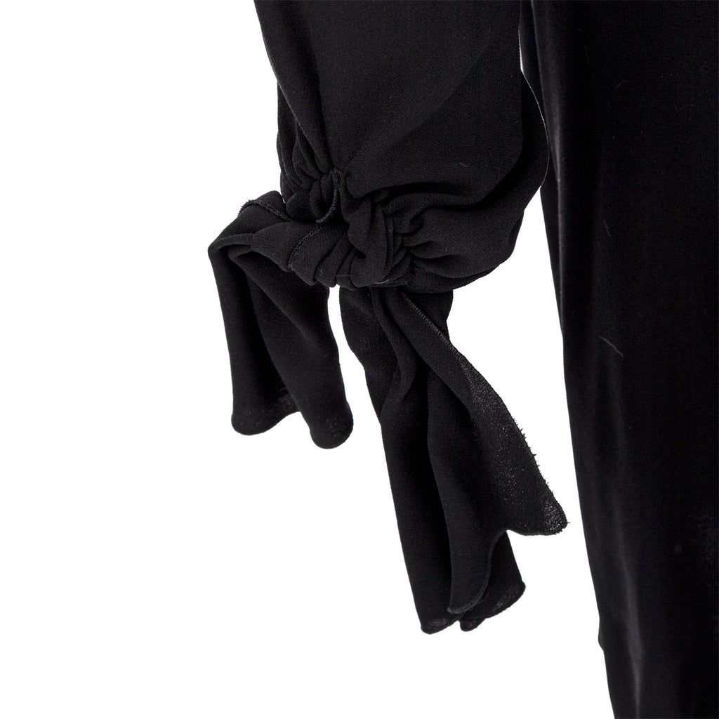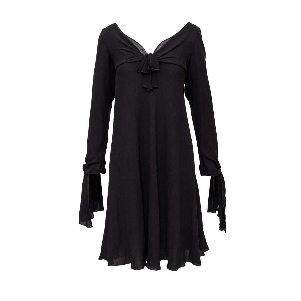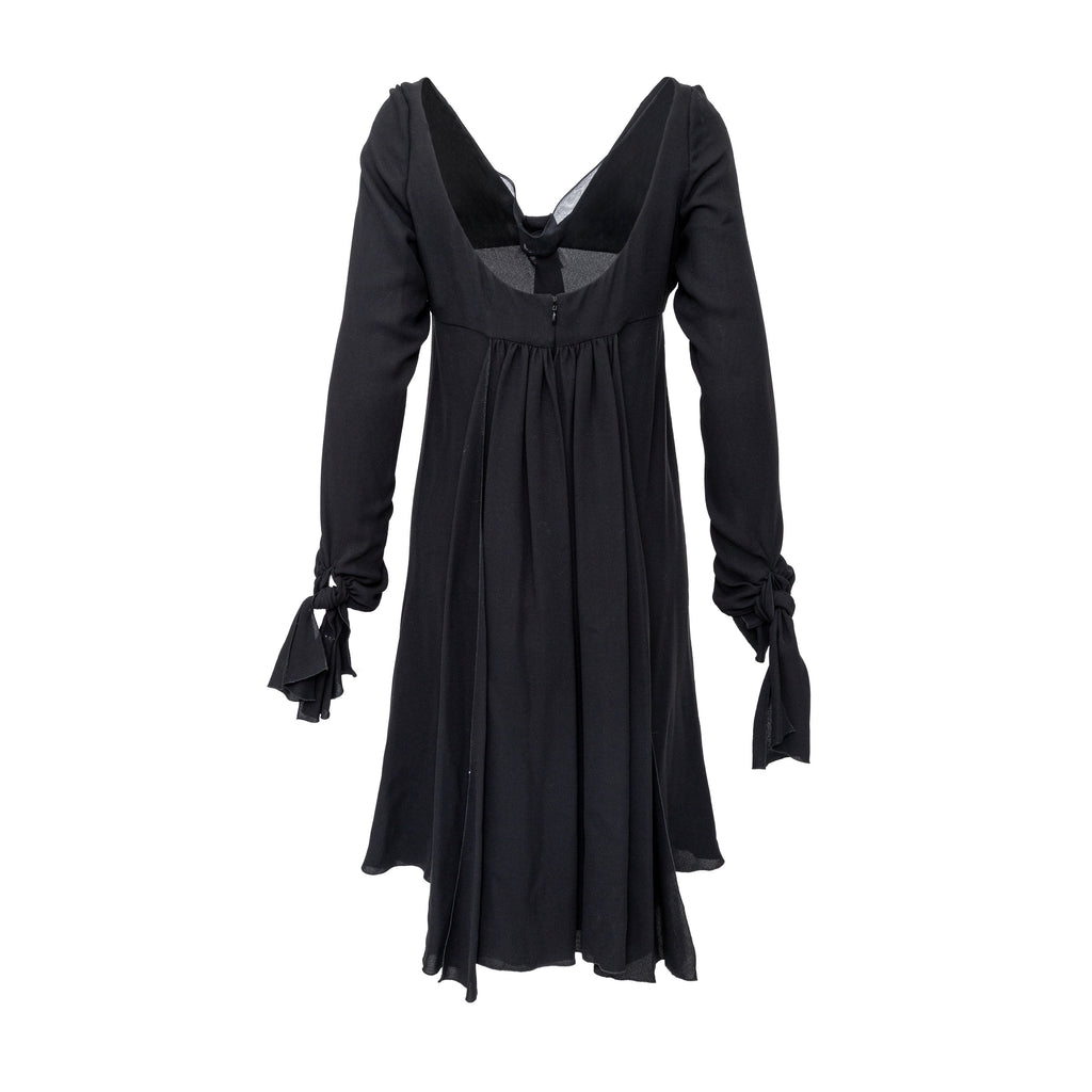 Crafted from soft chiffon silk in black, this vintage dress features a flowy midi silhouette, tie-knot neck, and tassel panel details at the sleeve hems for added elegance.