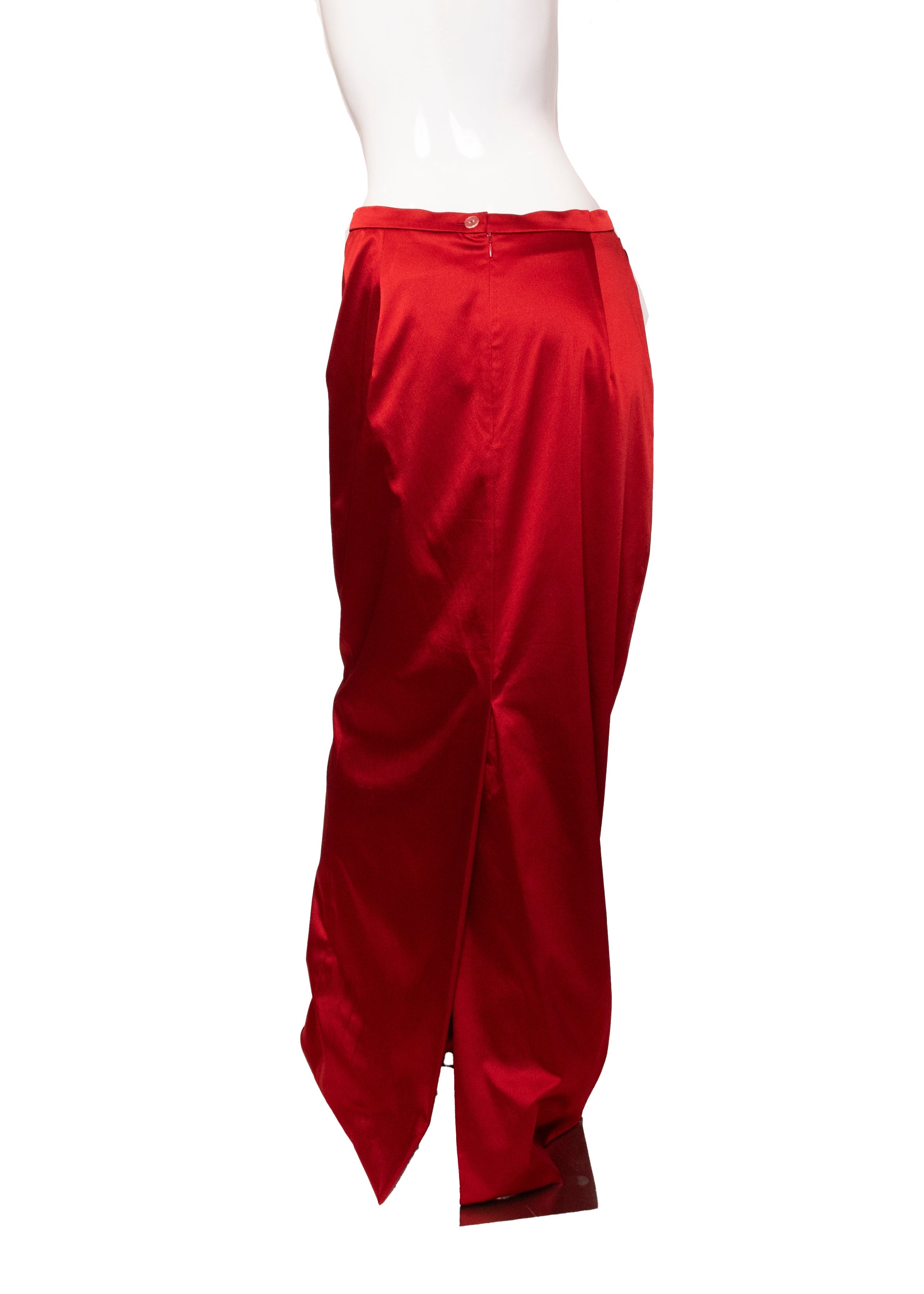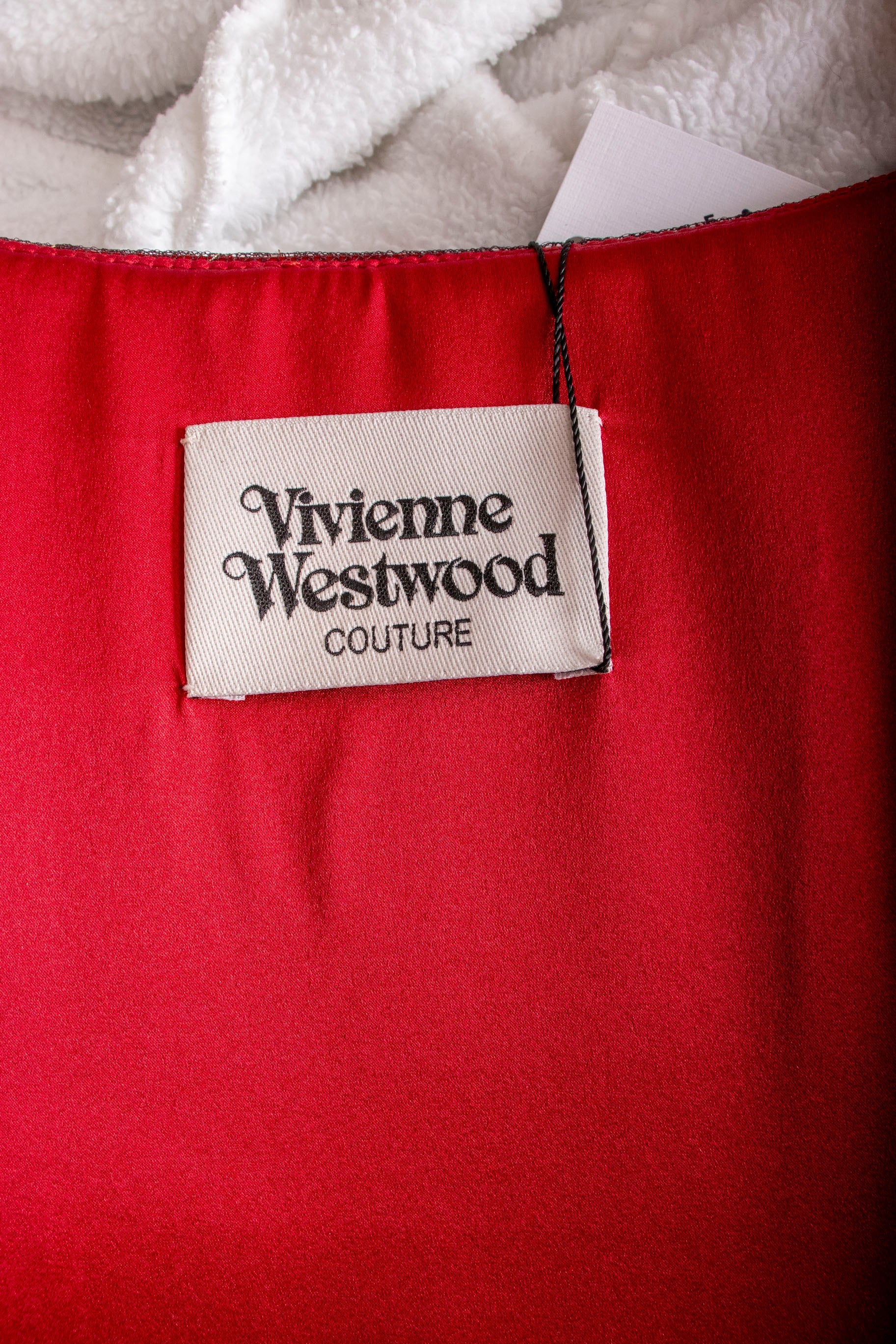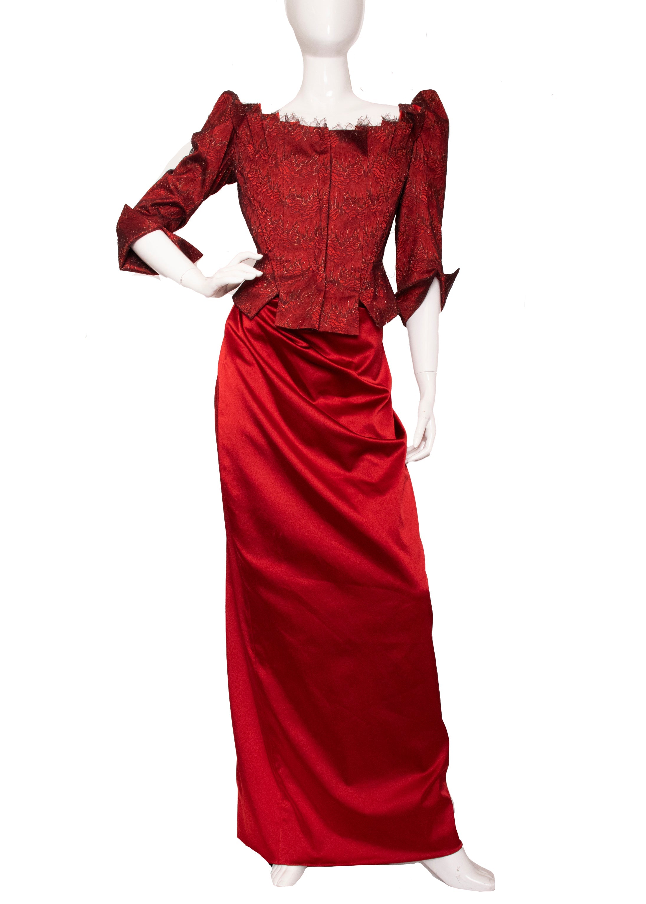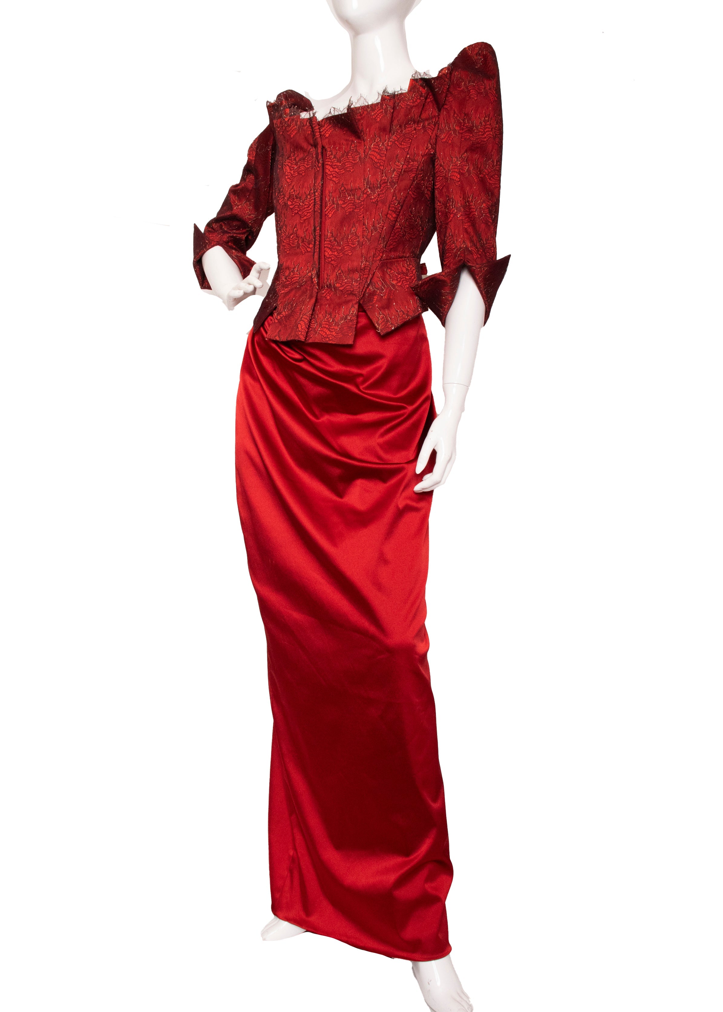 A true collector's piece from the legendary designer's final collection, this striking red corset and skirt ensemble represents timeless couture craftsmanship. The corset features structured boning with a front zip closure, delicate pleated accents, and an elegant bowed back adorned with lace detailing over luxurious scarlet silk satin. The coordinating skirt fastens securely with buttons and zipper for a polished silhouette. Purchased before Ms. Westwood's passing and worn just once, this set remains in pristine condition—a rare opportunity to own a piece of fashion history that celebrates bold elegance and impeccable construction.