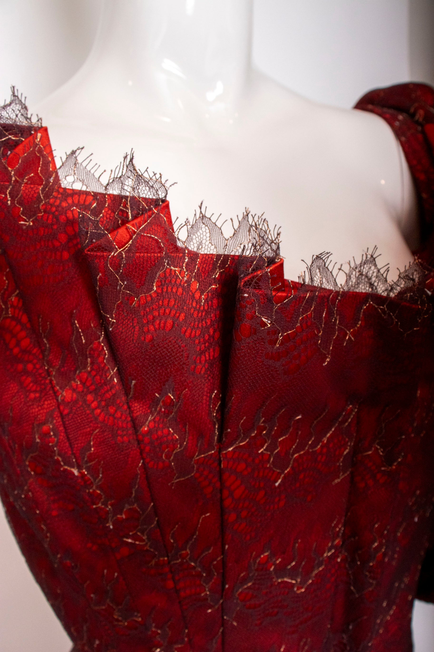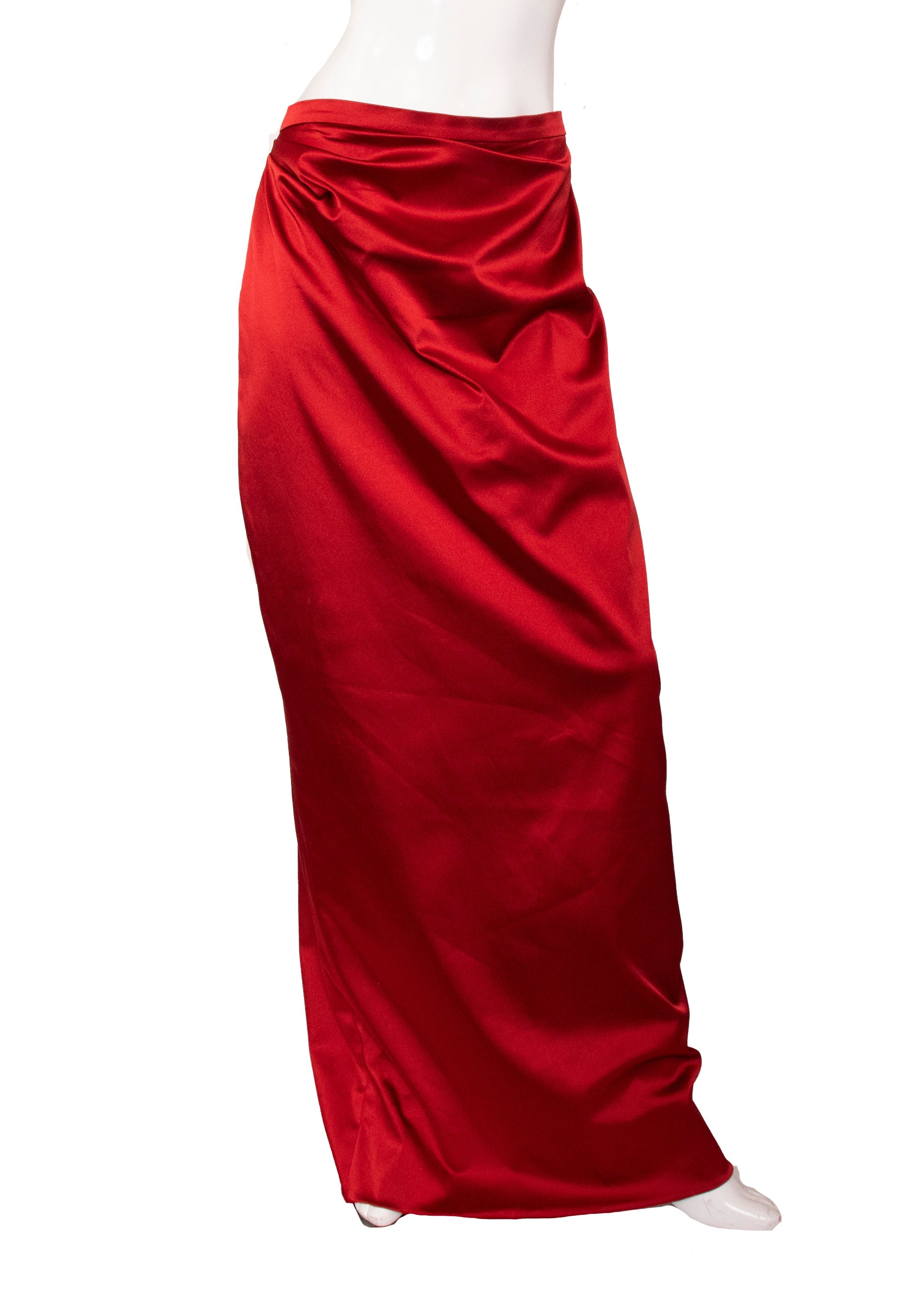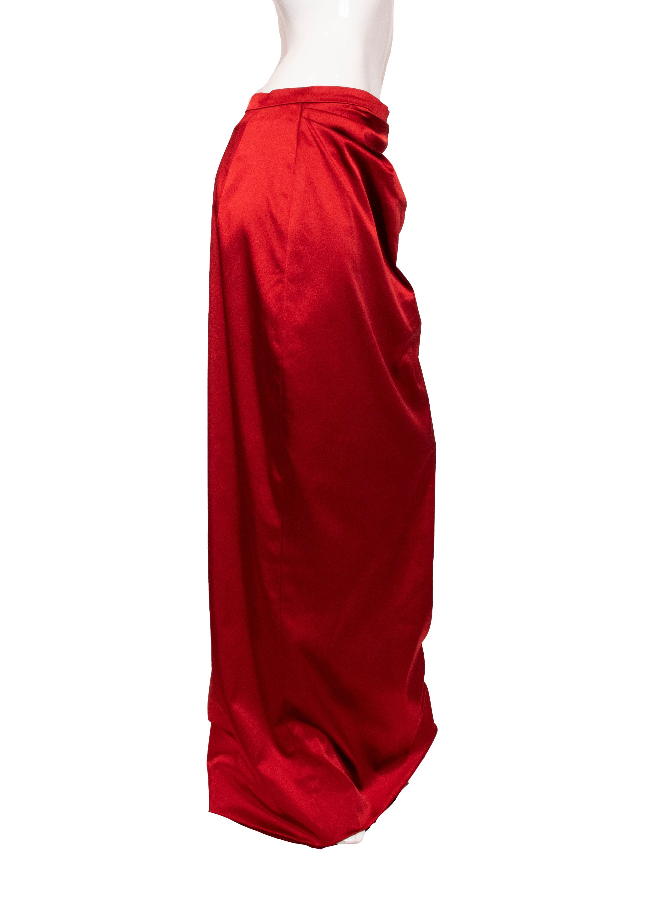 A true collector's piece from the legendary designer's final collection, this striking red corset and skirt ensemble represents timeless couture craftsmanship. The corset features structured boning with a front zip closure, delicate pleated accents, and an elegant bowed back adorned with lace detailing over luxurious scarlet silk satin. The coordinating skirt fastens securely with buttons and zipper for a polished silhouette. Purchased before Ms. Westwood's passing and worn just once, this set remains in pristine condition—a rare opportunity to own a piece of fashion history that celebrates bold elegance and impeccable construction.