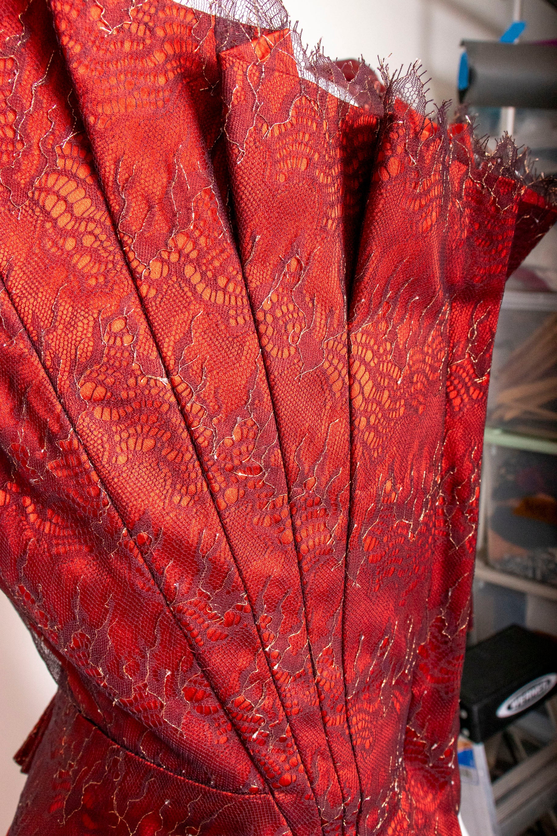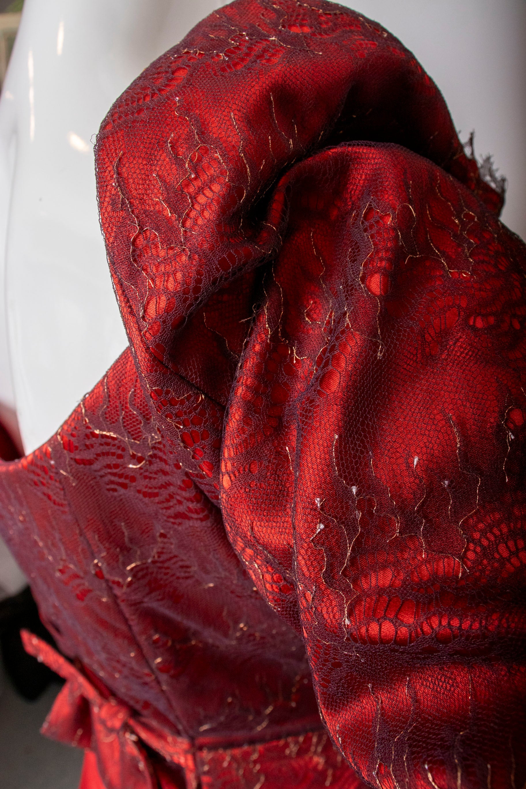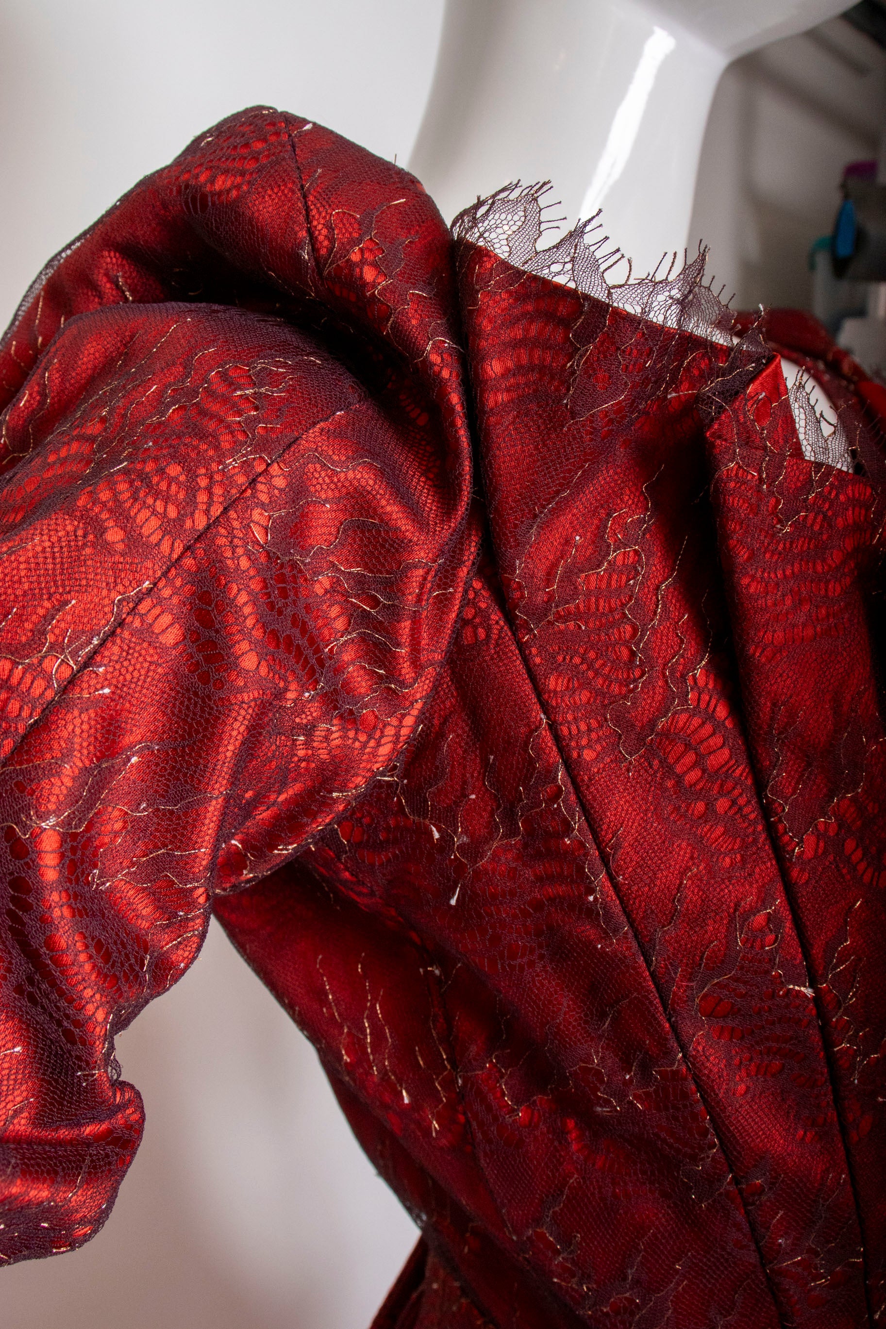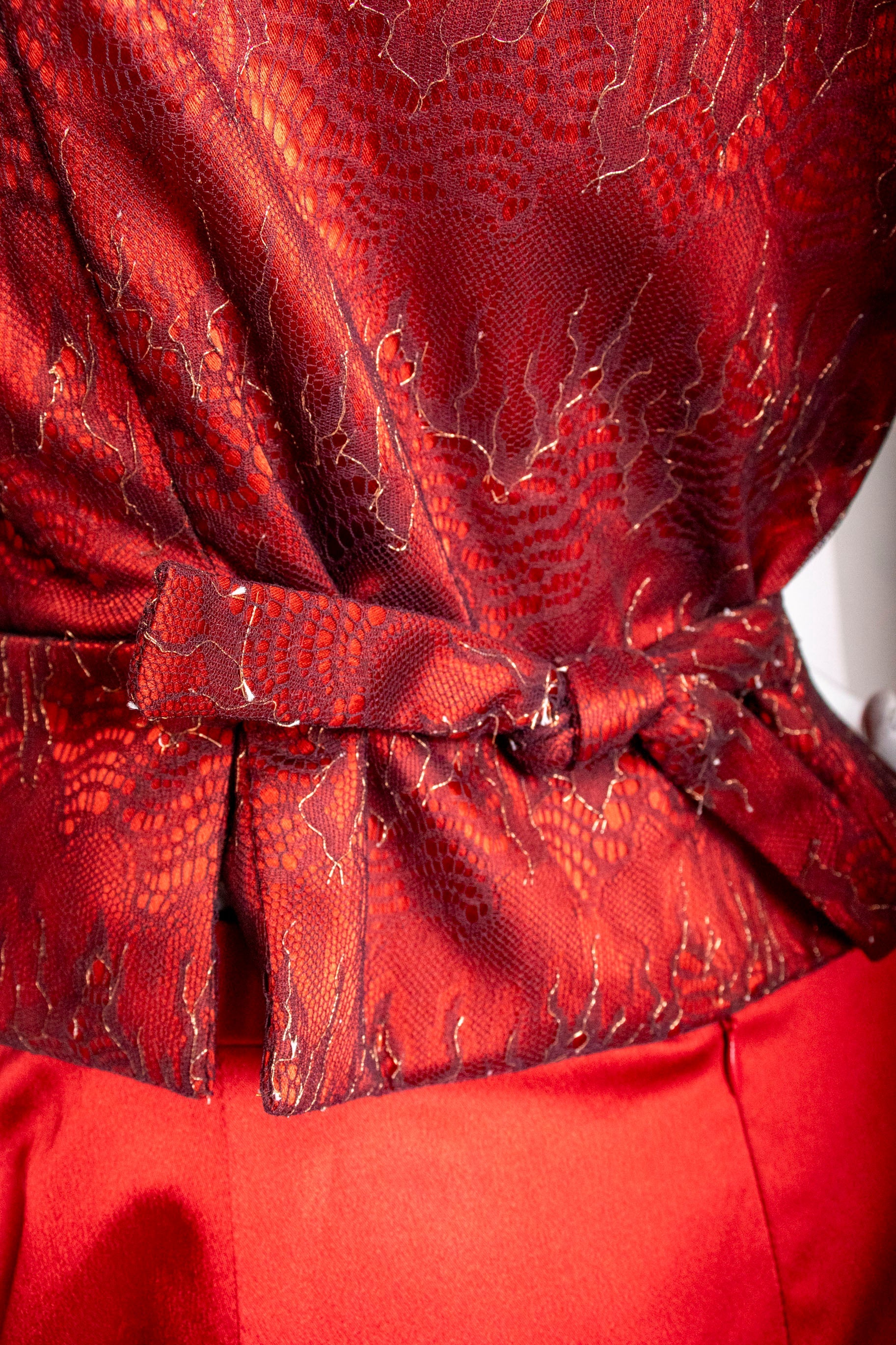 A true collector's piece from the legendary designer's final collection, this striking red corset and skirt ensemble represents timeless couture craftsmanship. The corset features structured boning with a front zip closure, delicate pleated accents, and an elegant bowed back adorned with lace detailing over luxurious scarlet silk satin. The coordinating skirt fastens securely with buttons and zipper for a polished silhouette. Purchased before Ms. Westwood's passing and worn just once, this set remains in pristine condition—a rare opportunity to own a piece of fashion history that celebrates bold elegance and impeccable construction.