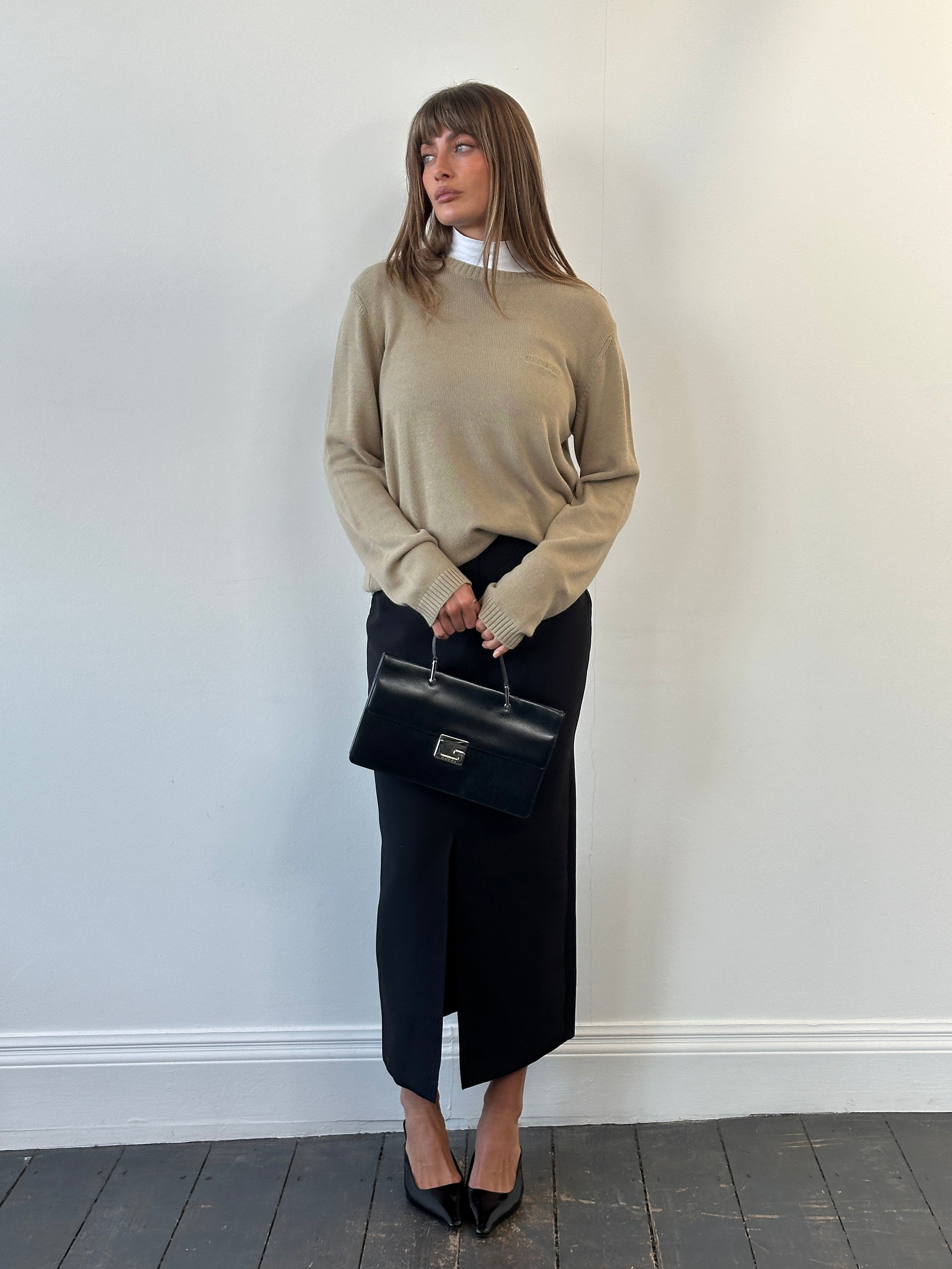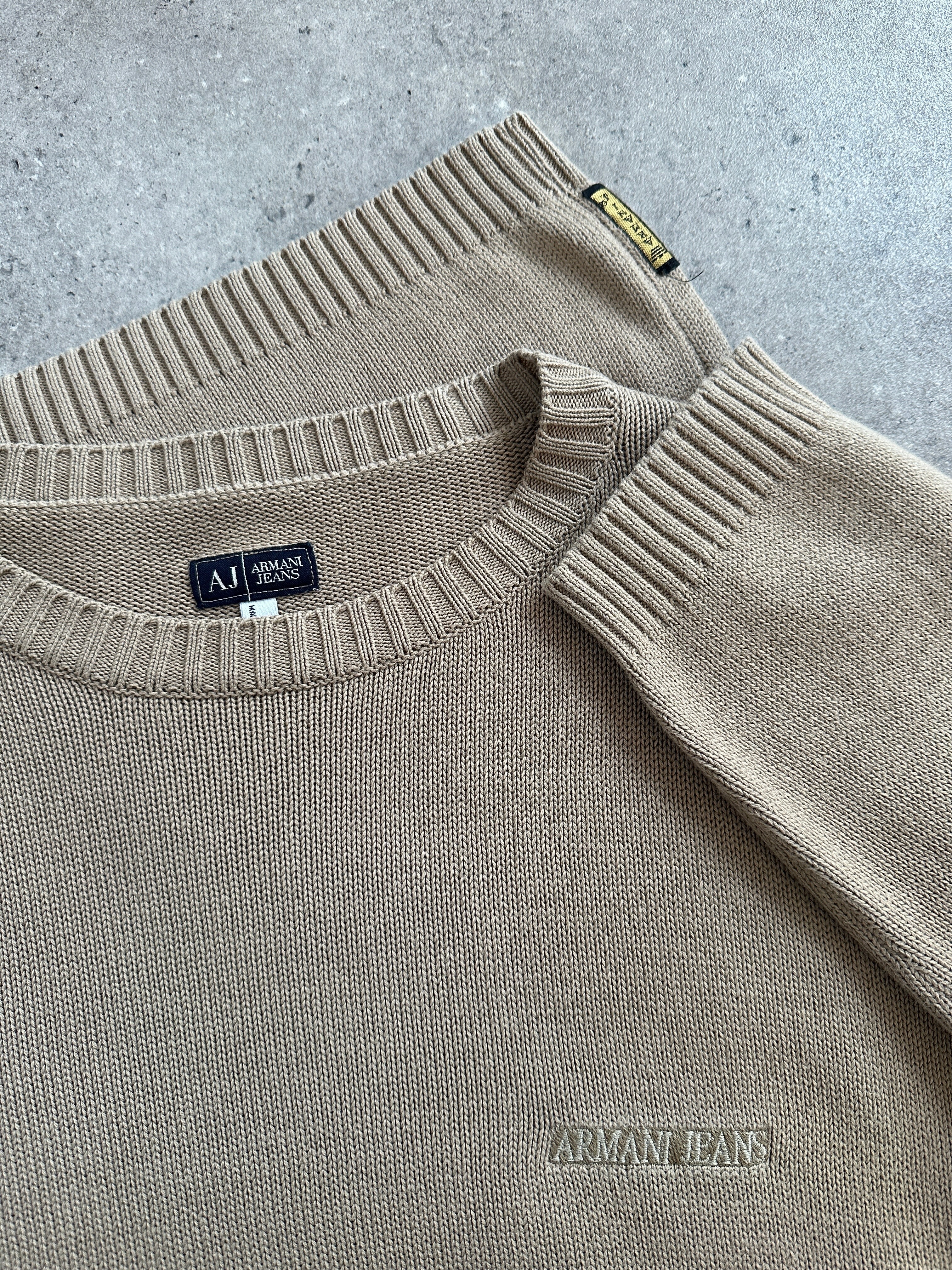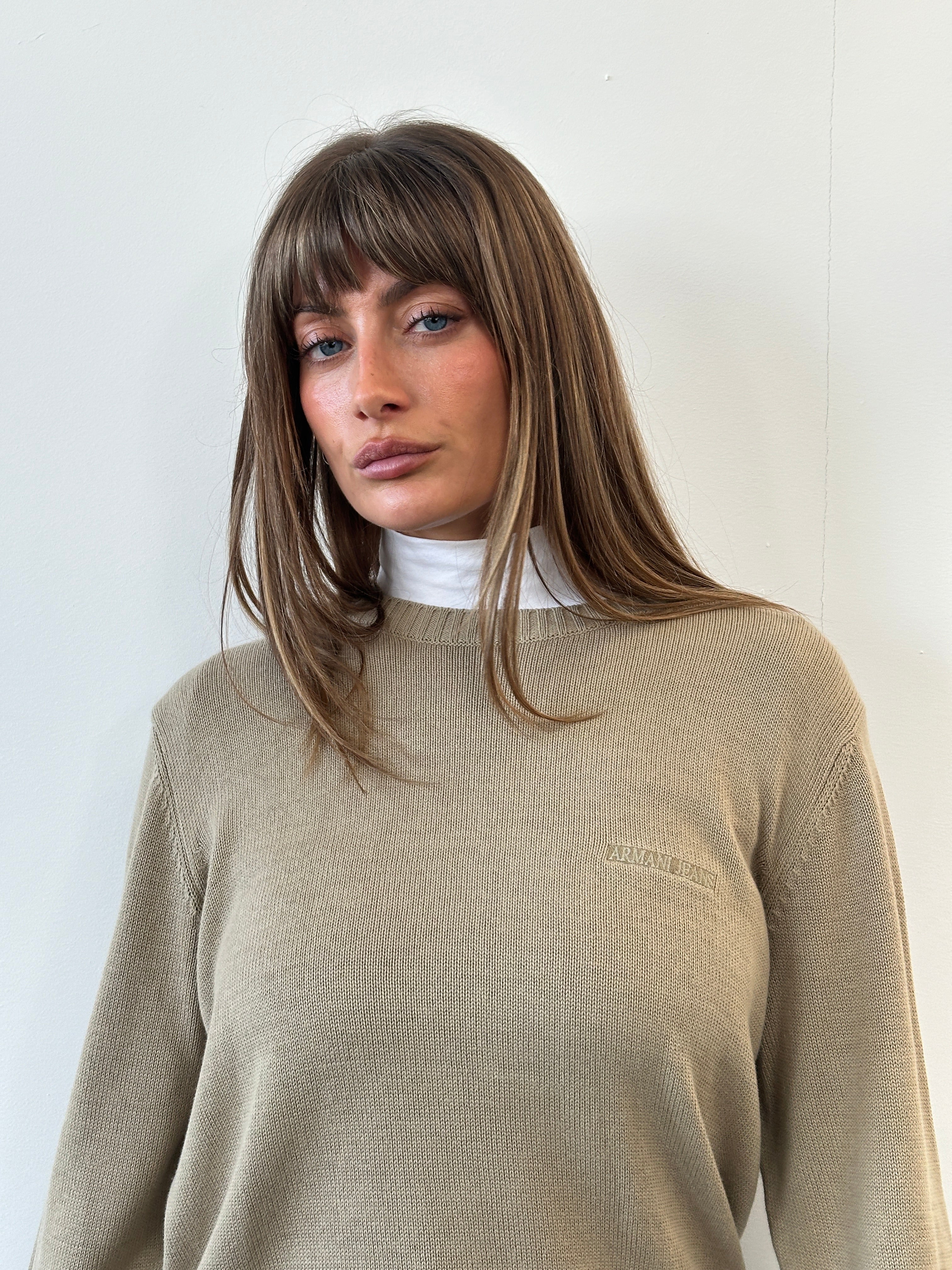 Vintage minimal 1990s Armani Jeans knitted jumper in a soft beige tone with subtle chest logo embroidery. A clean and versatile knit made in Italy with a classic quiet luxury feel.