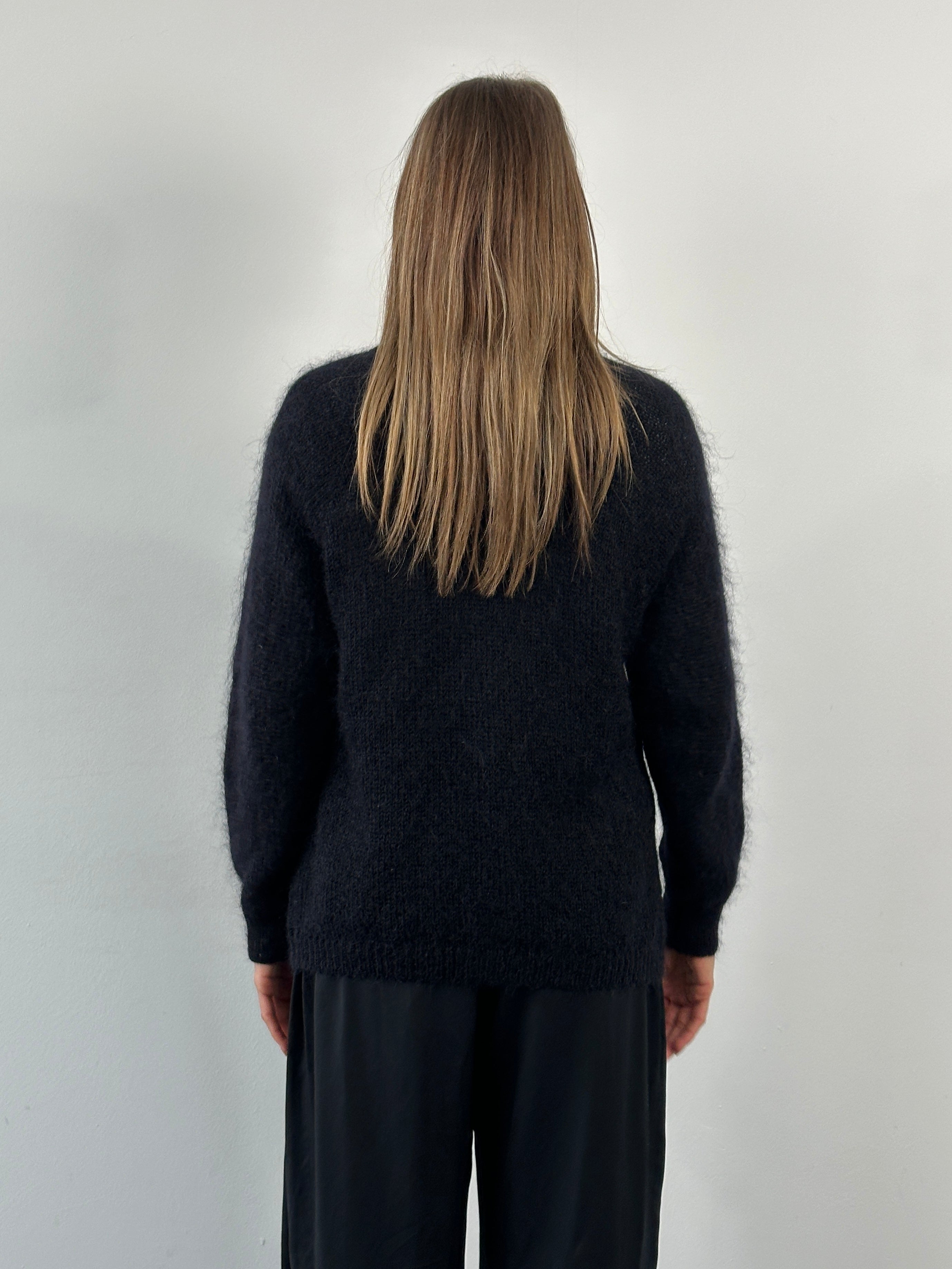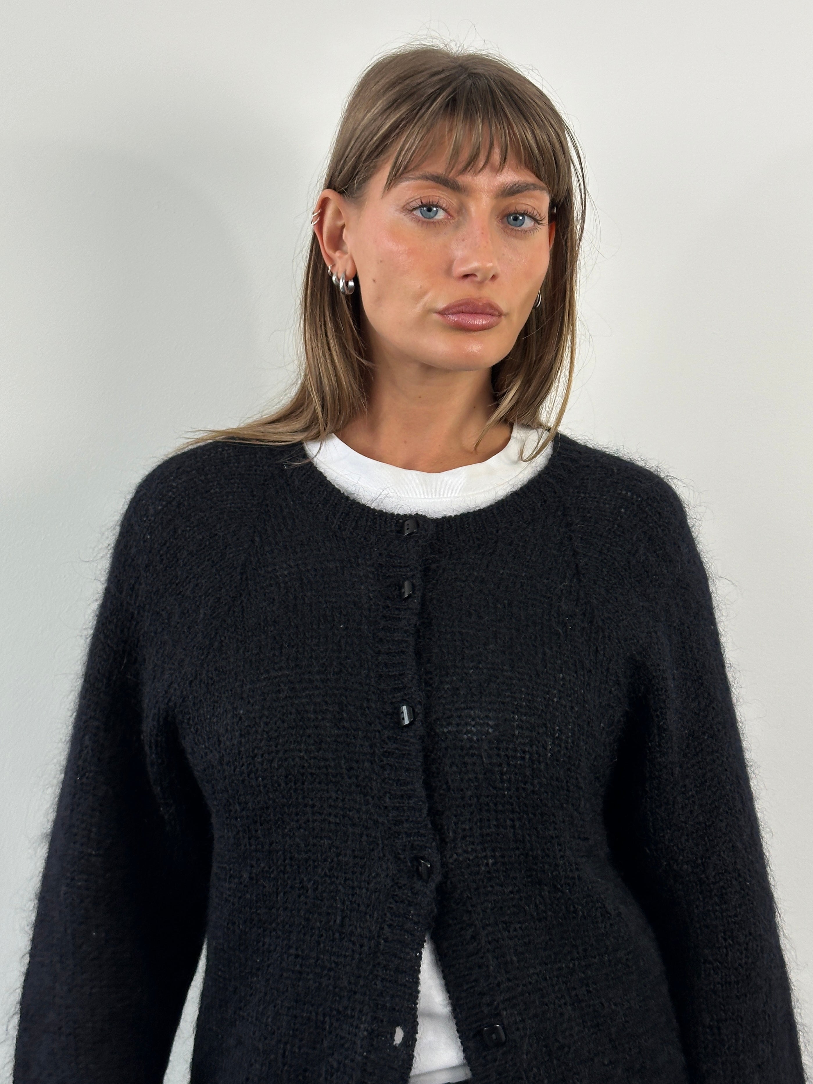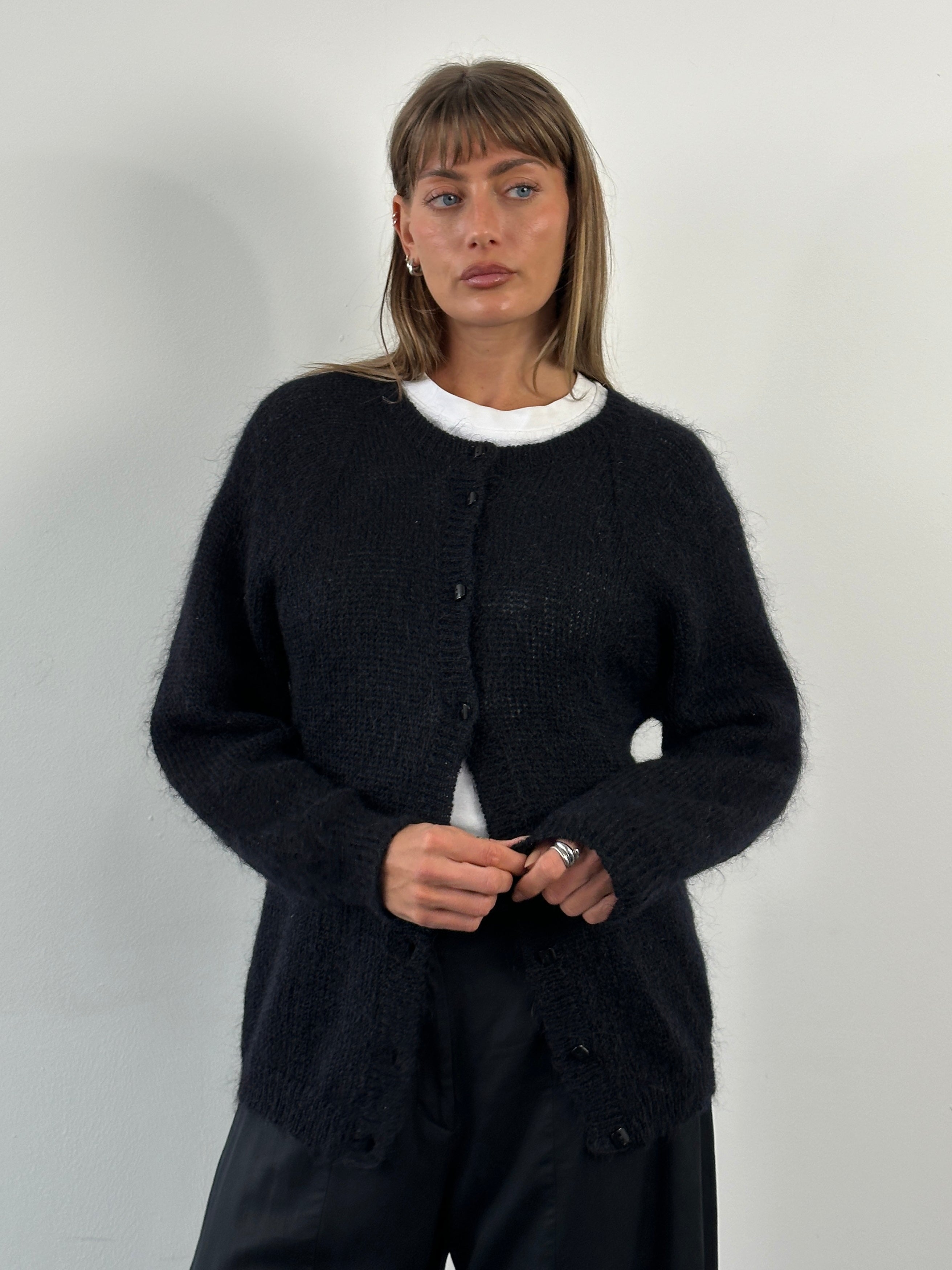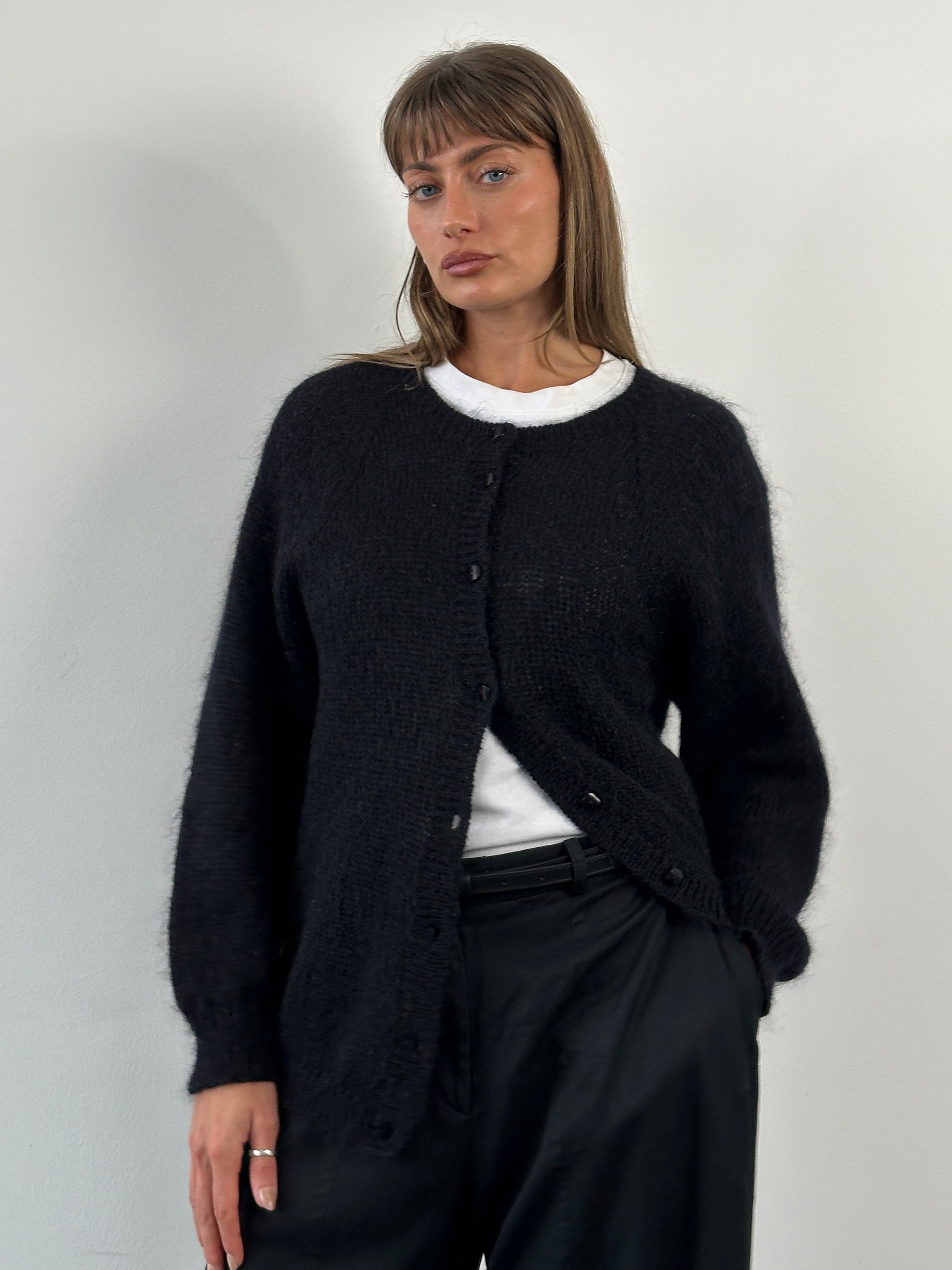 A vintage black cardigan with a soft mohair-blend handle, featuring a clean collarless neckline and classic square button fastening. A timeless layering piece with subtle texture and an understated silhouette typical of late 1990s British knitwear.
