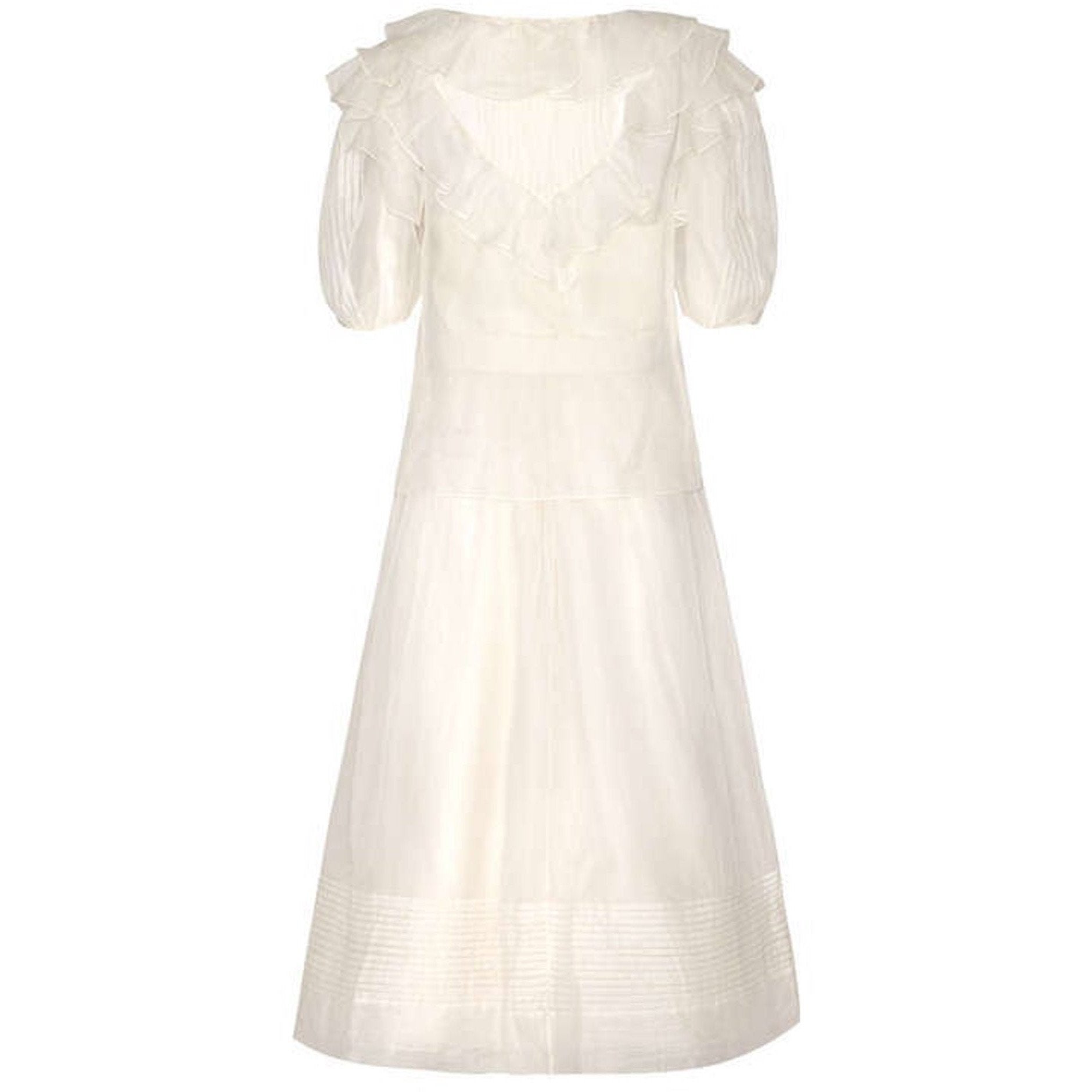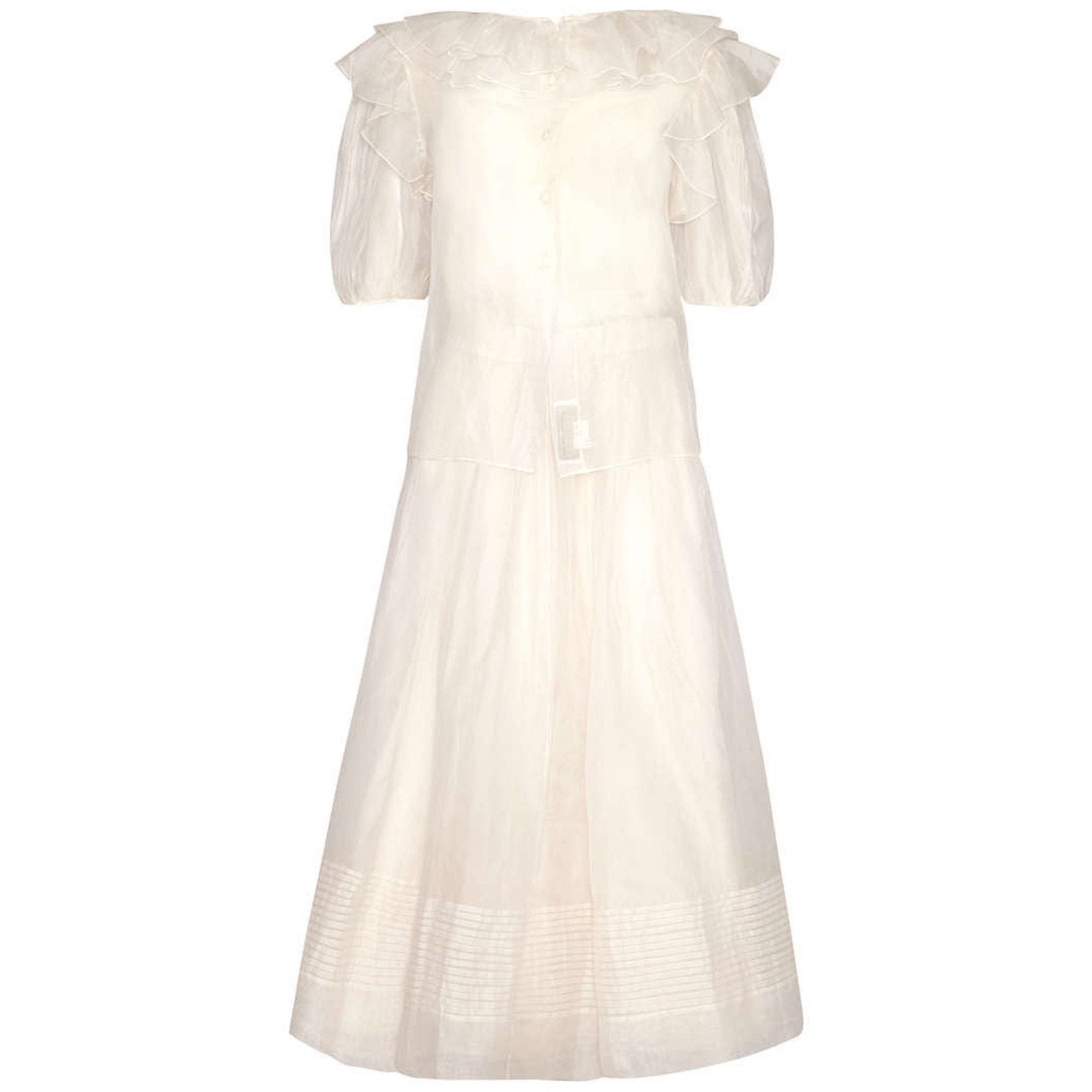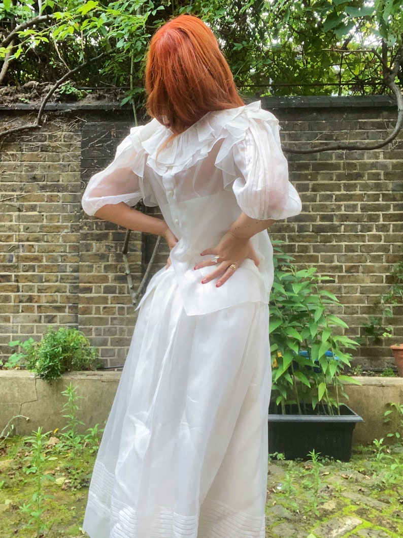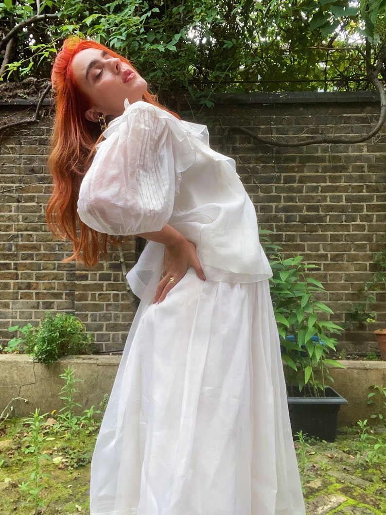 Lovely and summery 1970s white silk organza set from Gina Fratini consisting of a maxi skirt and short-sleeved blouse. The set also comes with a little camisole to wear under the blouse and the skirt is fully lined. The set features pretty pin tucking and frill details and can be worn together or separately. With little covered buttons to fasten at the back of the blouse this is a really pretty ensemble for any occasion. Would make a perfect bridal ensemble as all pieces are in excellent vintage condition with no faults to note. Would fit up to US size 8, UK Size 12.