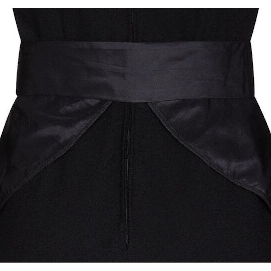 This dramatic Nina Ricci 1980s cocktail dress is silk lined with a black wool crepe overlay and a silk taffeta peplum. The peplum unfolds in soft pleats and graduates in a descending V-shape from the centre reverse at the waist and finishing at the centre front of the skirt at the hem. Pleats are stitched down towards the waistband to flatter the navel, before falling open at the front to reveal the crepe pencil-style underskirt. This showpiece is consolidated perfectly by a large taffeta bow that embellishes the accompanying sash to be worn around the waist. A sharply plunging V neckline on the bodice echoes the form of the skirt, and neatly stitched pleats atop of each shoulder accentuate the puff shoulder detail. This piece is beautifully constructed with ribbon finishing on the hems and cuffs, and interior hook and eye fastenings to further shape the waistline. There is a central zip fastening at the reverse. In superb condition, would best fit US size 2-4, UK size 6-8.