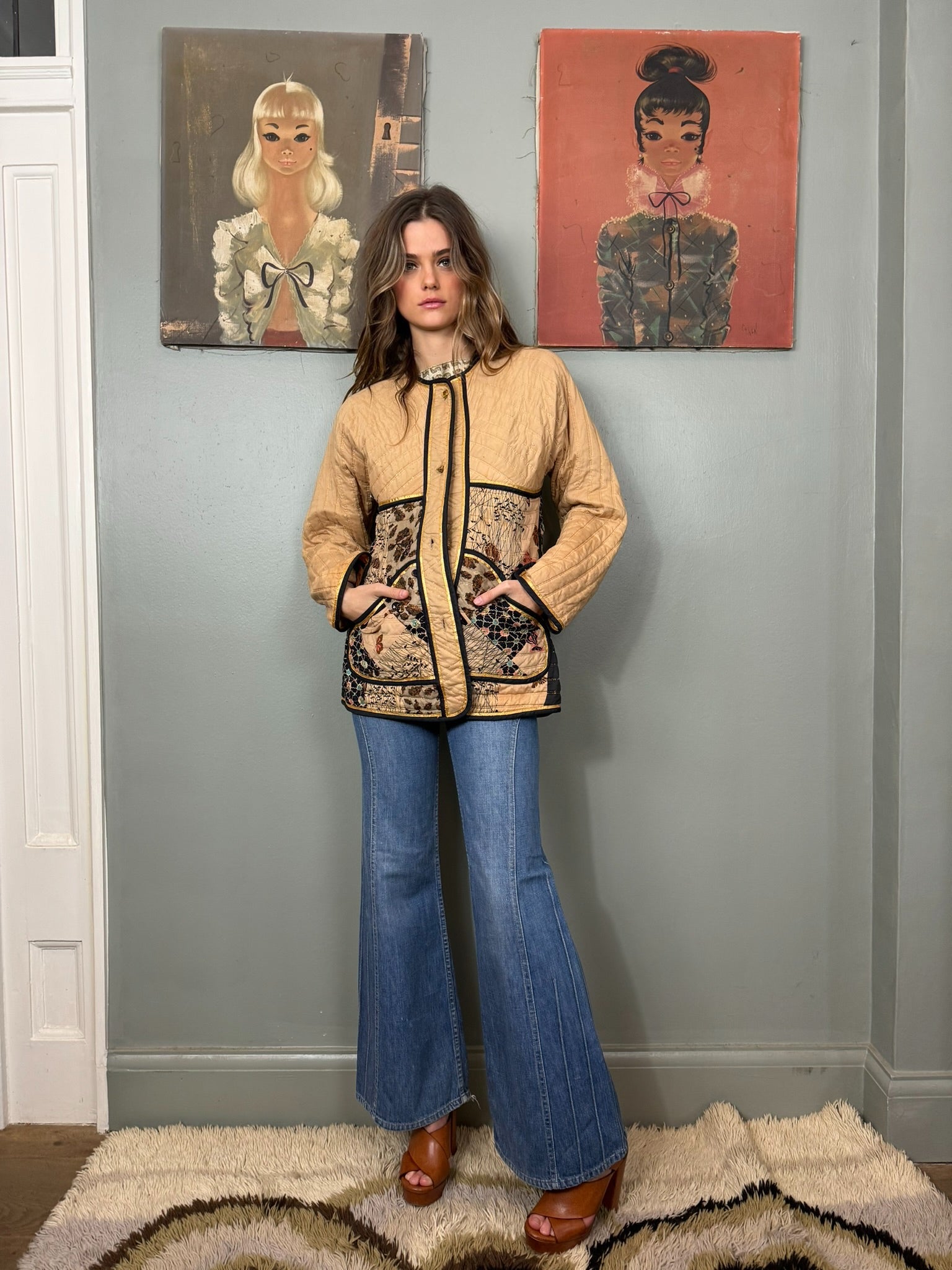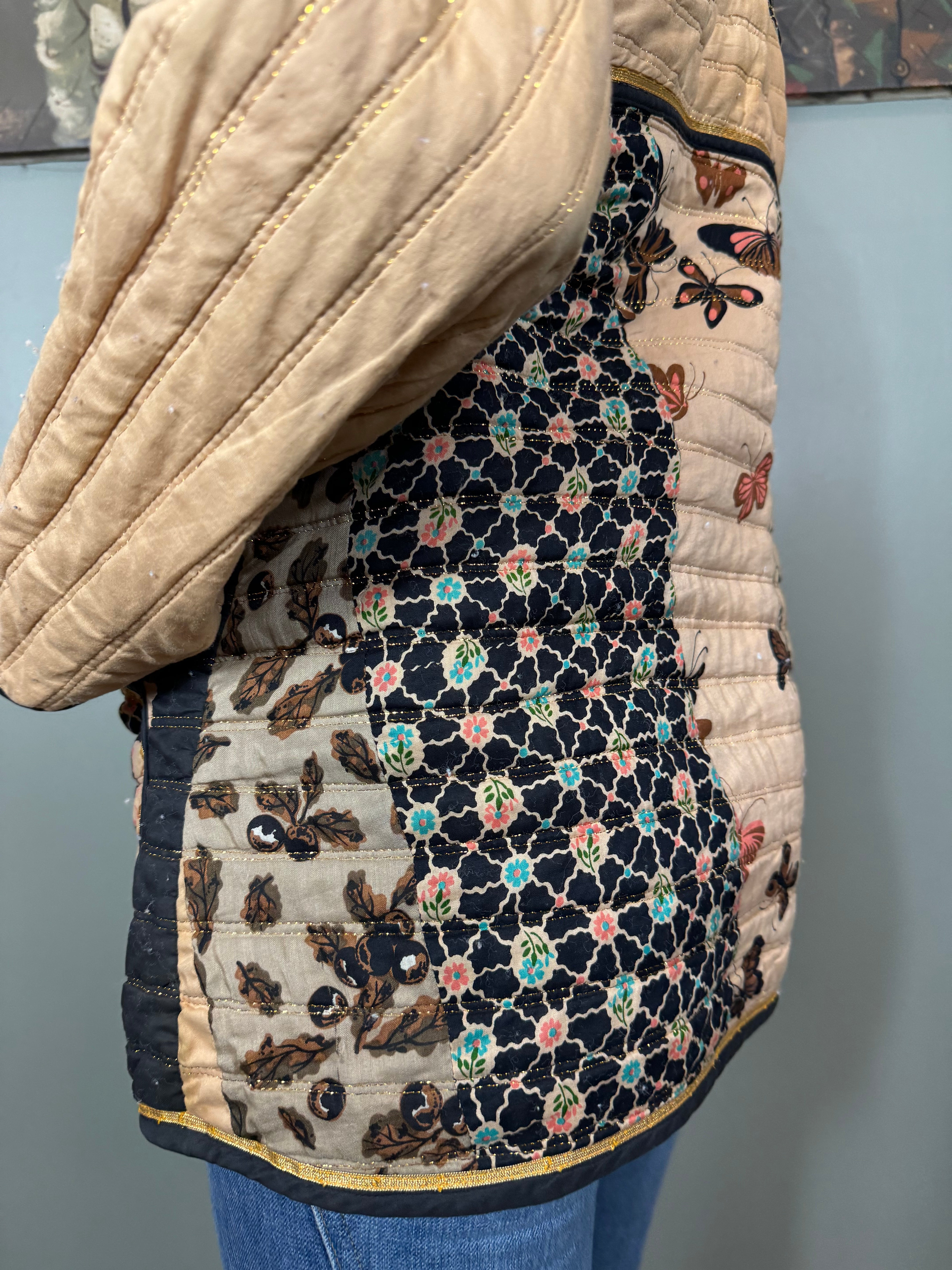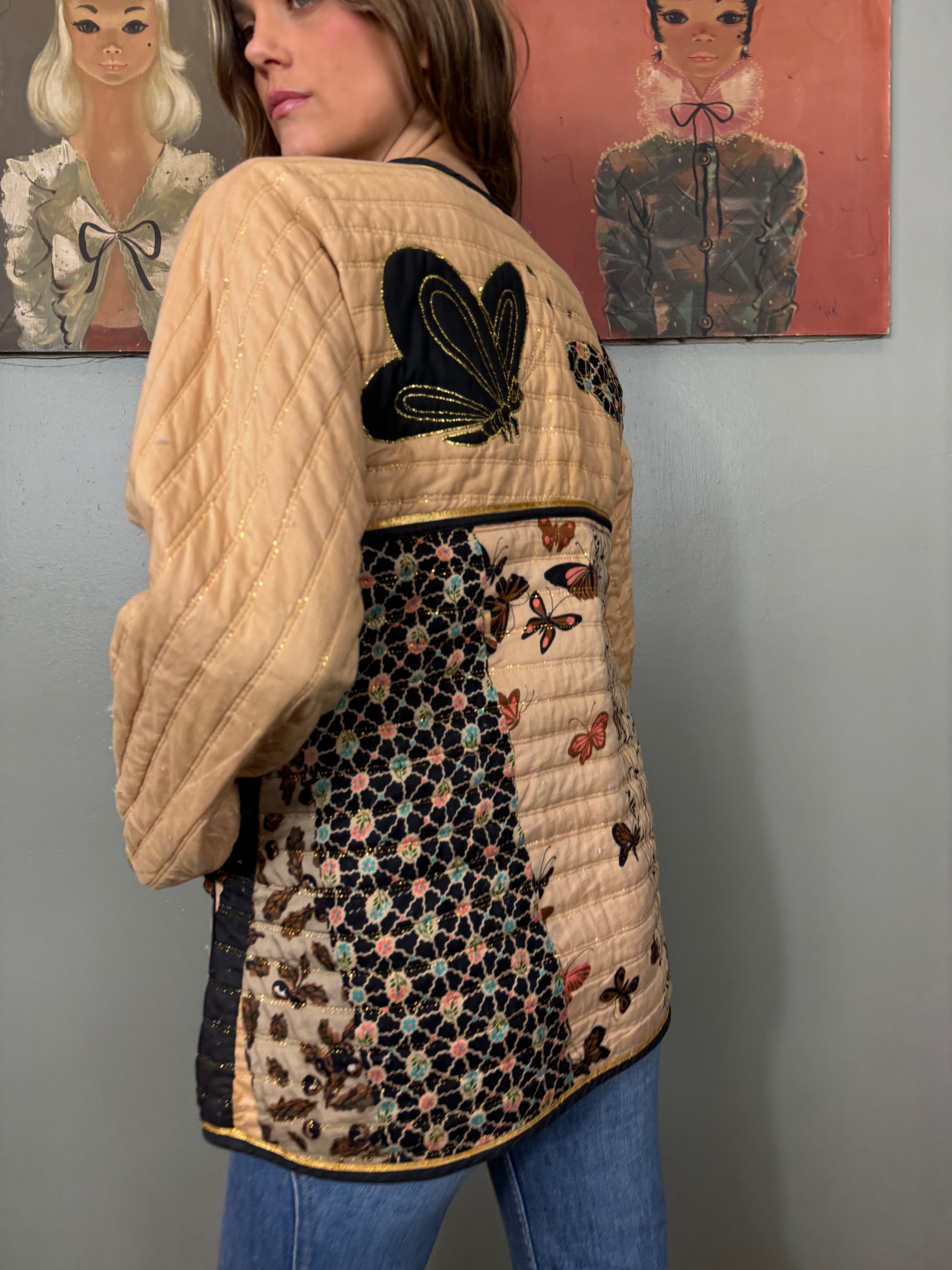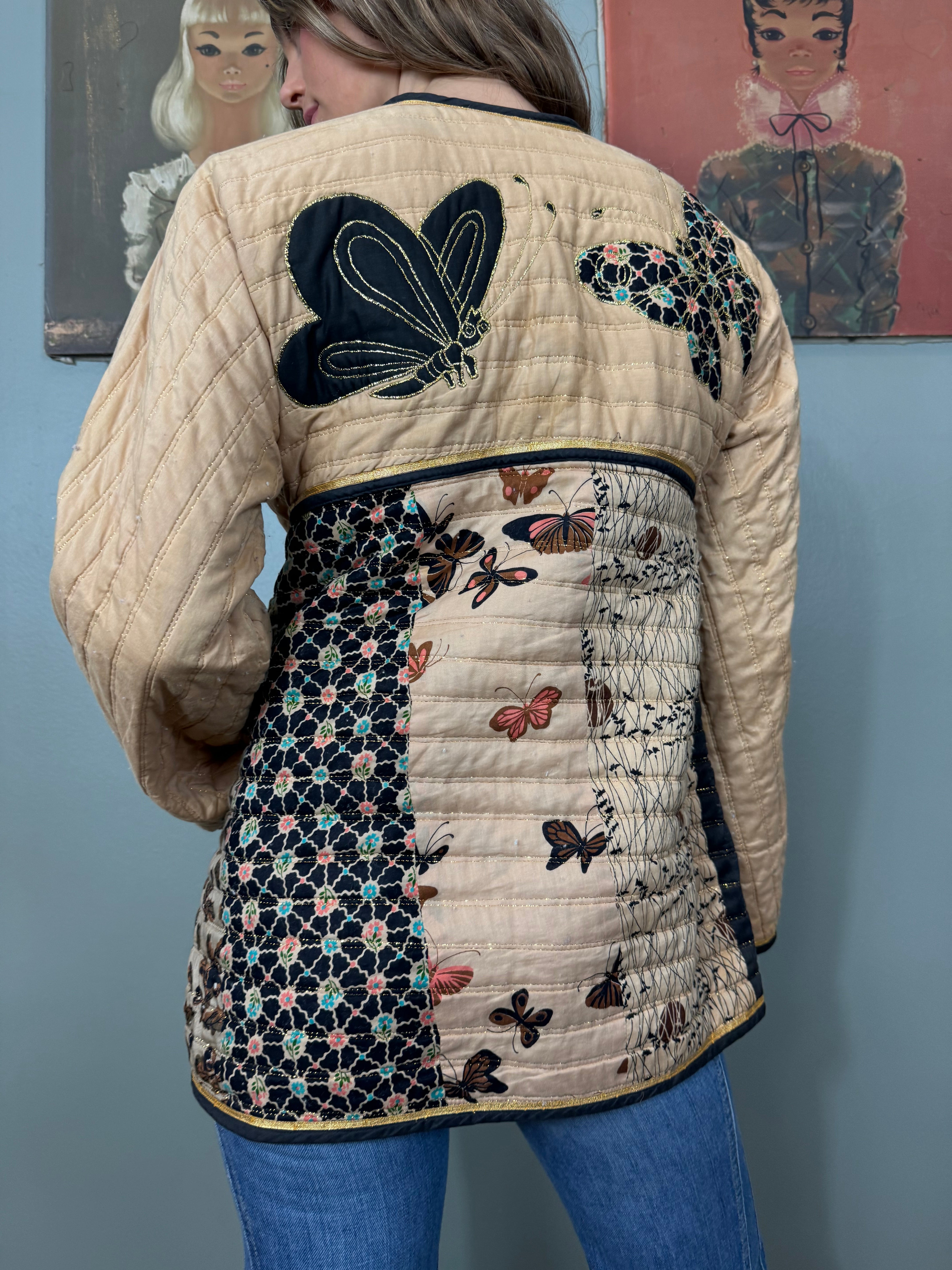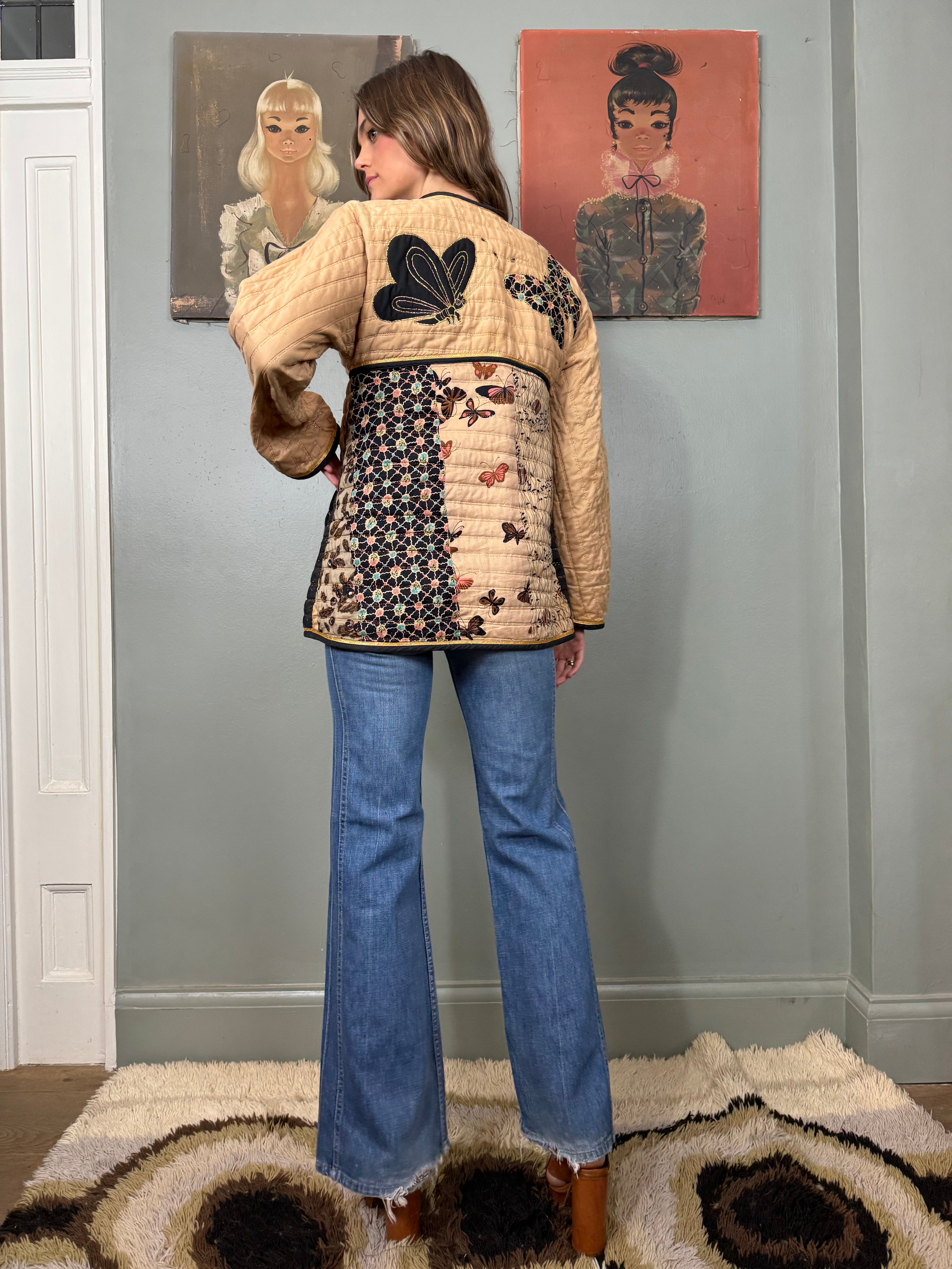 Elevate your style with this 70s quilted jacket. Featuring beautiful butterfly appliqués and a unique print, has side pockets, a straight fit and jewel buttons. This jacket is perfect for adding a touch of retro charm to your wardrobe. With long sleeves for warmth and a cool design, this jacket is a must-have for any season.