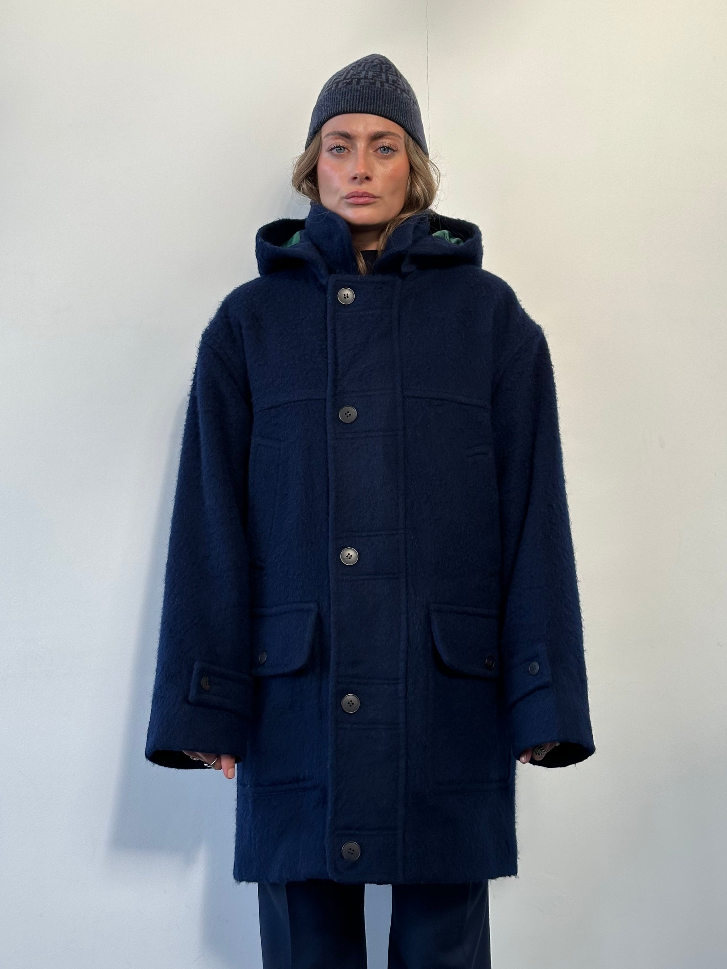 Yves Saint Laurent Sportswear late 1980s navy brushed wool coat with removable hood and quilted green lining embroidered with YSL’s multicolour logo.