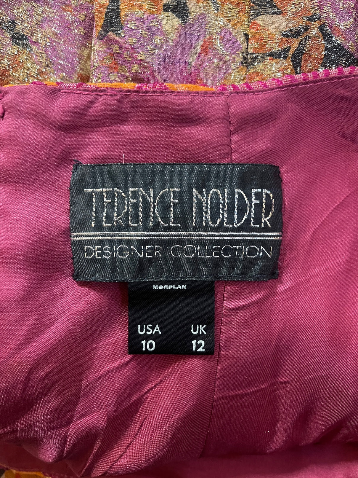 Notes on Designer: Terence Nolder was a distinguished British fashion designer celebrated for his luxurious and highly collectible eveningwear throughout the 1970s and 1980s. After taking over design duties at the legendary London label Quorum in the late 1970s — a house previously associated with figures such as Ossie Clark and Alice Pollock — Nolder reinvigorated its reputation with refined tailoring, opulent fabrics, and bold yet elegant silhouettes that epitomised high-end British couture. His work earned significant industry recognition, including the British Eveningwear Designer of the Year Award in 1980 and the British Designer of the Year Award in 1981.