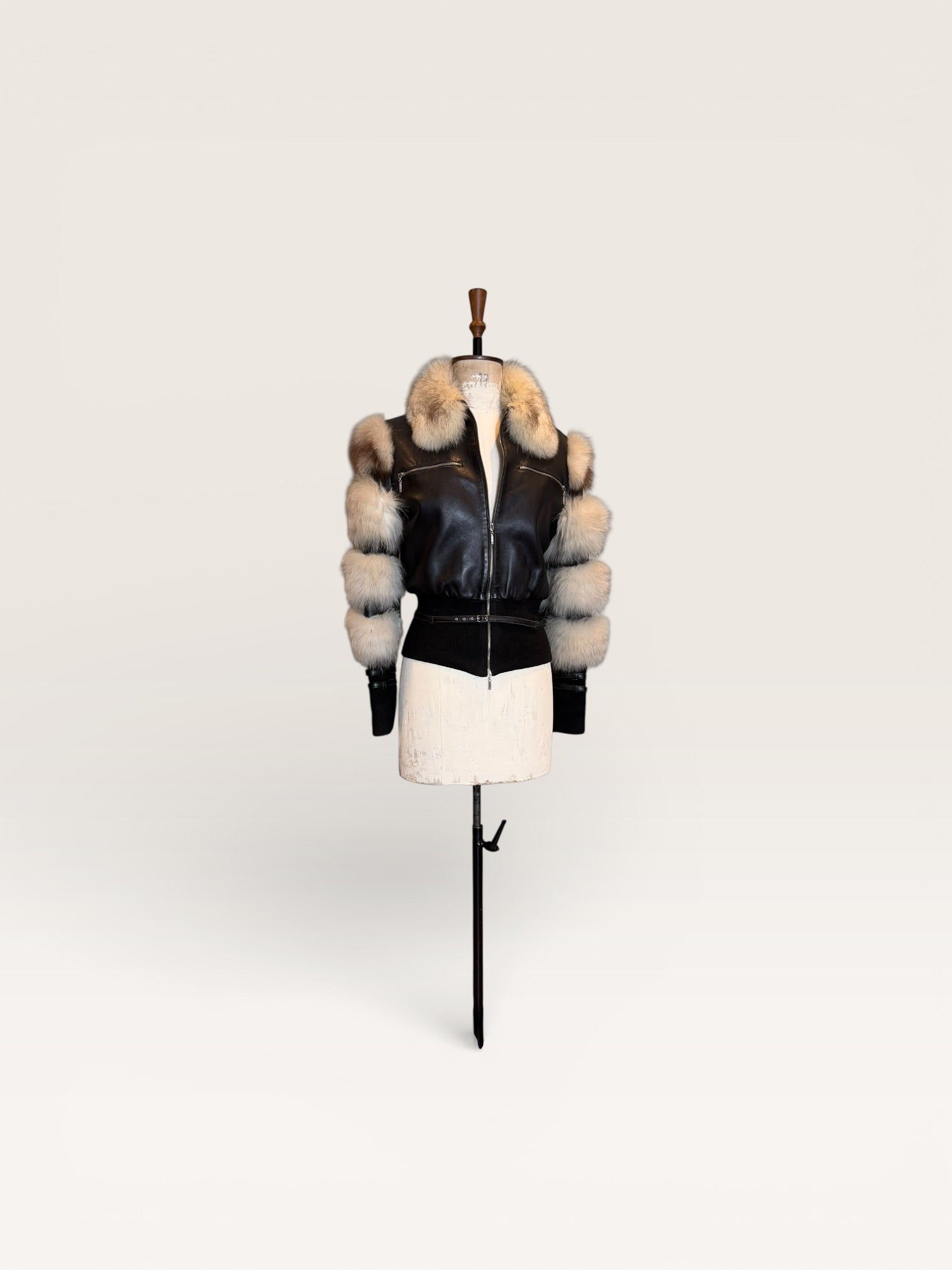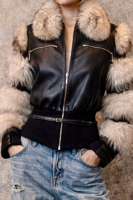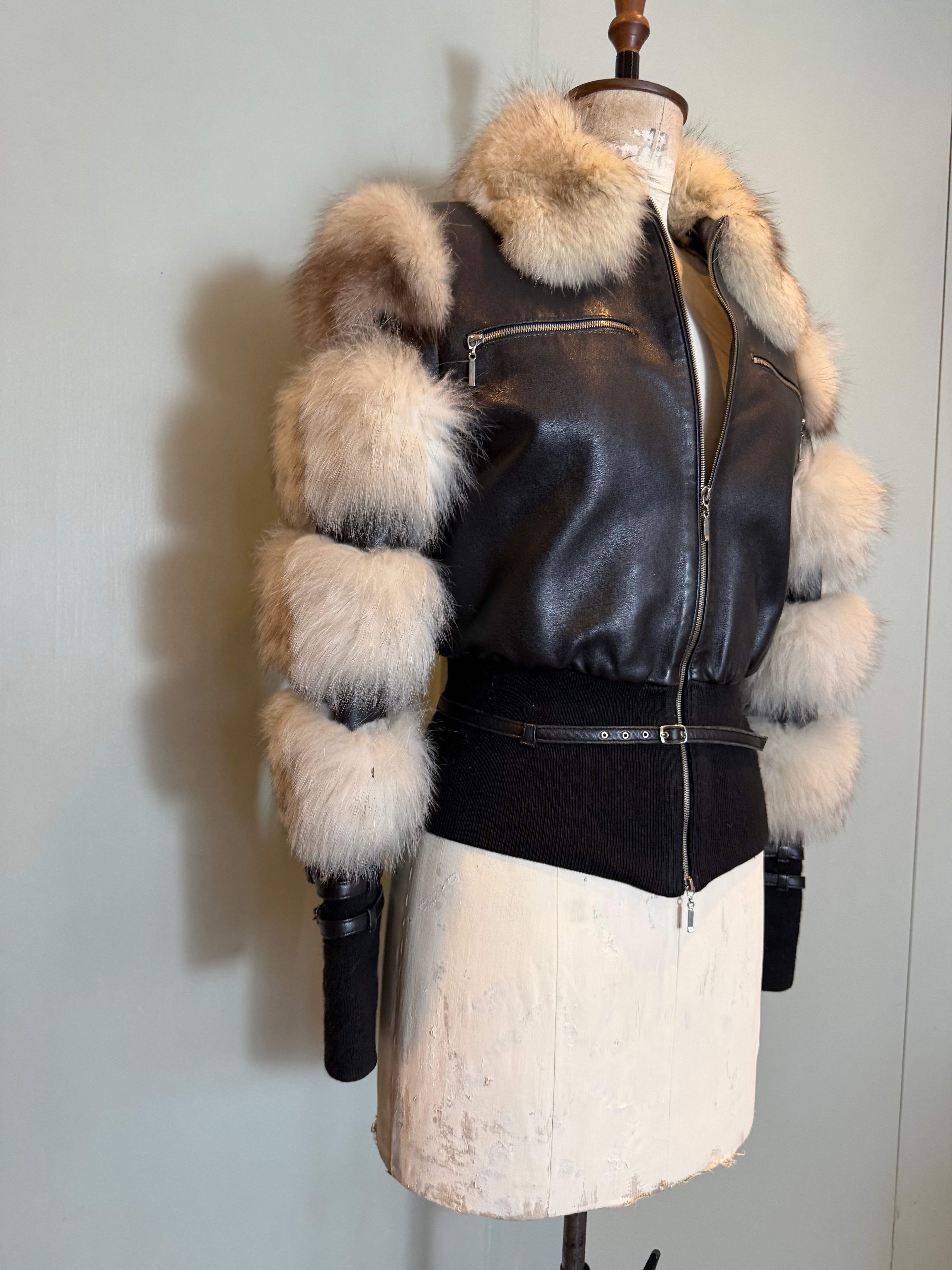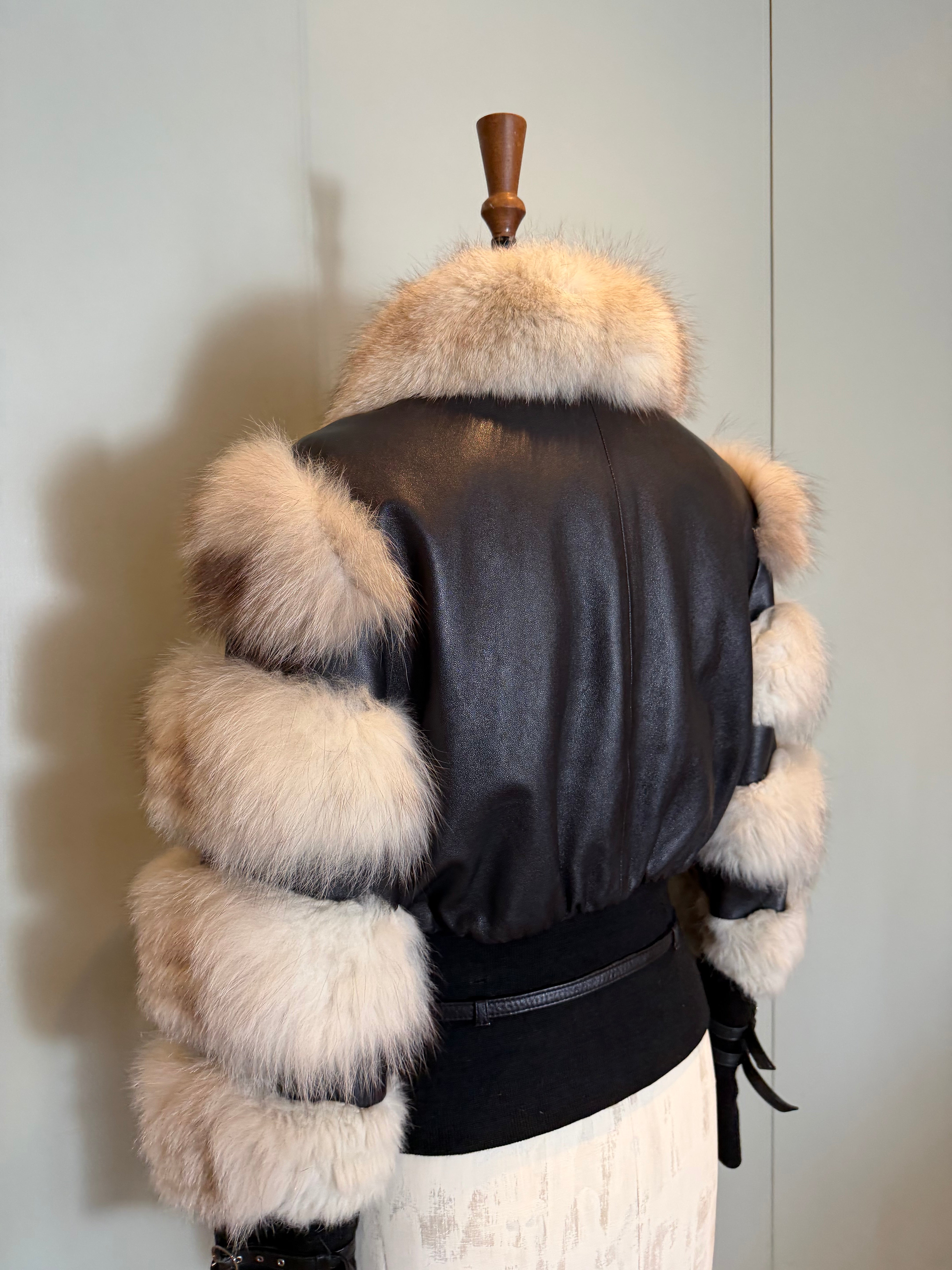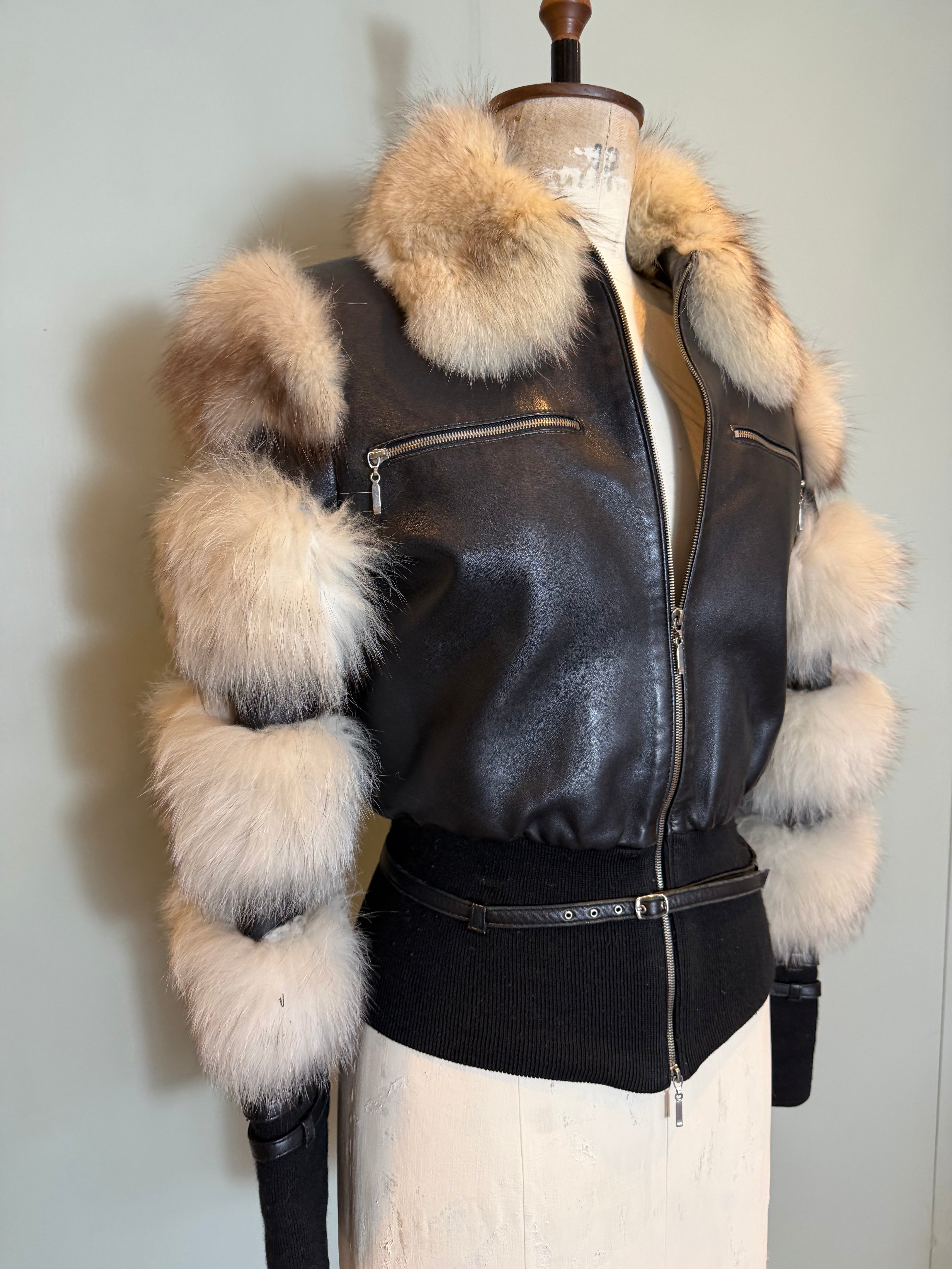 This exceptional 70s black leather and fox fur belted jacket is an original bomber-style piece notable for its unique design. Constructed from high-quality black leather, it features a knit waistband for comfort and a front zipper for ease of wear. The long sleeves, crafted from arctic fox and leather panels, enhance warmth and style. A thin buckled belt at the knit hem allows for a personalised fit. Comes fully lined.