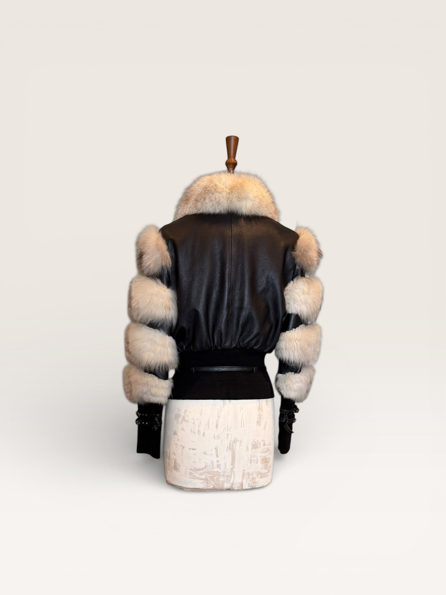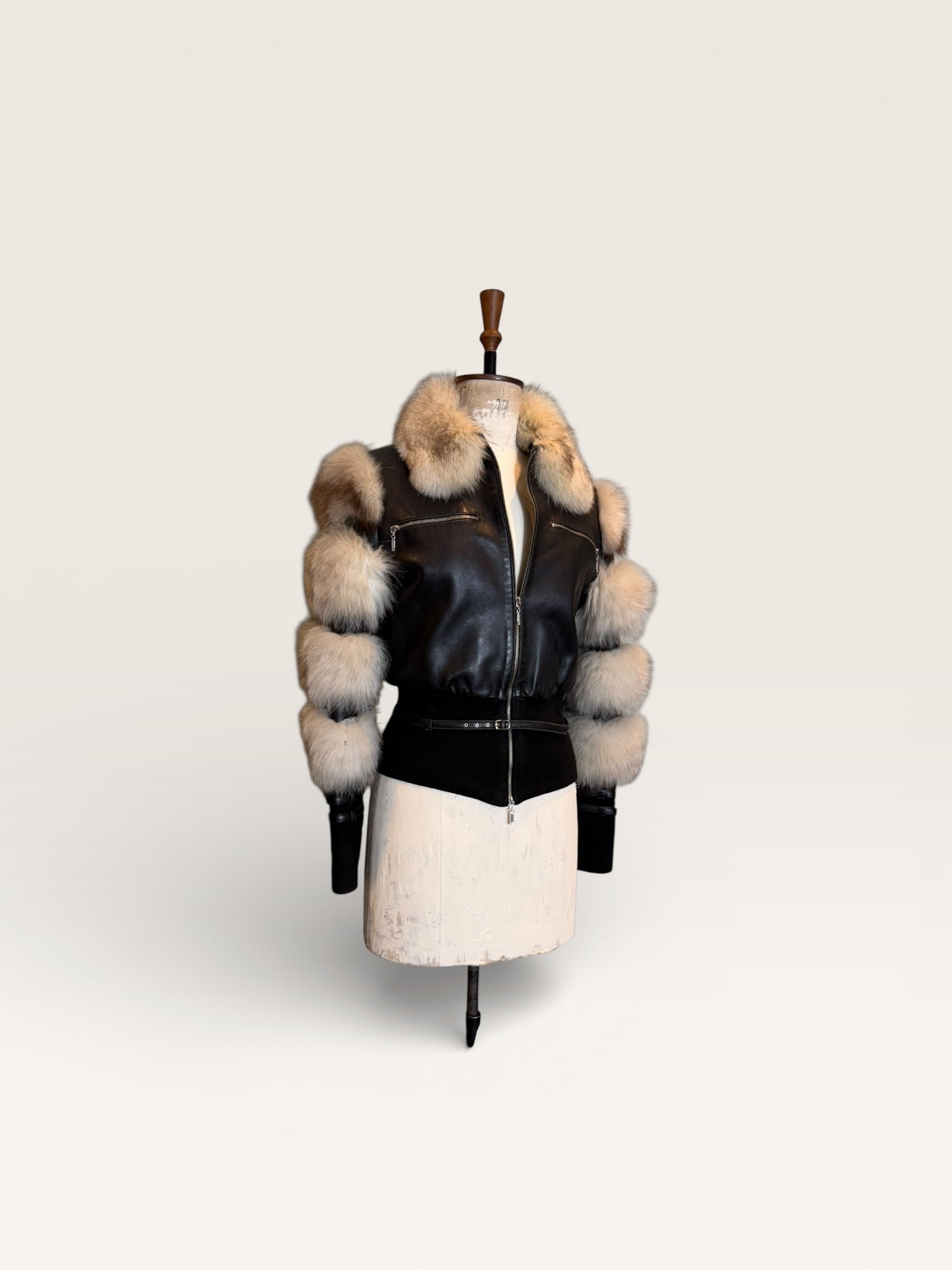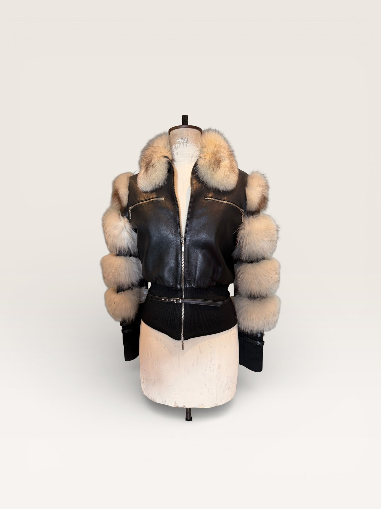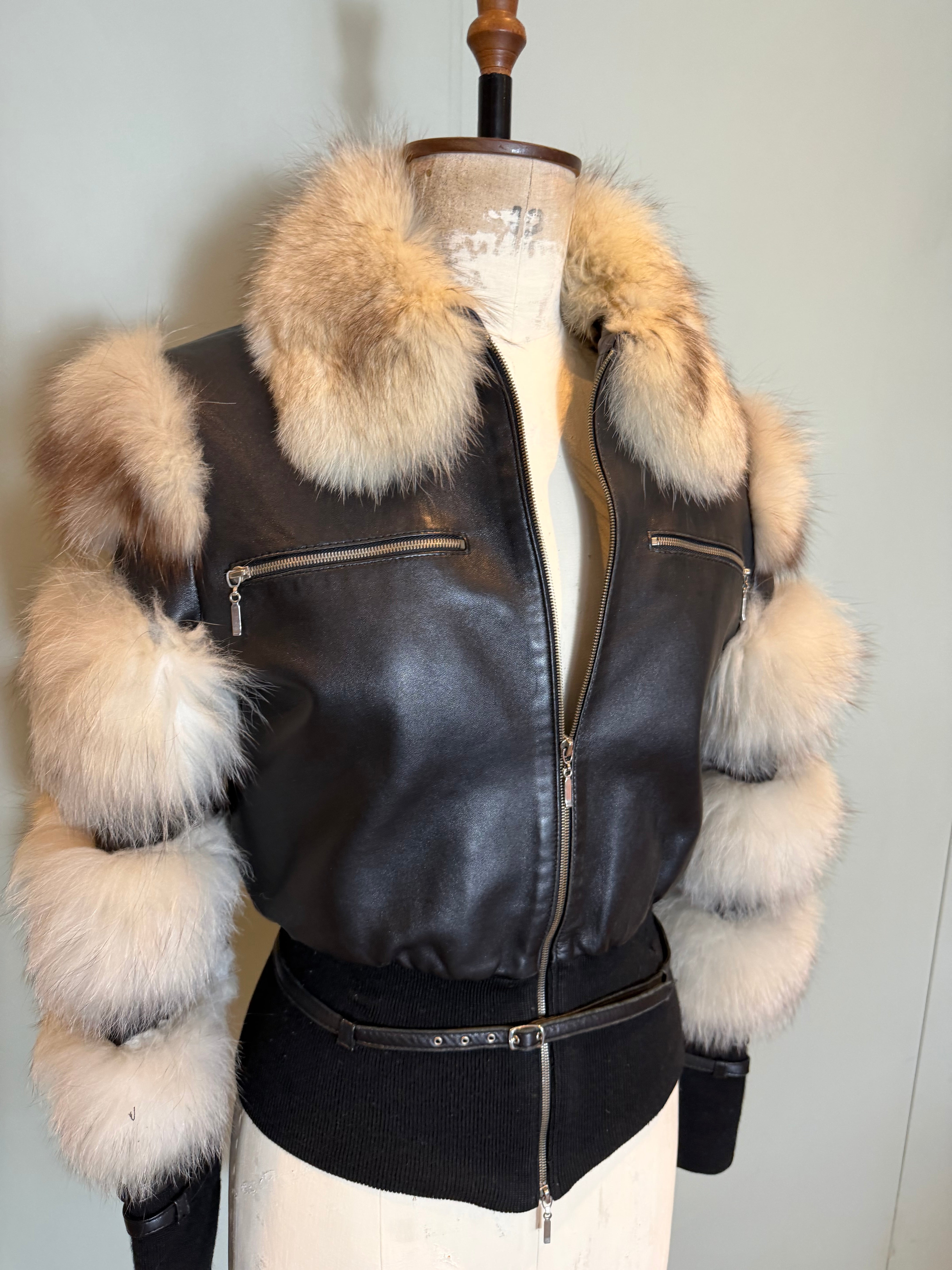 This exceptional 70s black leather and fox fur belted jacket is an original bomber-style piece notable for its unique design. Constructed from high-quality black leather, it features a knit waistband for comfort and a front zipper for ease of wear. The long sleeves, crafted from arctic fox and leather panels, enhance warmth and style. A thin buckled belt at the knit hem allows for a personalised fit. Comes fully lined.