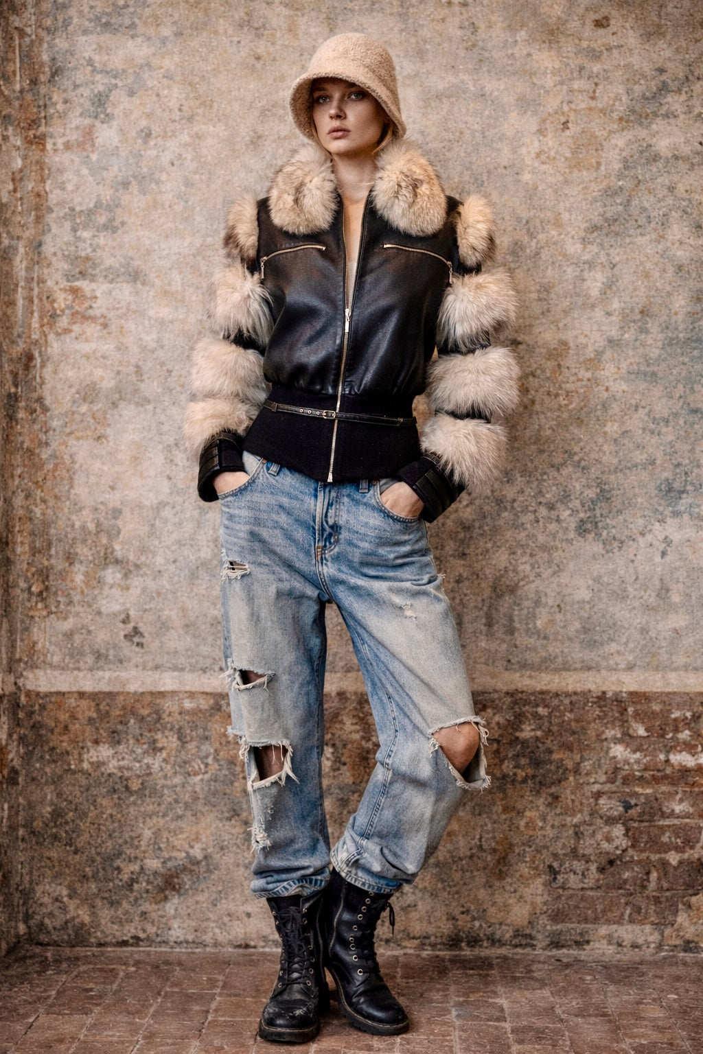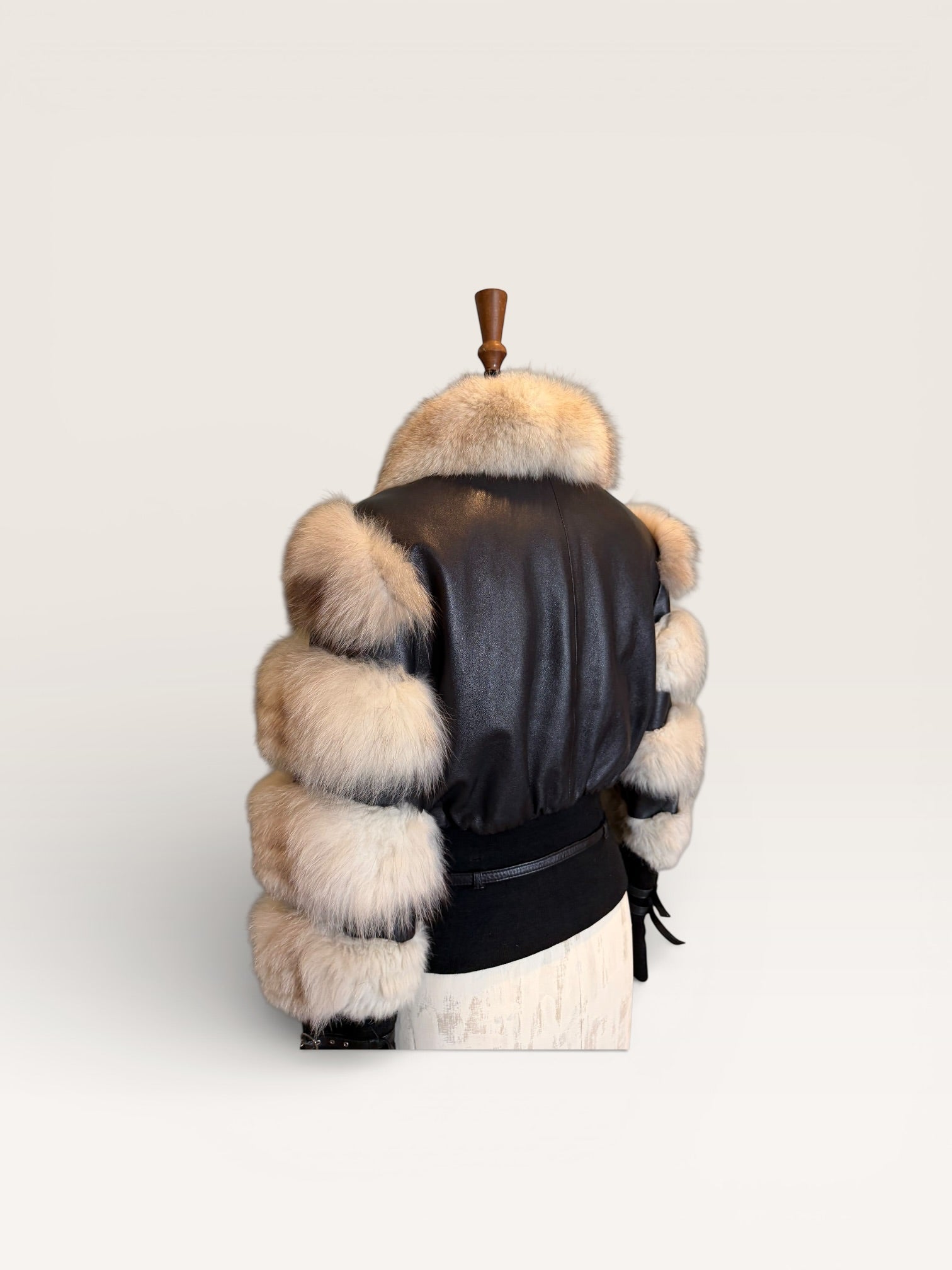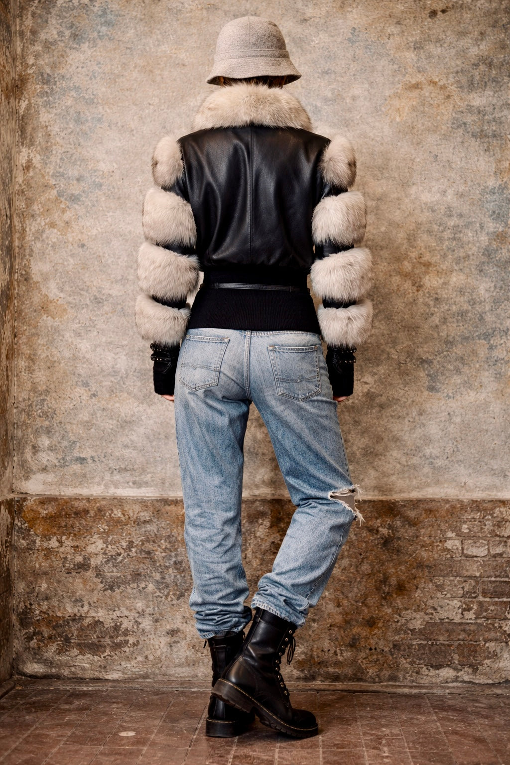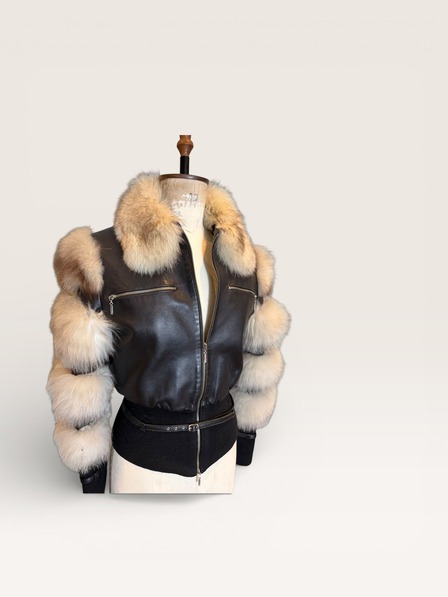 This exceptional 70s black leather and fox fur belted jacket is an original bomber-style piece notable for its unique design. Constructed from high-quality black leather, it features a knit waistband for comfort and a front zipper for ease of wear. The long sleeves, crafted from arctic fox and leather panels, enhance warmth and style. A thin buckled belt at the knit hem allows for a personalised fit. Comes fully lined.