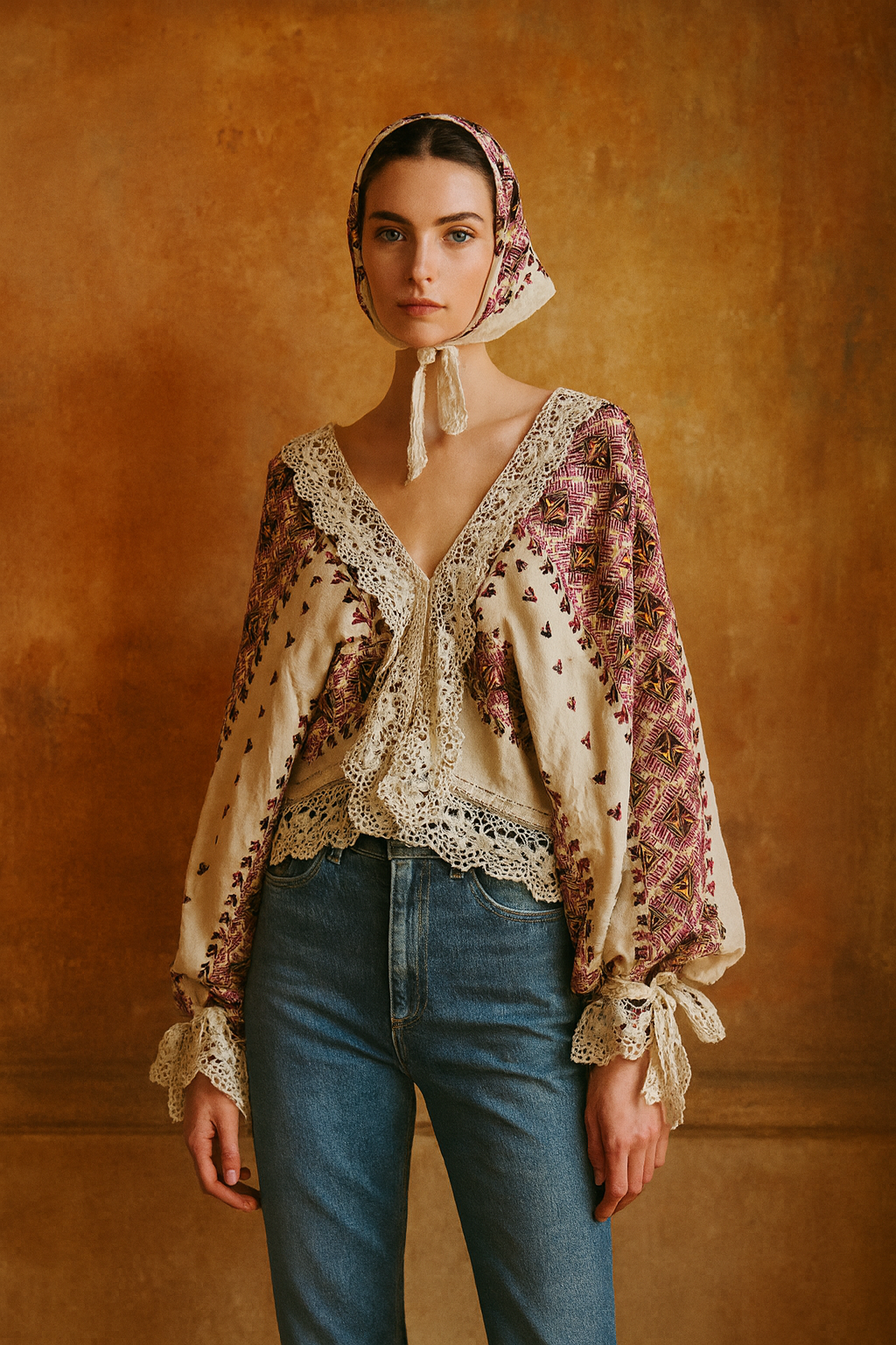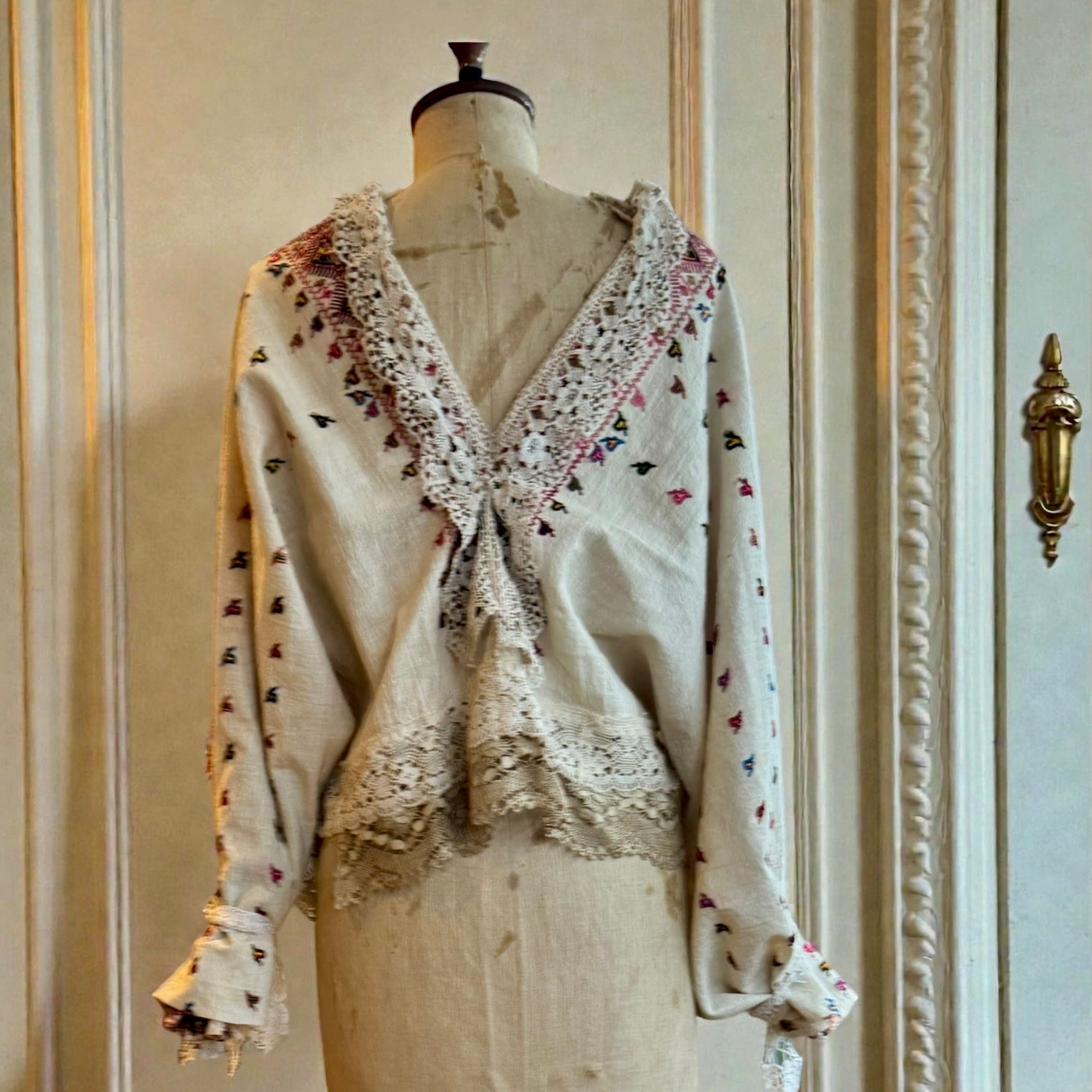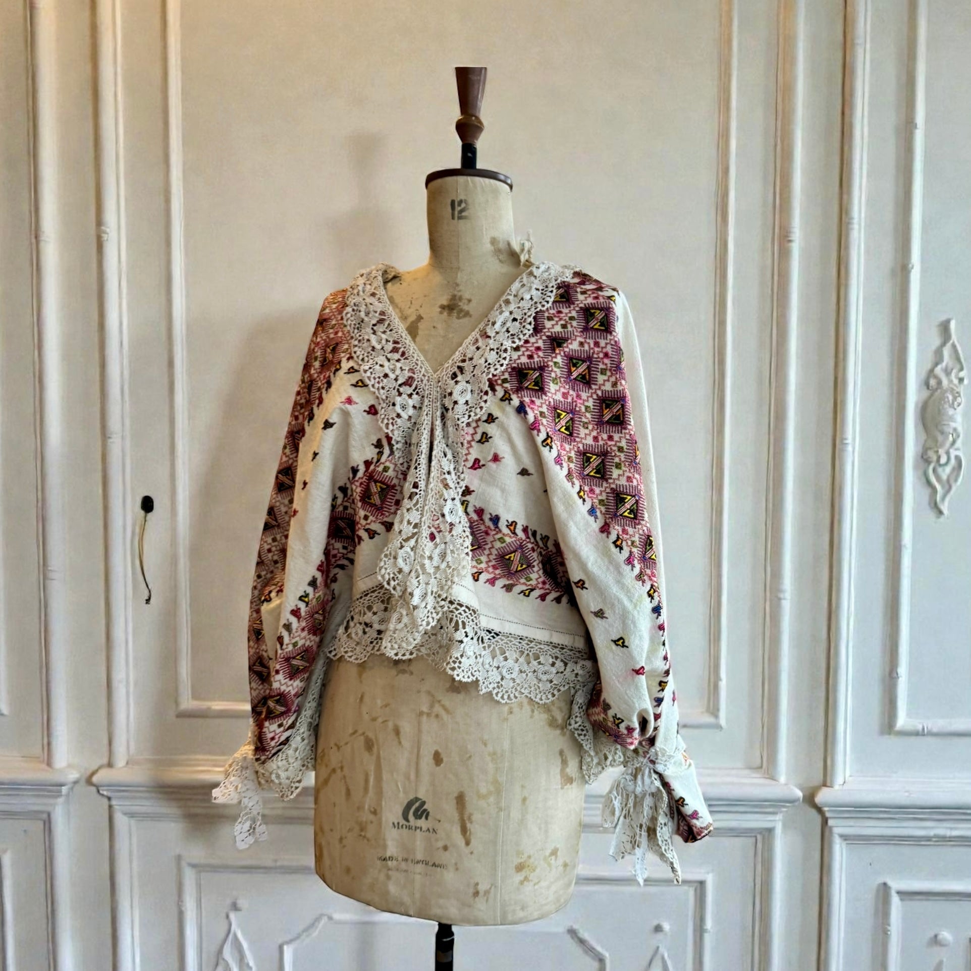 This blouse is expertly reworked from an antique Romanian embroidered apron creating a unique versatile piece. The balloon sleeves with lace tie cuffs and poet-style design exude timeless charm, while the antique lace trim on the collar adds a touch of sophistication. Perfect for pairing with Jeans or layering over a slip dress.