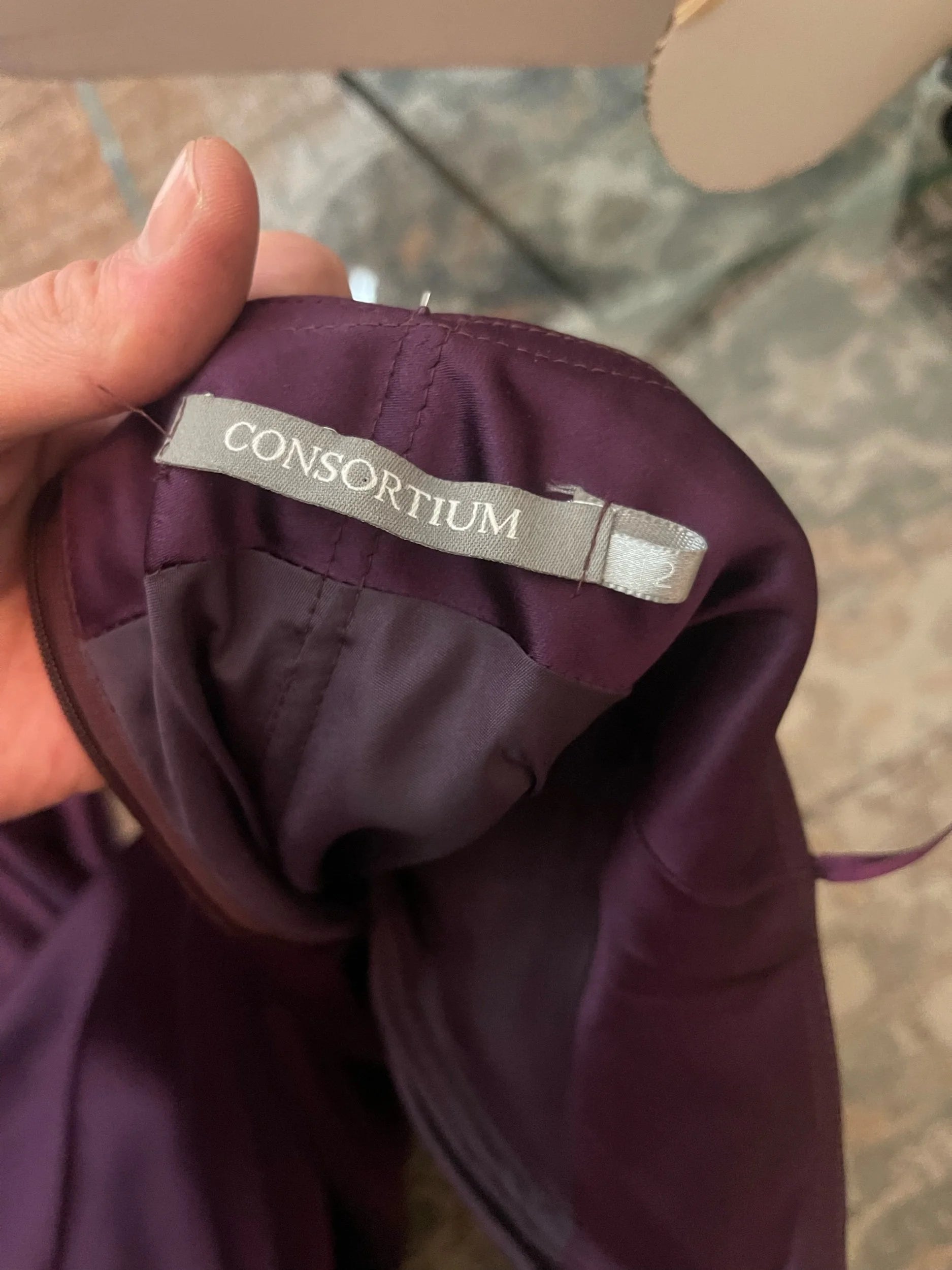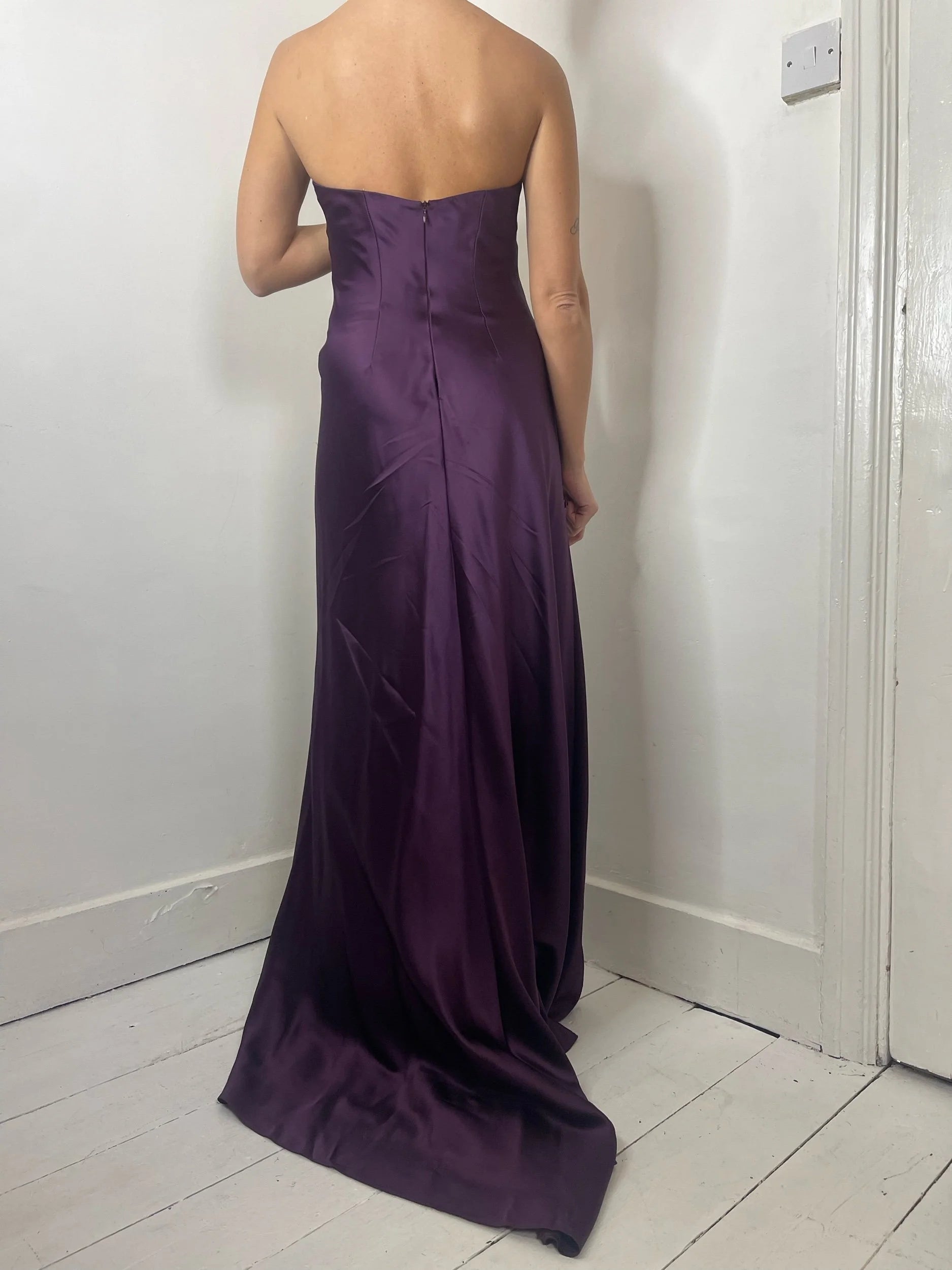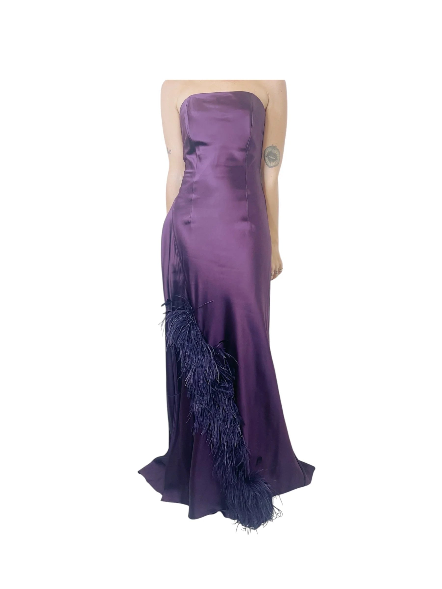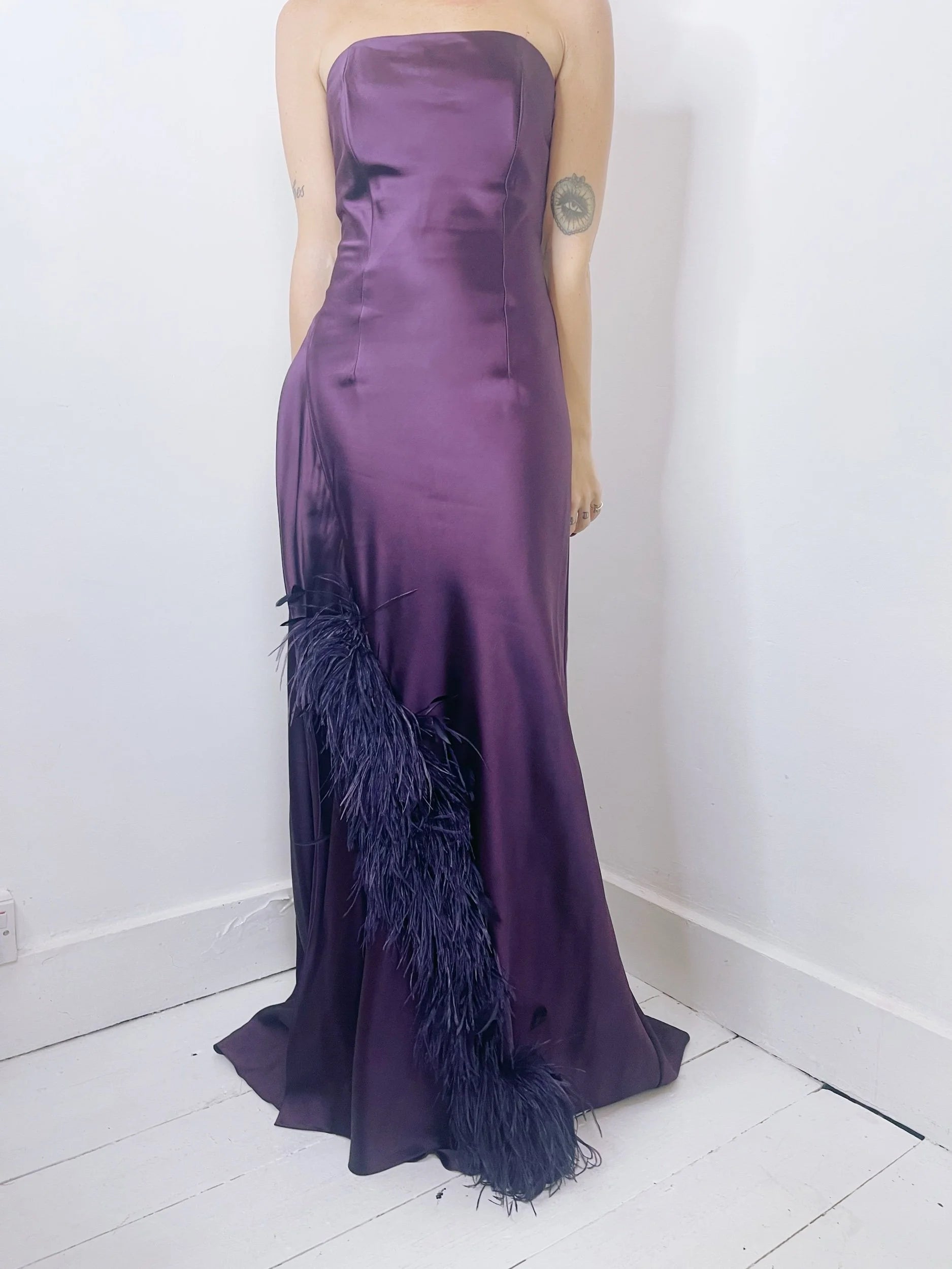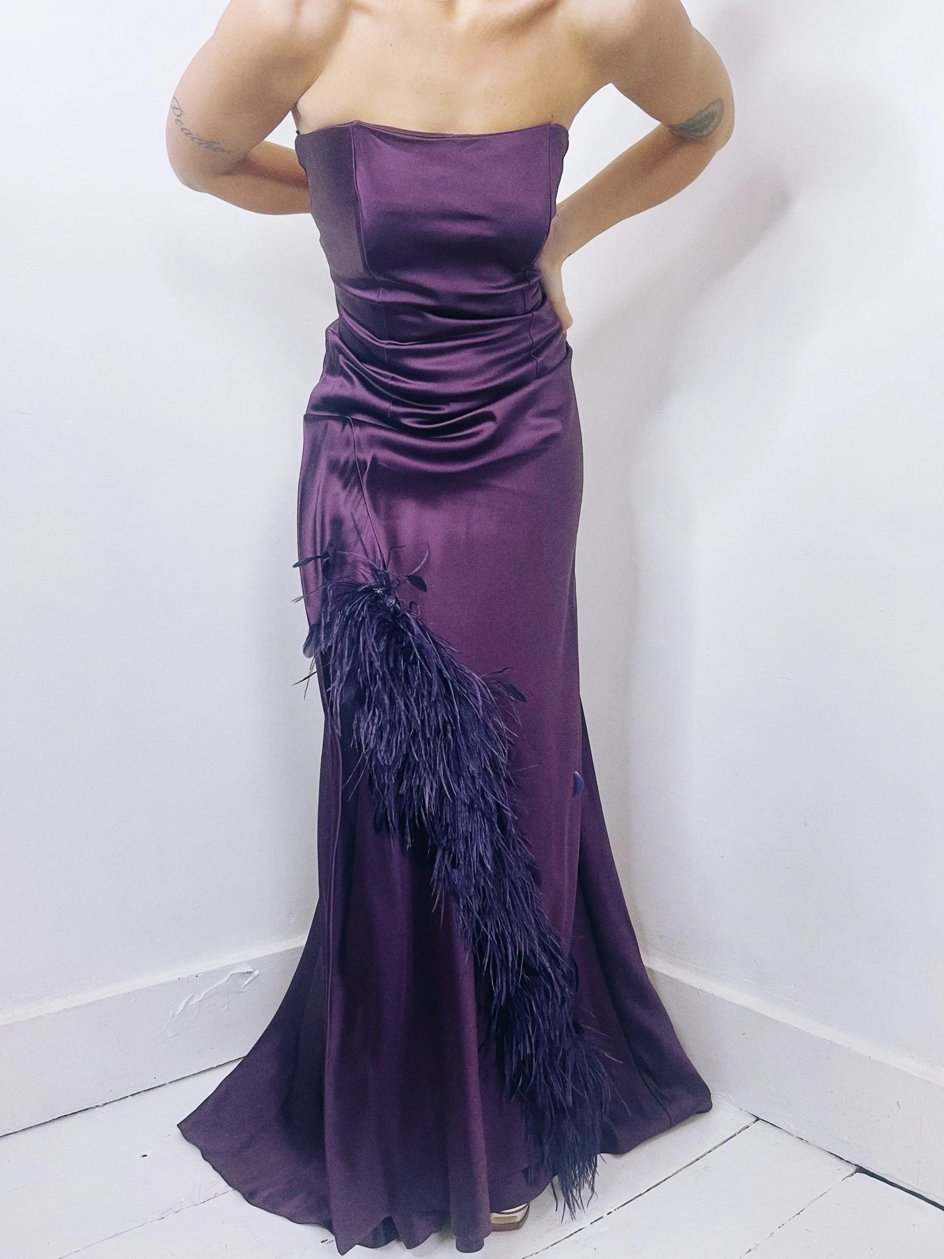 CONSORTIUM Plum Satin Strapless Gown with Feather Trim — UK 12 (Best for UK 10–12)