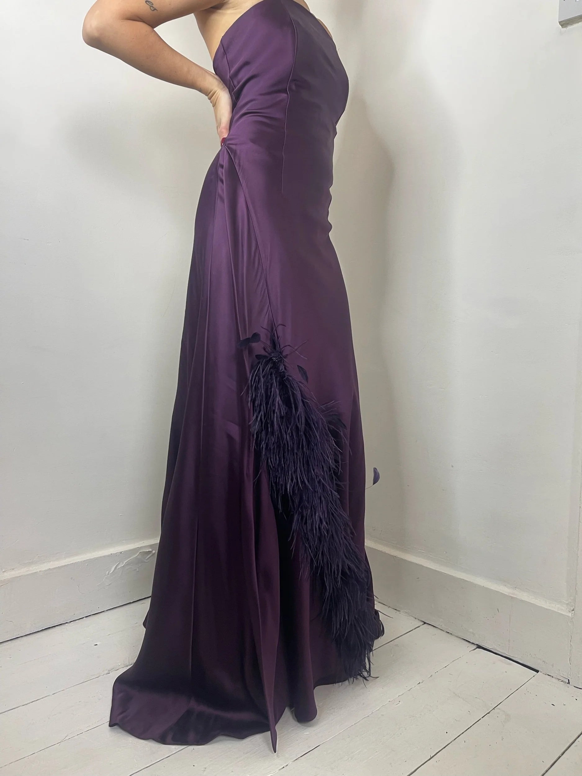 A dramatic cascade of deep plum feathers sweeps from the hip down to the hem, creating eye-catching movement and a couture-inspired finish. The rich satin fabric has a subtle sheen that enhances the depth of the colour, giving the gown a timeless, romantic feel.