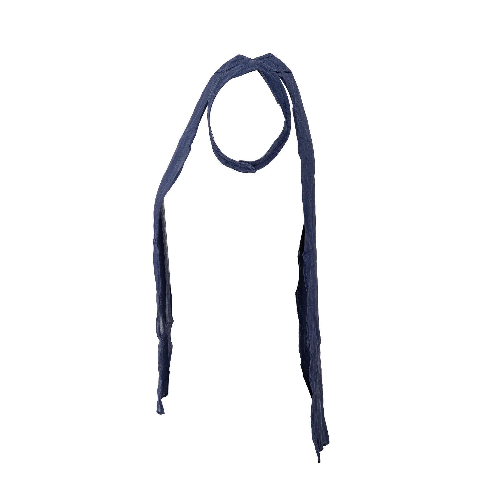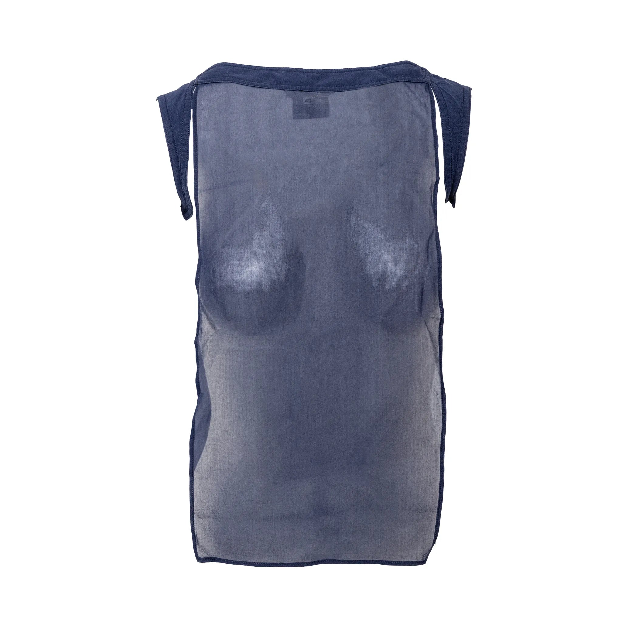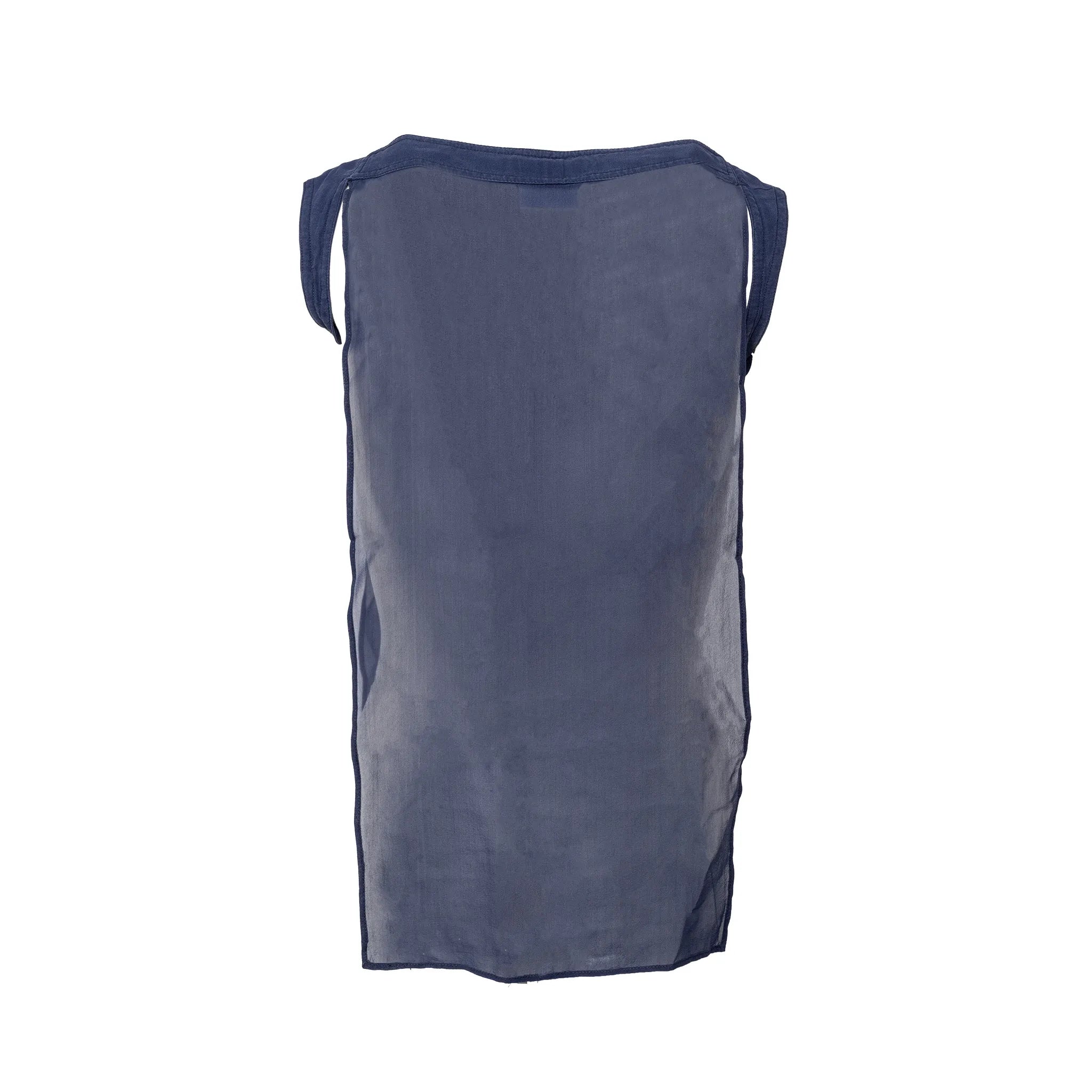 Costume National navy blue sleeveless top in sheer silk, 90s minimalist avant-garde style. Features panel with open sides, snap band sleeve, high-low hem.