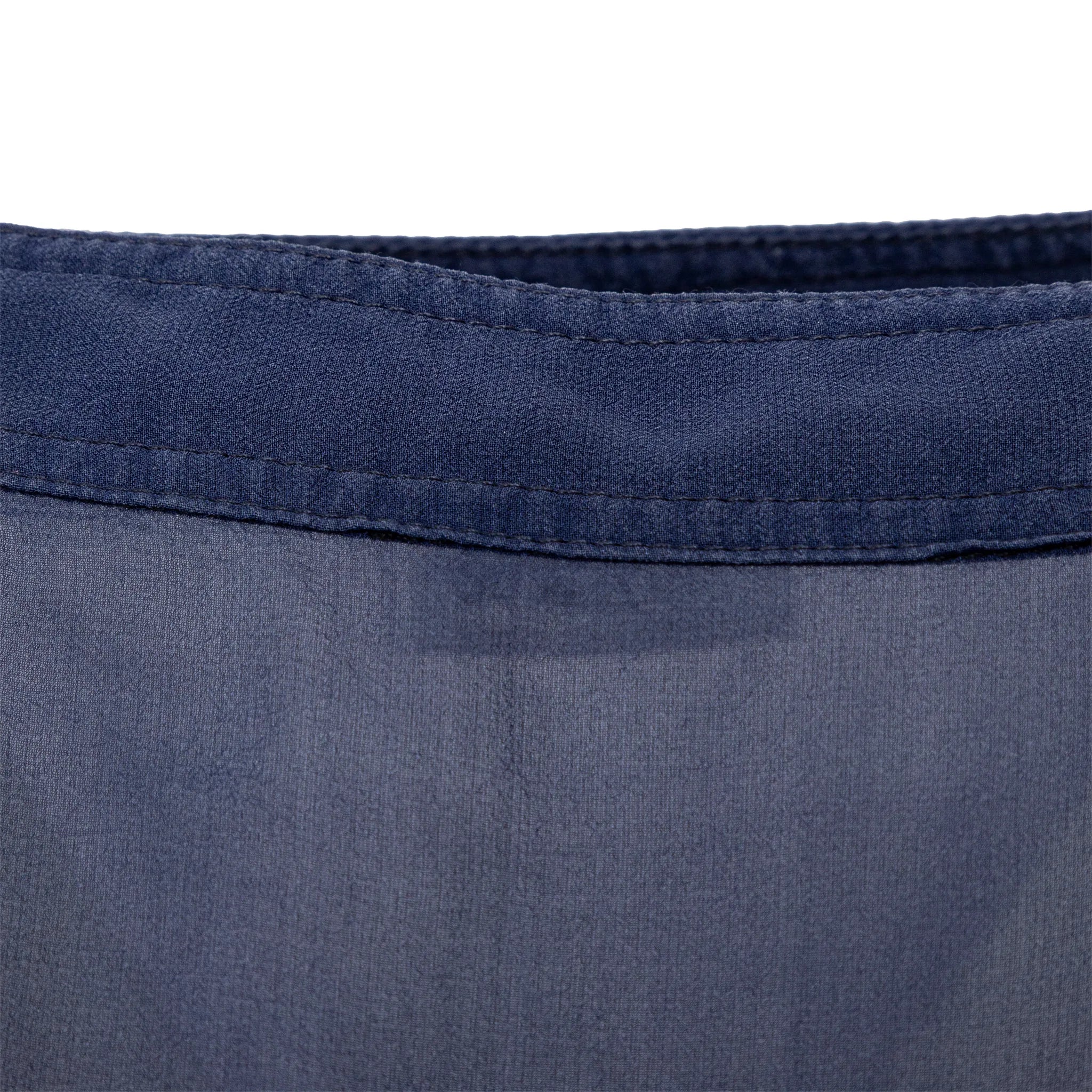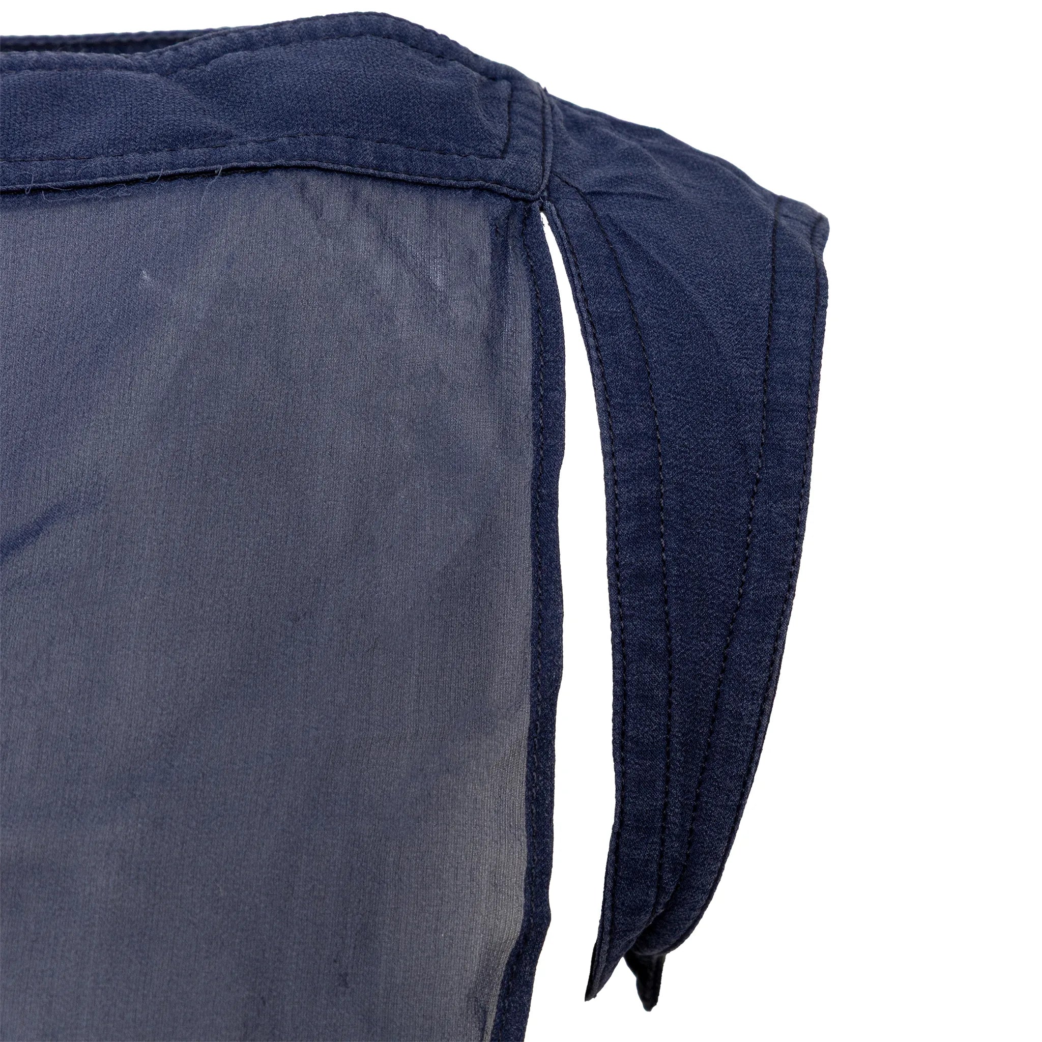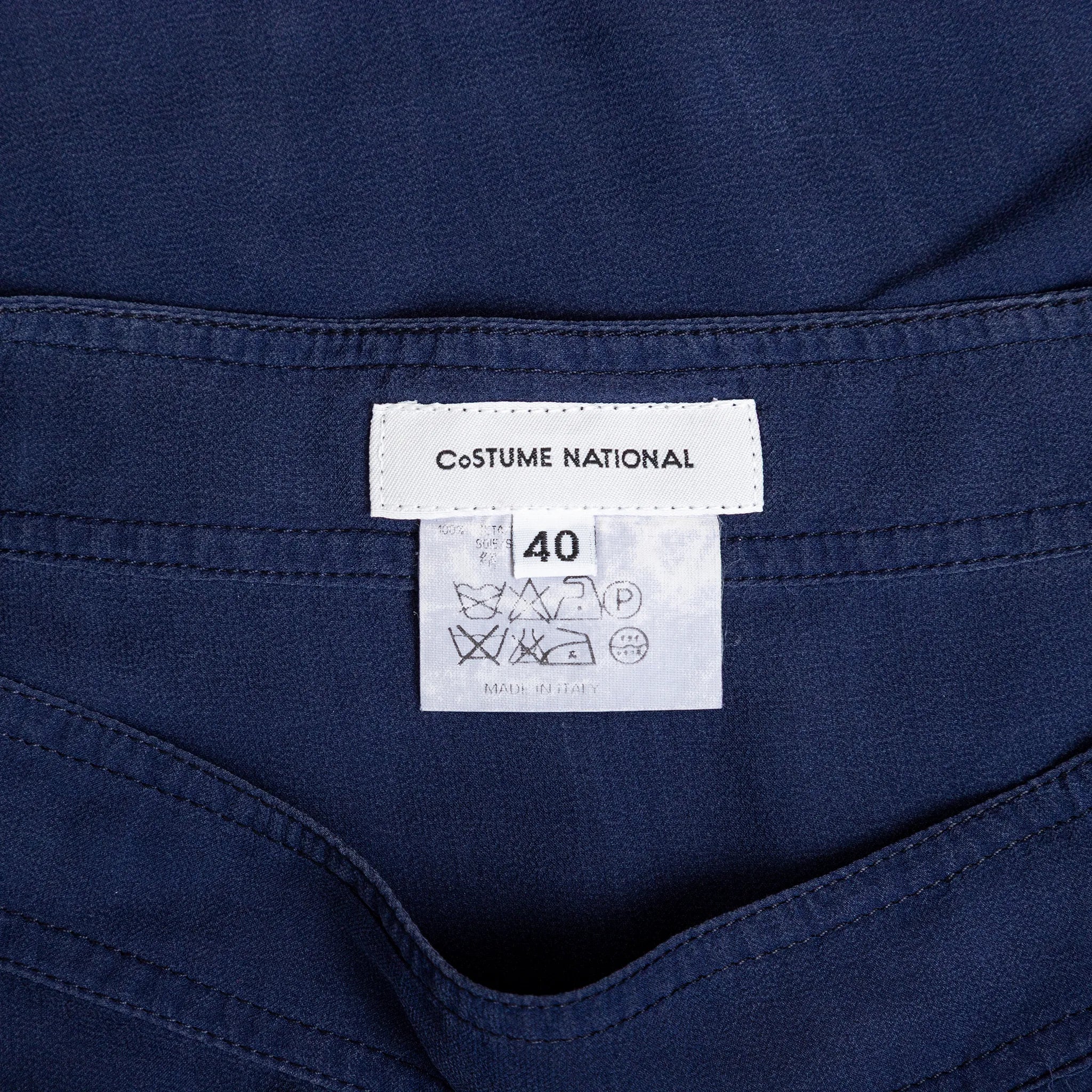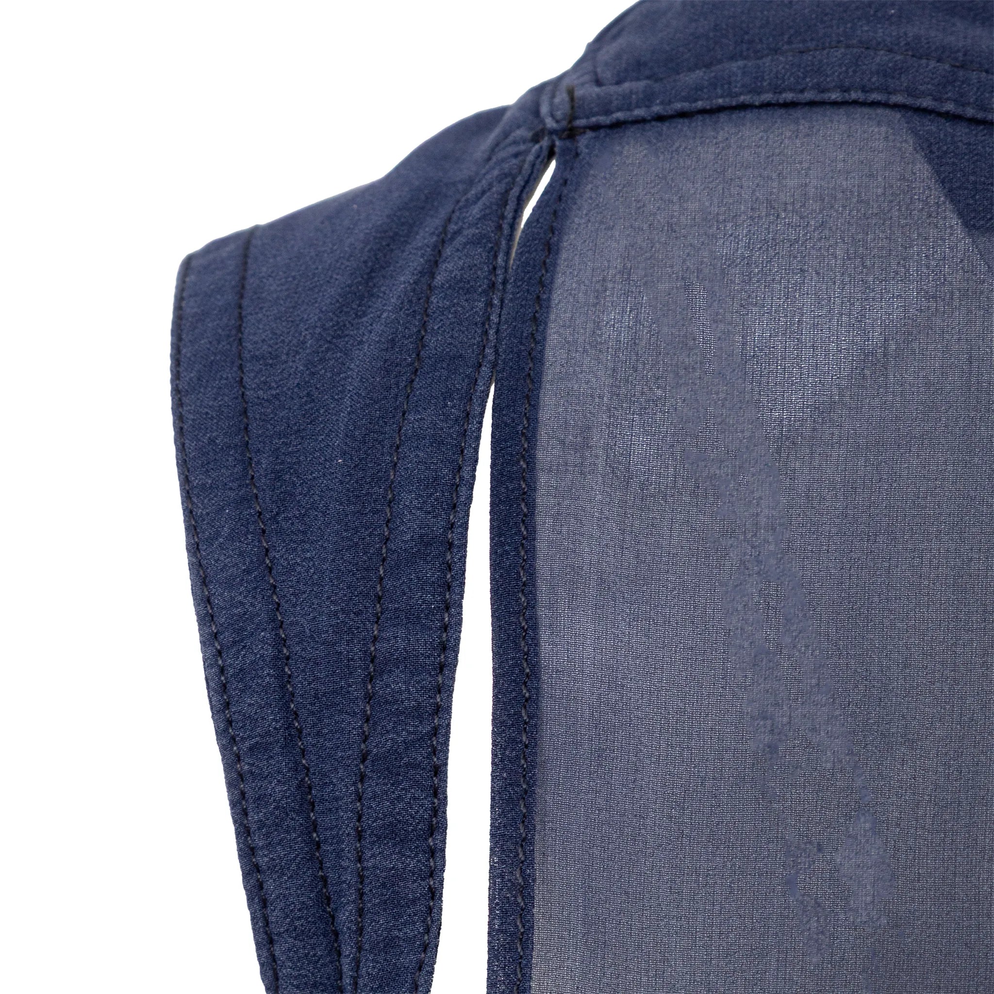 Costume National navy blue sleeveless top in sheer silk, 90s minimalist avant-garde style. Features panel with open sides, snap band sleeve, high-low hem.