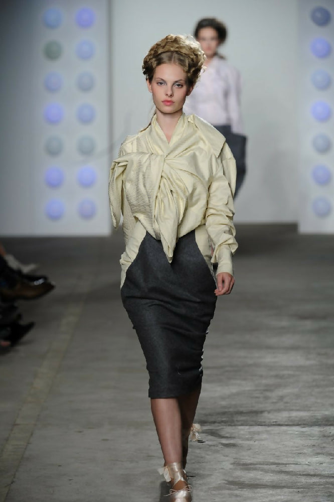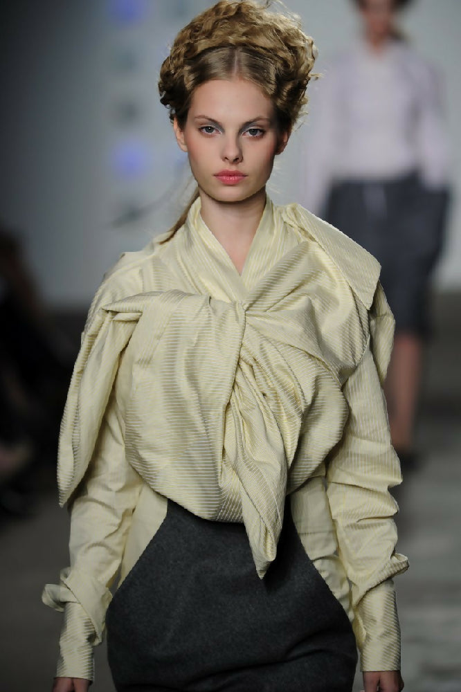 Double Knot Tie Shirt S/S 2011: Bias cut long sleeve fitted shirt has a centre front placket with buttons. Front part of shirt is shaped into large bust which forms an asymmetrical shape and has two centre front ties that tie into a knot. The centre back of shirt has two upper bias cut back ties, that also tie into a knot. Fabric:100% cotton in pale yellow and white pinstripe. Size10 LAST ONE