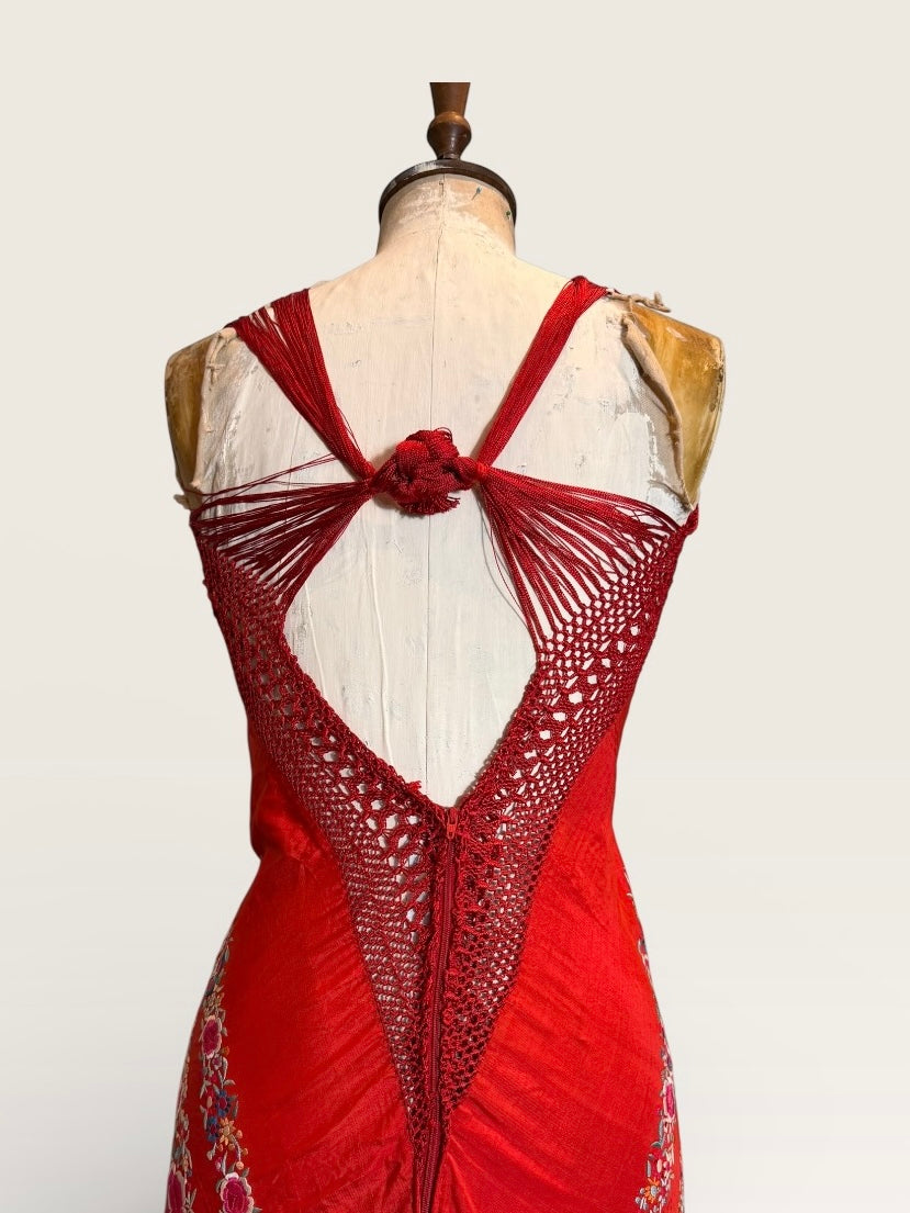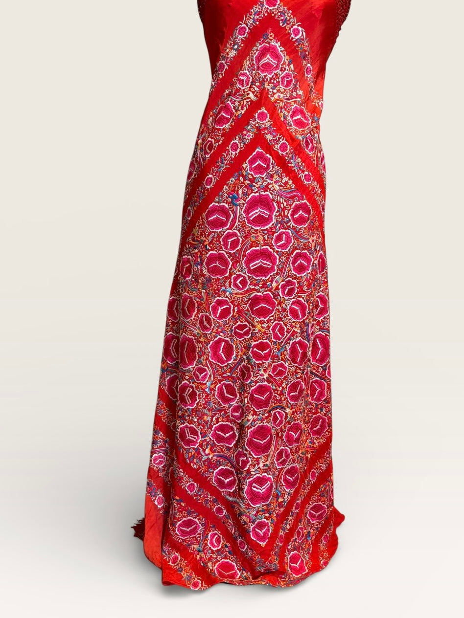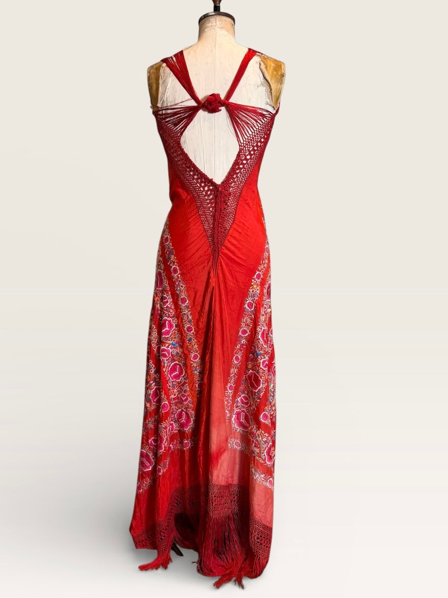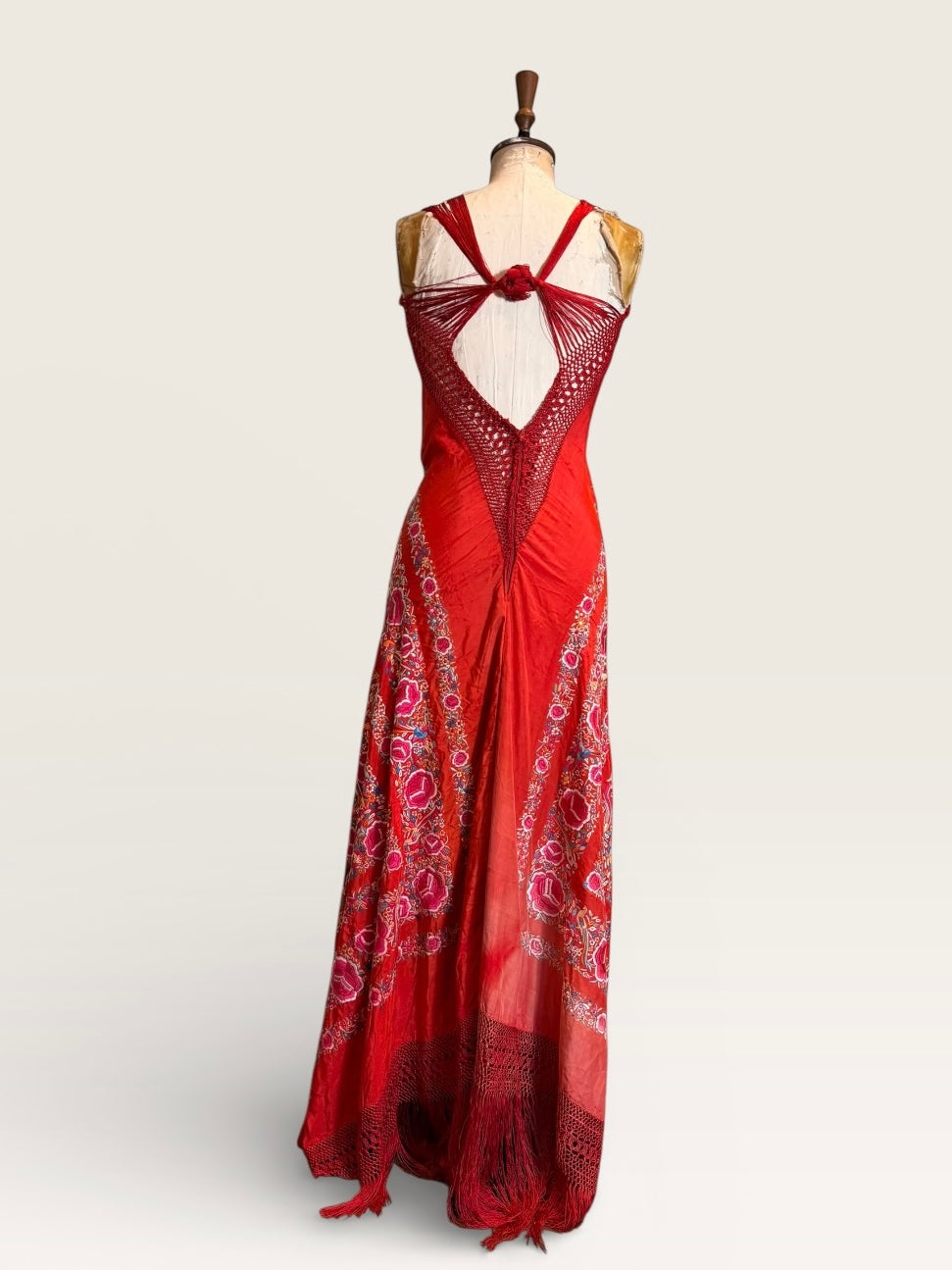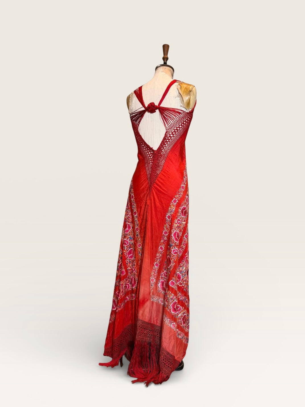 Introducing a stunning one-of-a-kind bias cut dress by One Vintage. This reworked design features an original rare 1940s silk embroidered red floral piano shawl, exuding vibrant blooms and timeless elegance. Adorned with a striking fringe tail design that cascades to the floor, this dress boasts a bias cut design, and a back zip with hooks. ‘This is a particularly unusual colour way for an antique piano shawl and very flattering silhouette.
