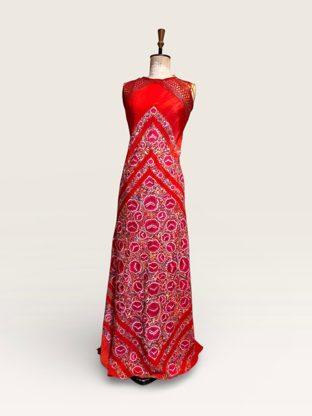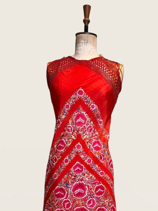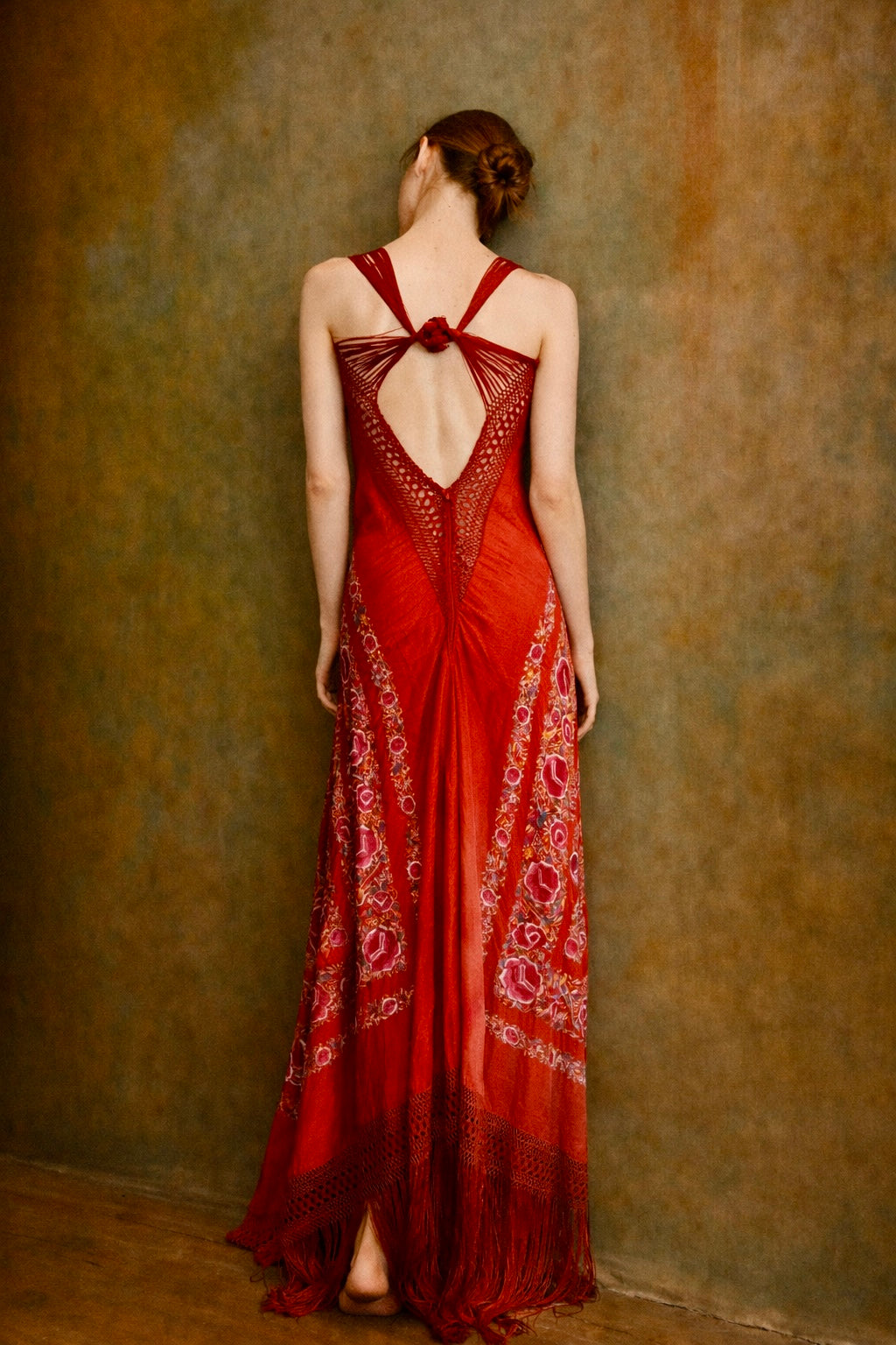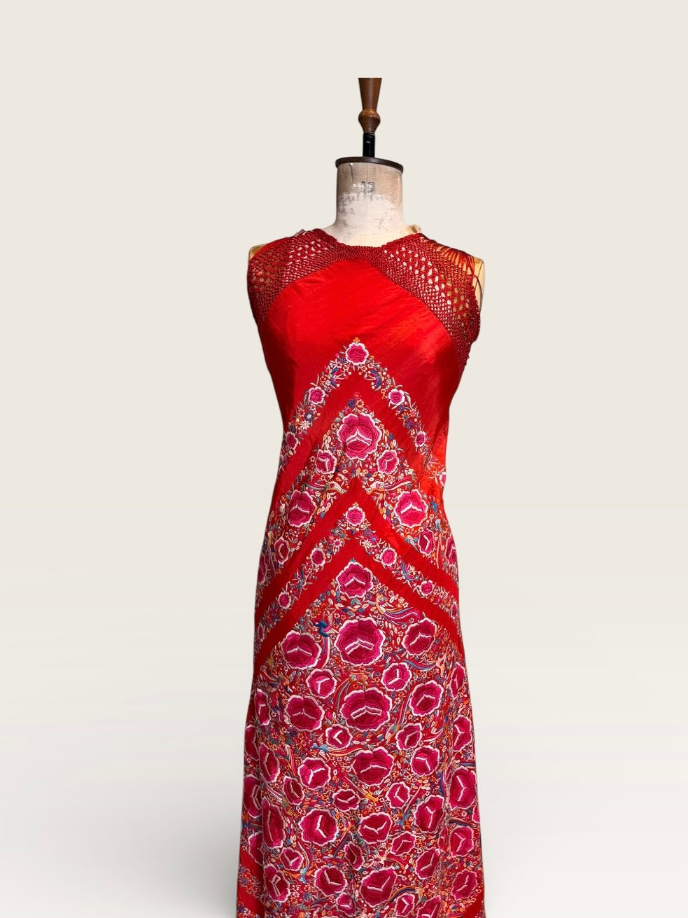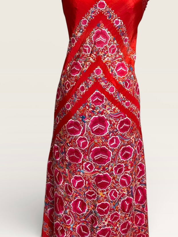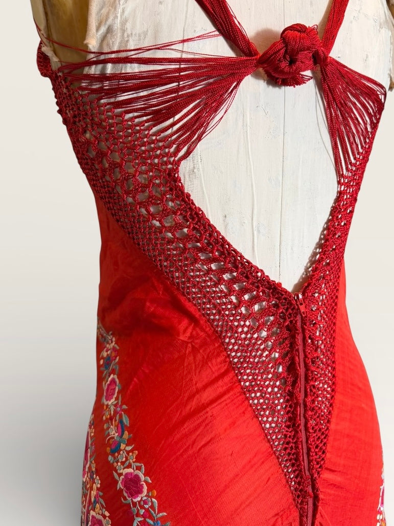 Introducing a stunning one-of-a-kind bias cut dress by One Vintage. This reworked design features an original rare 1940s silk embroidered red floral piano shawl, exuding vibrant blooms and timeless elegance. Adorned with a striking fringe tail design that cascades to the floor, this dress boasts a bias cut design, and a back zip with hooks. ‘This is a particularly unusual colour way for an antique piano shawl and very flattering silhouette.