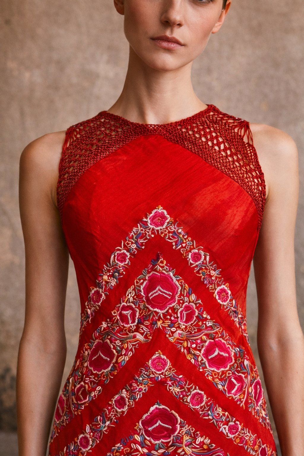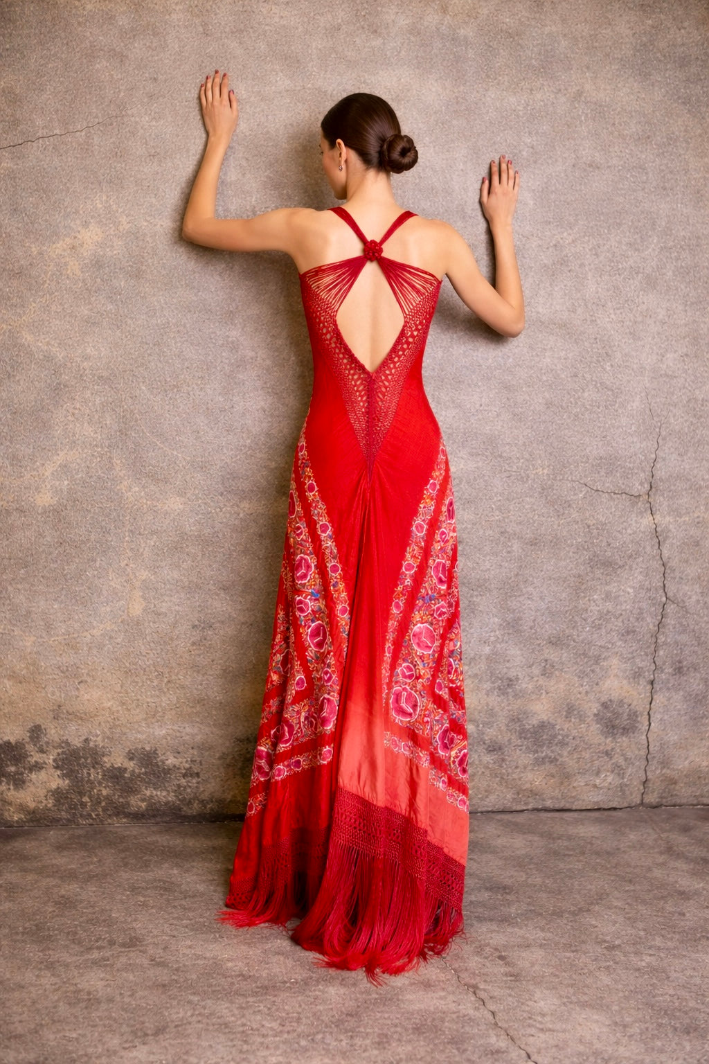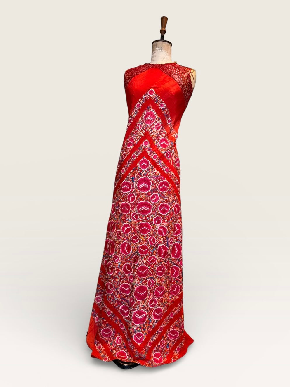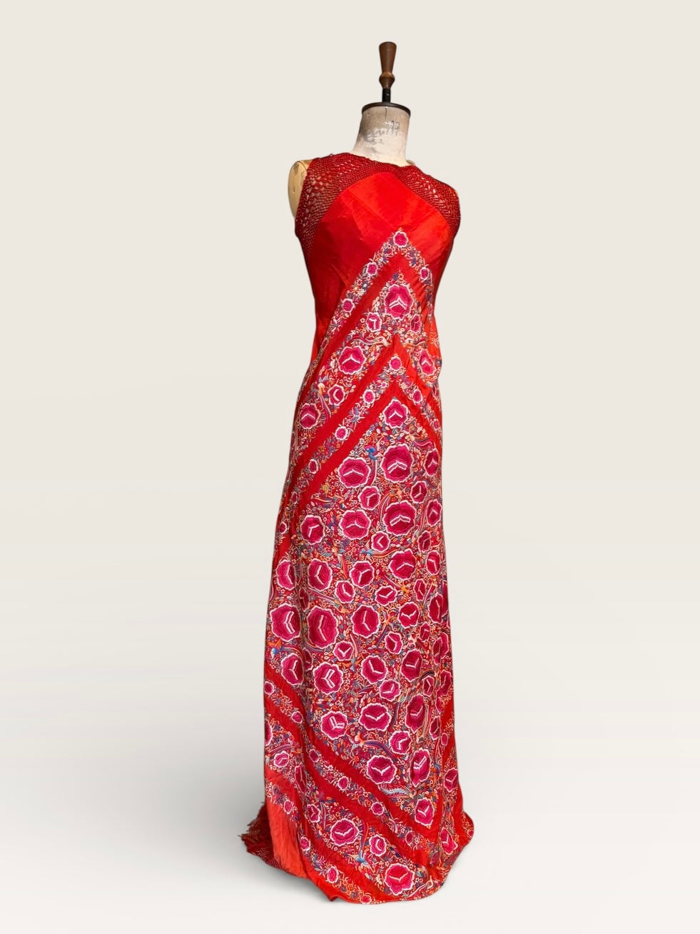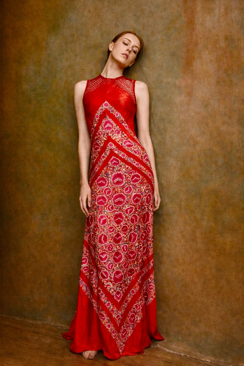 Introducing a stunning one-of-a-kind bias cut dress by One Vintage. This reworked design features an original rare 1940s silk embroidered red floral piano shawl, exuding vibrant blooms and timeless elegance. Adorned with a striking fringe tail design that cascades to the floor, this dress boasts a bias cut design, and a back zip with hooks. ‘This is a particularly unusual colour way for an antique piano shawl and very flattering silhouette.