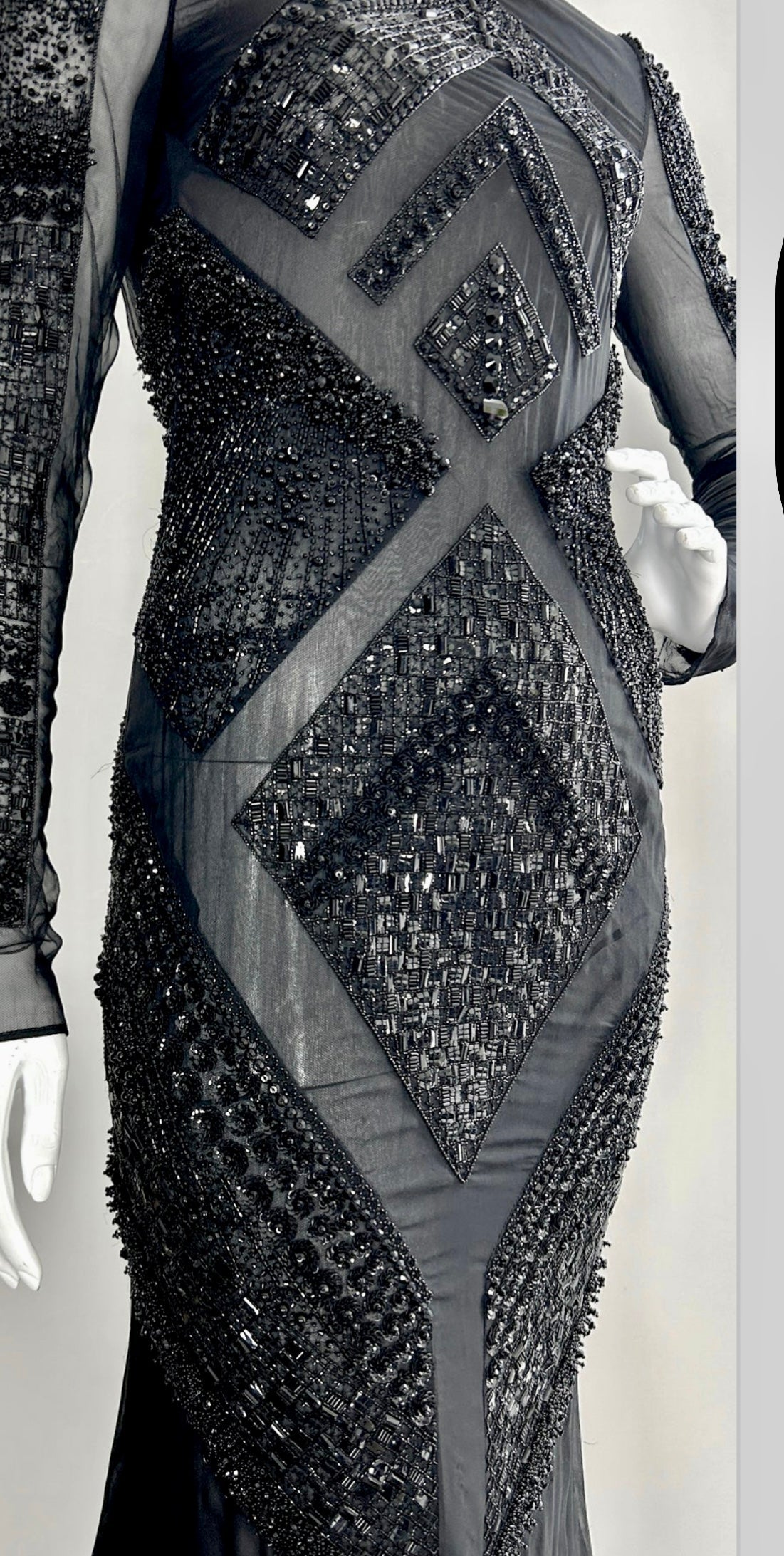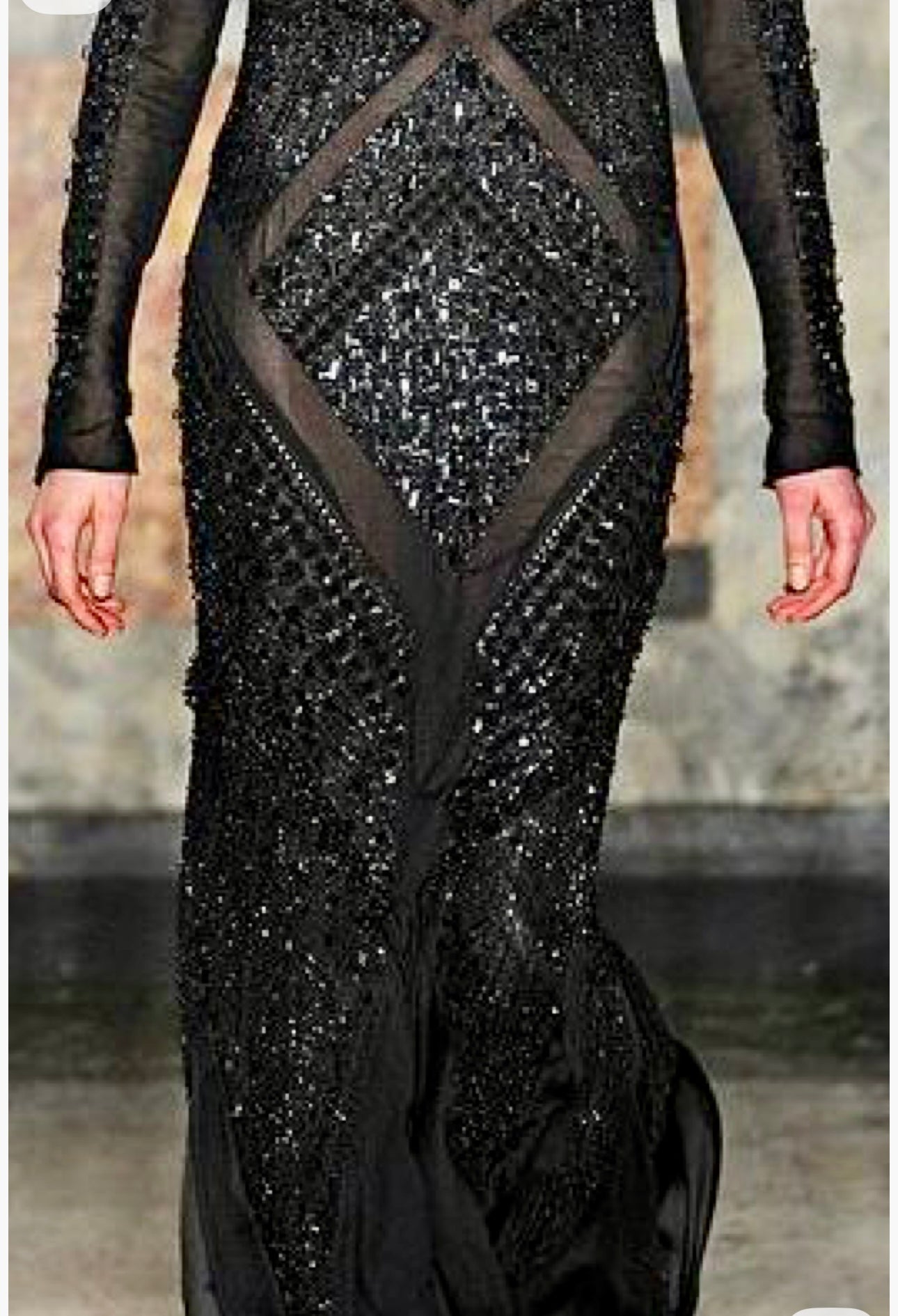 Experience timeless elegance with this Emilio Pucci by Peter Dundas 2012 catwalk gown. This stunning silk chiffon gown features intricate beading on the sleeves, a round neckline, and gorgeous geometric beading throughout the dress, creating a wonderful pattern on the body. The tailored fishtail silhouette and low back add a touch of modern sophistication.