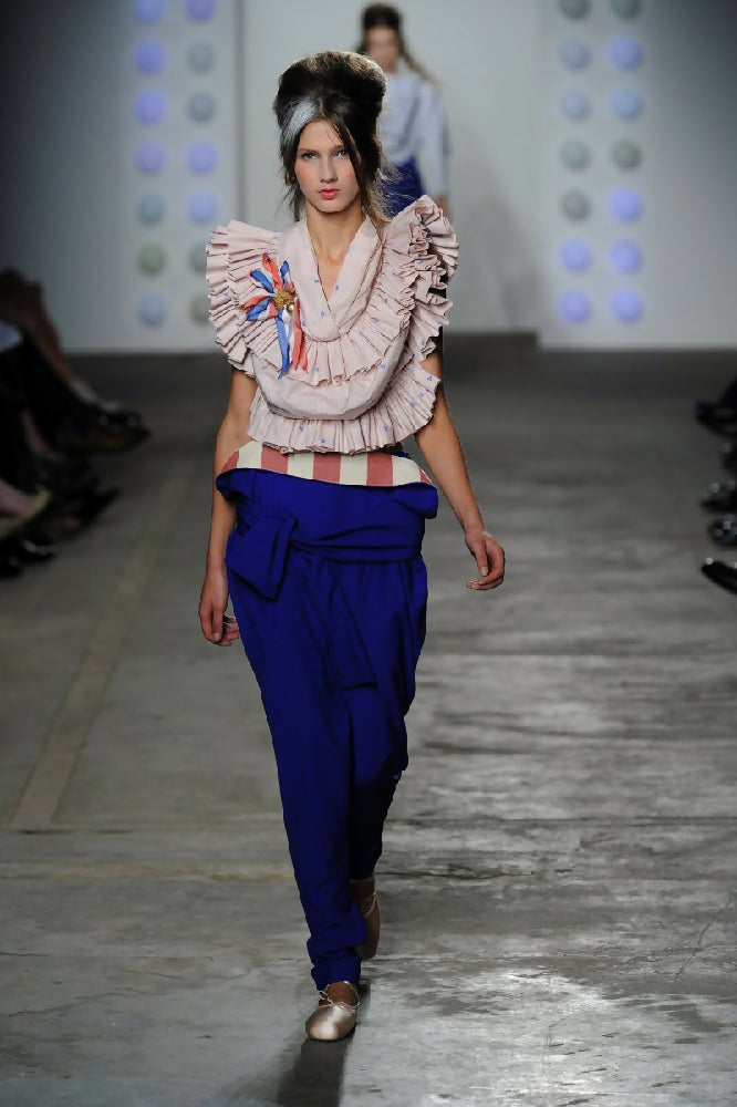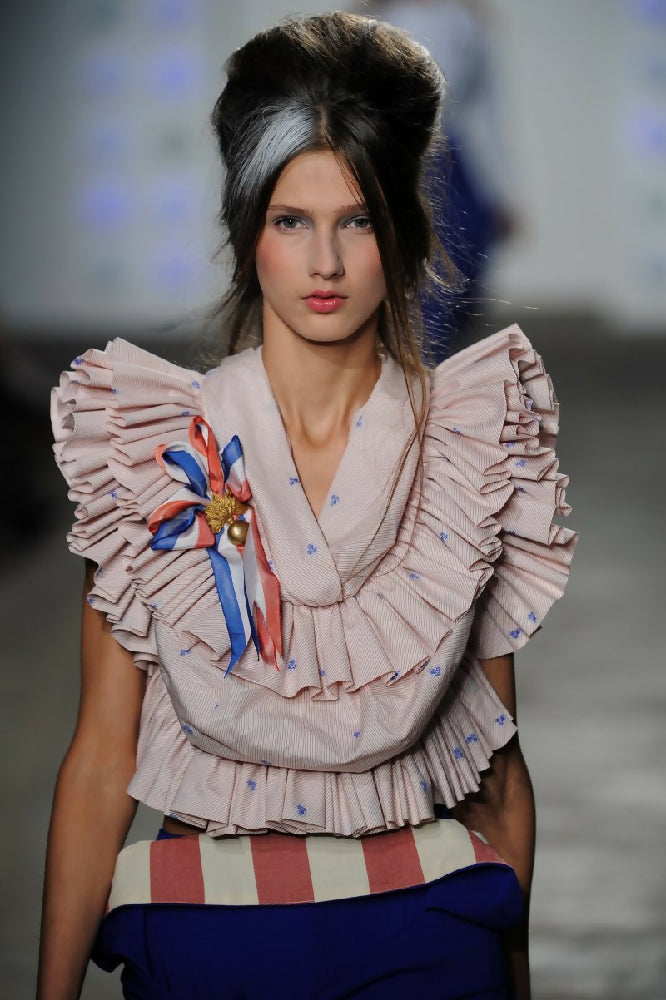 Frilly Fichu Top S/S 2011: The top is cut with heavily gathered frills that are sewn around the shoulders, down the lower front neck, under the bust and across the back. The front bust shape is cut low, the back of the top has a wide waist band with buttons for opening and closing. Fabric:100% cotton in red and white pinstripe with blue flower embroidery. Size10 LAST ONE