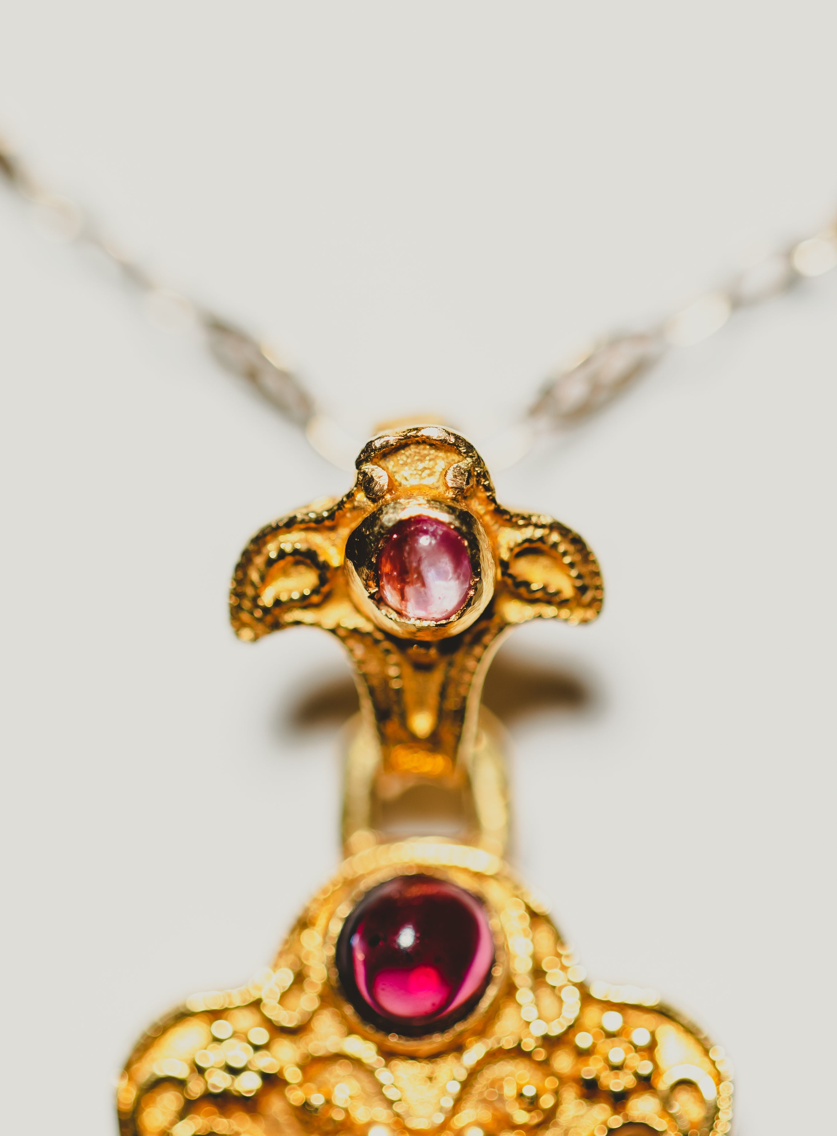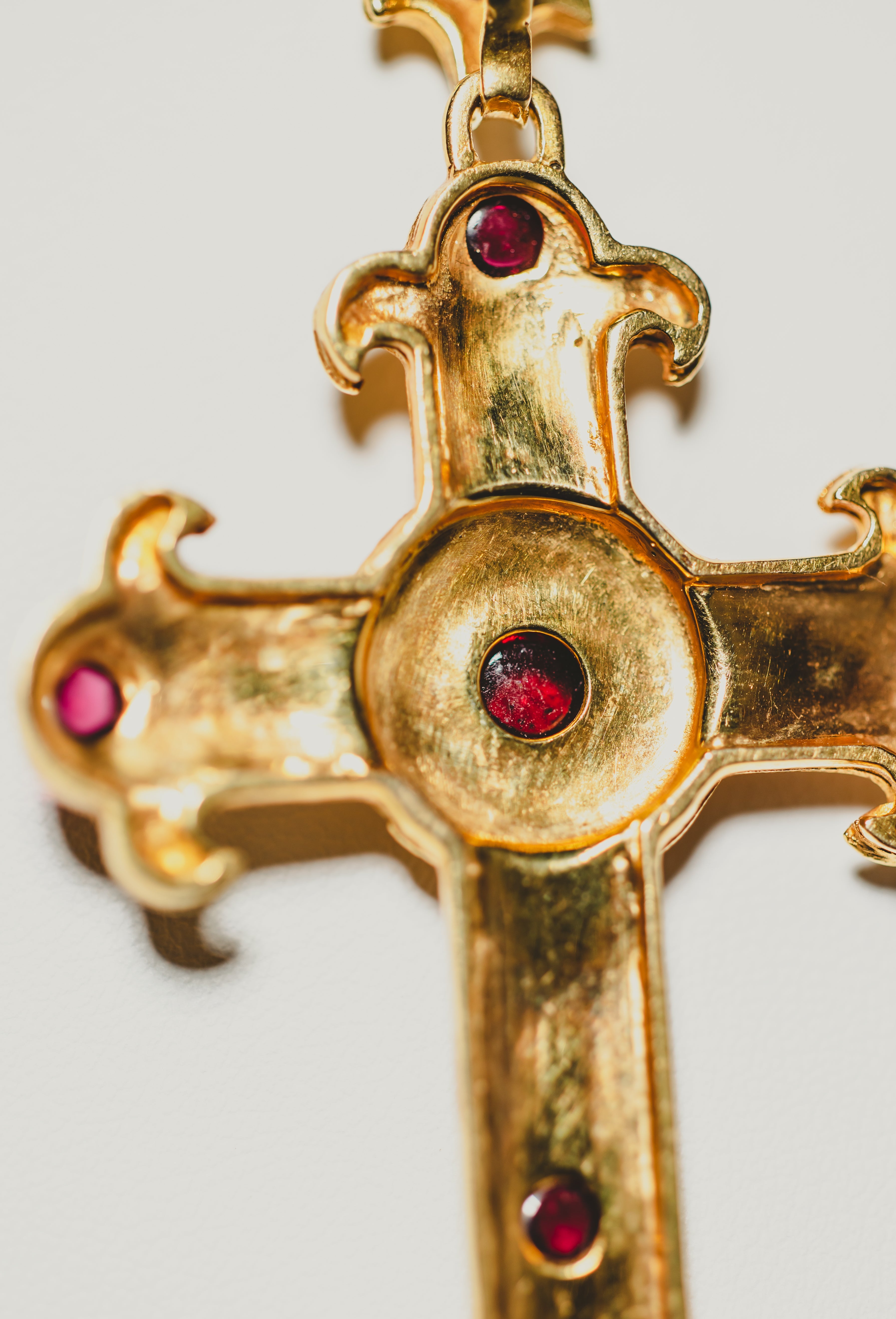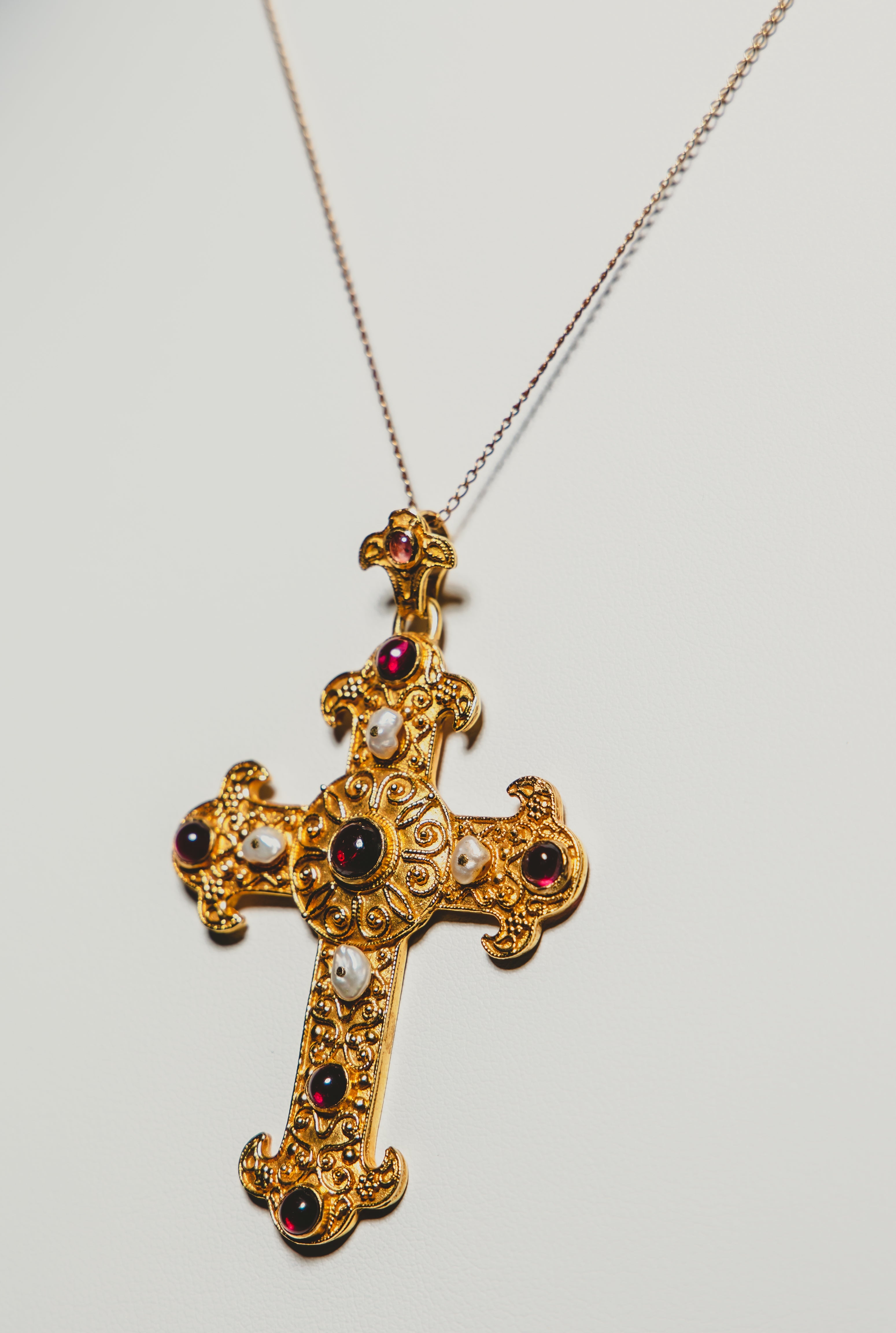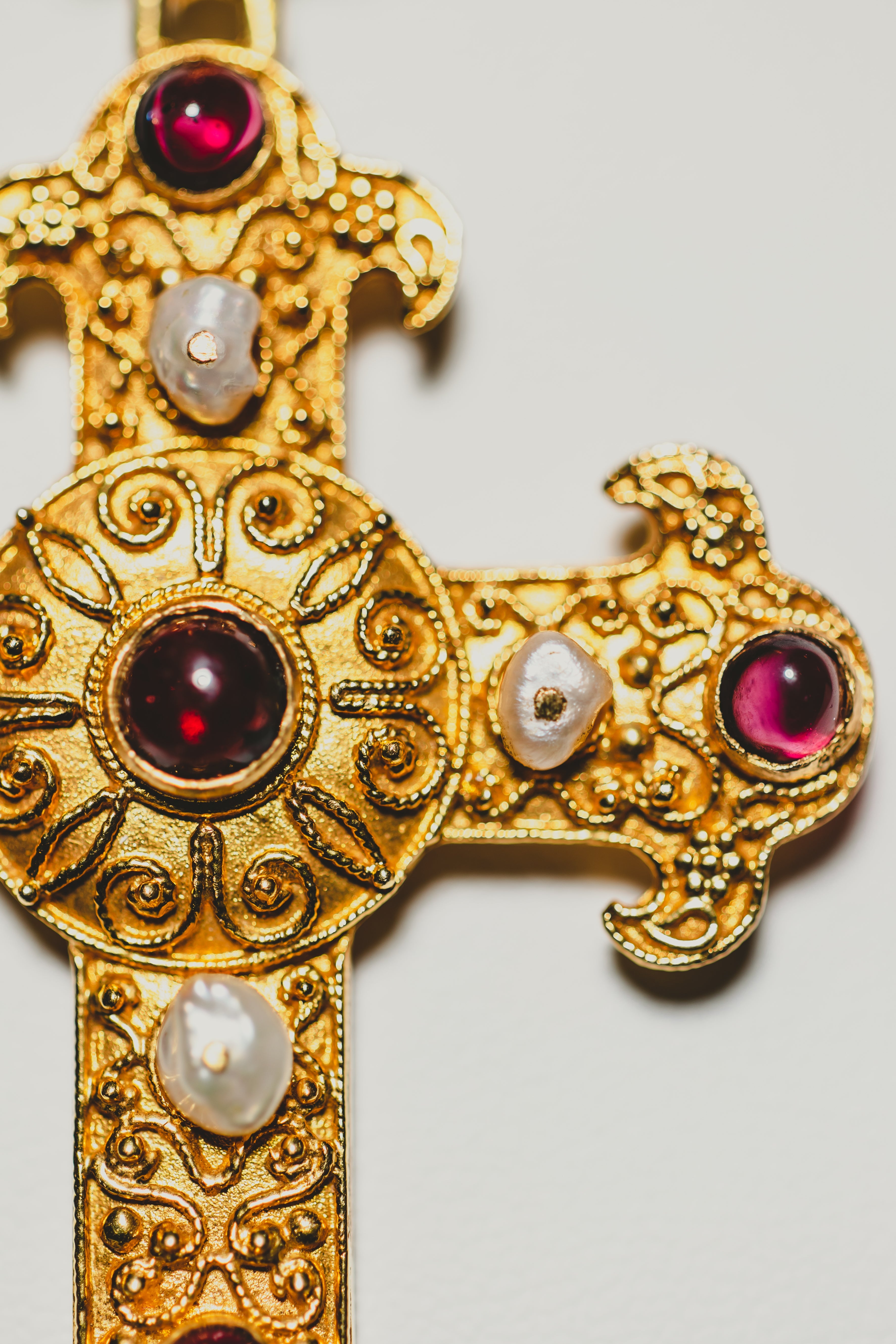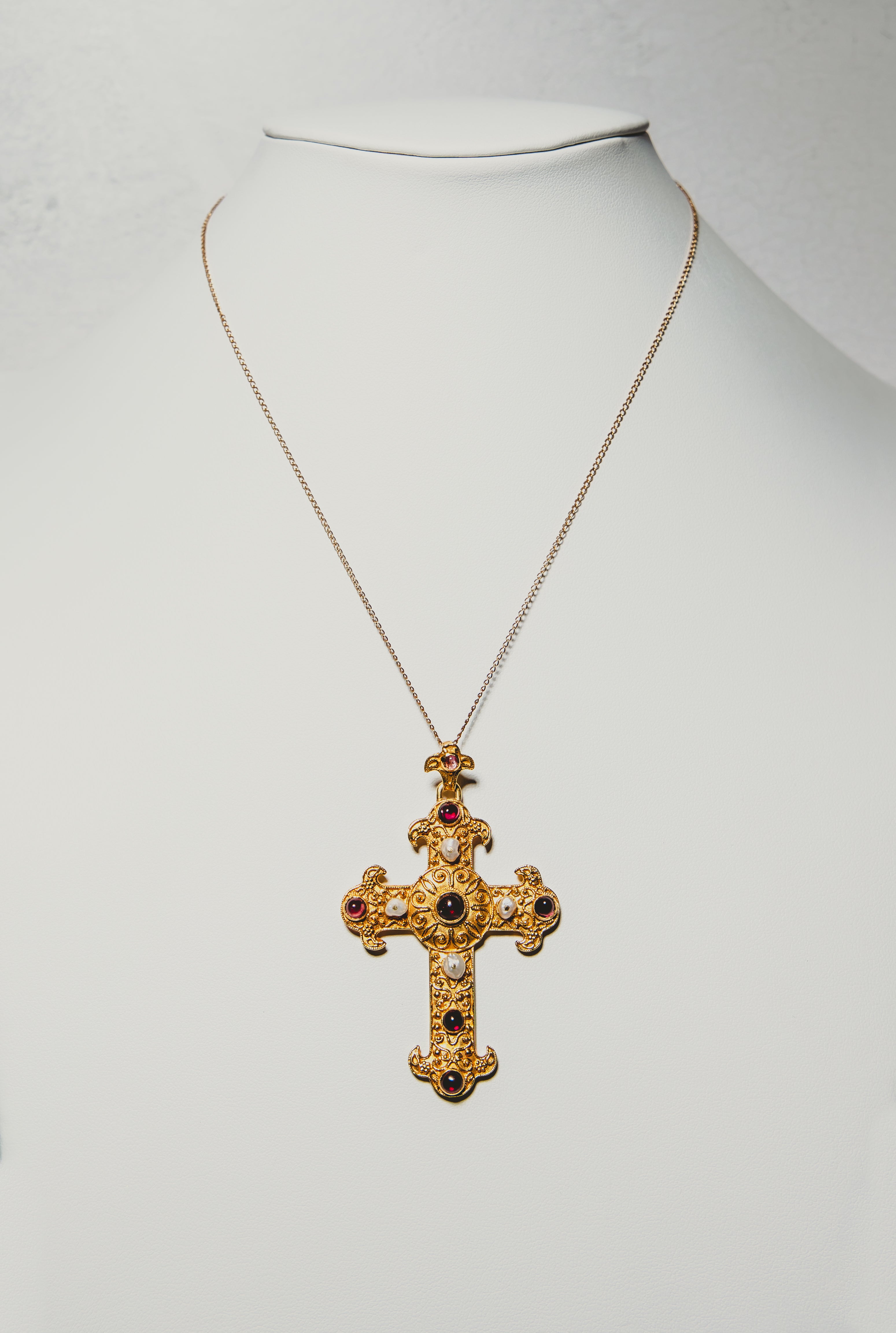 Stunning 18K gold cross with six rubies and four rare, natural pearls.