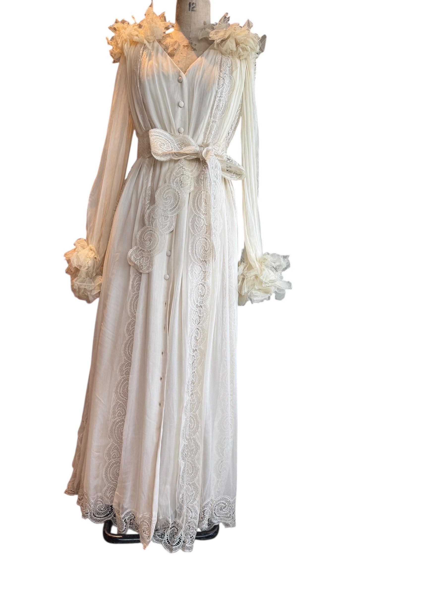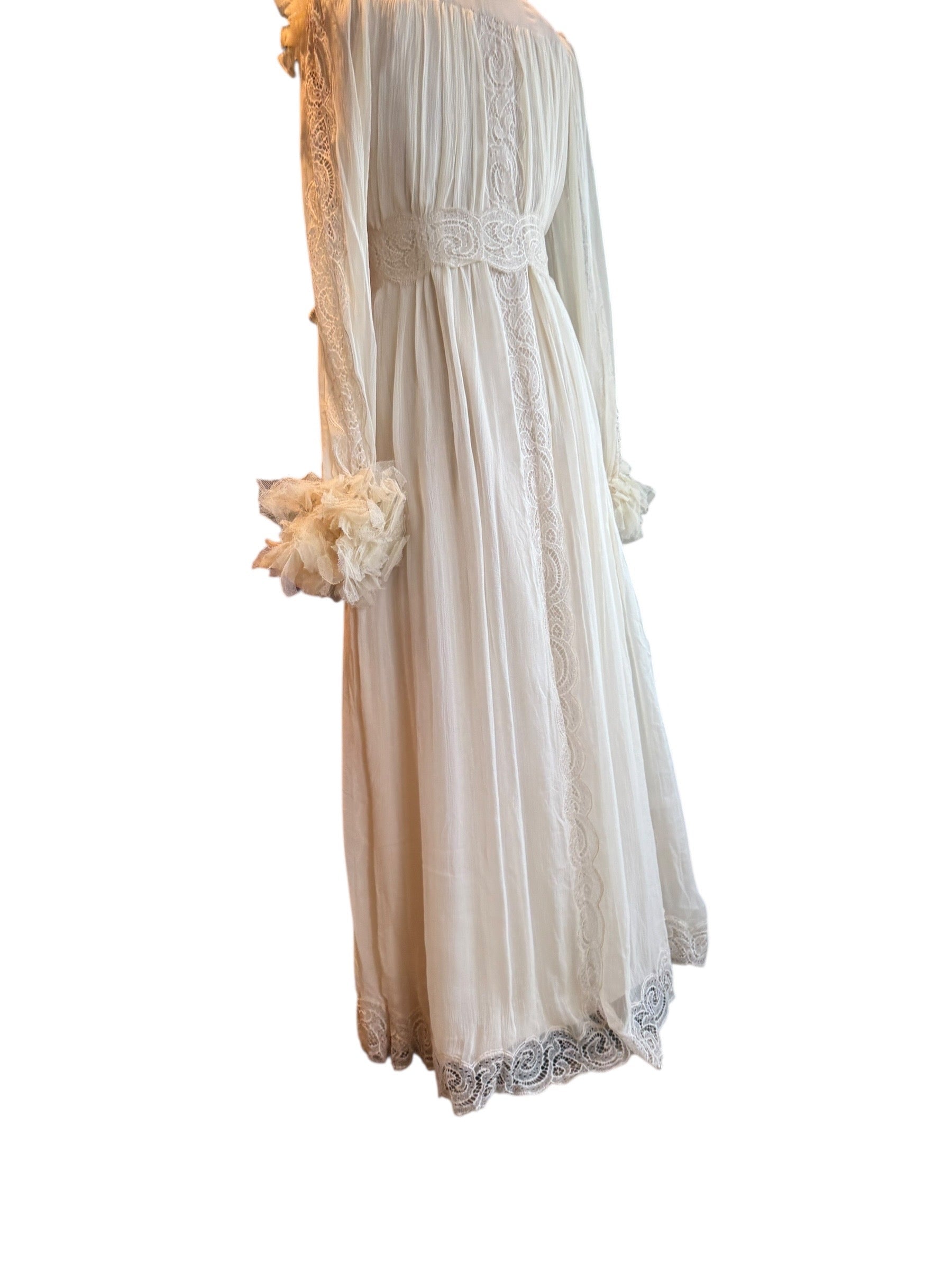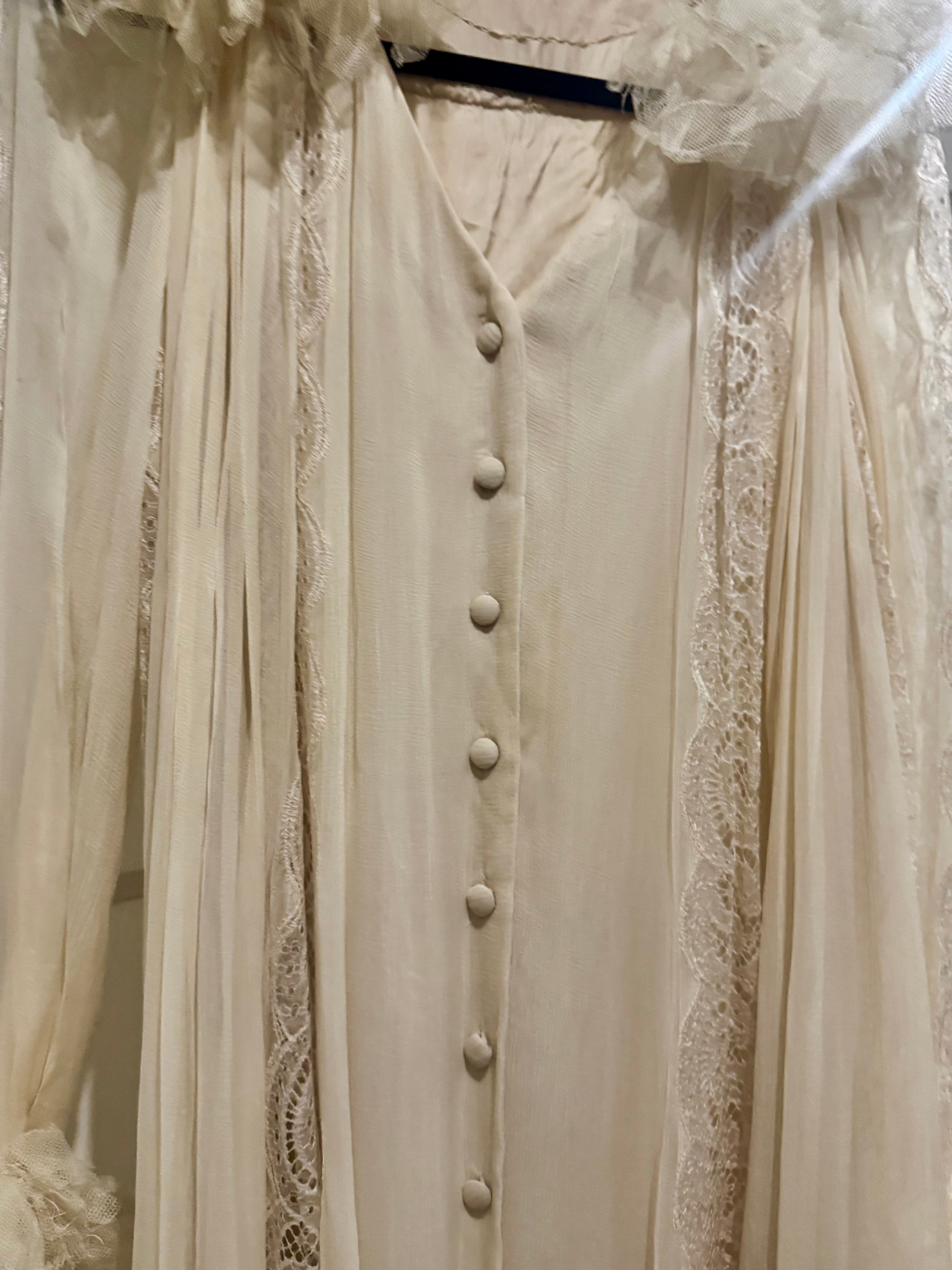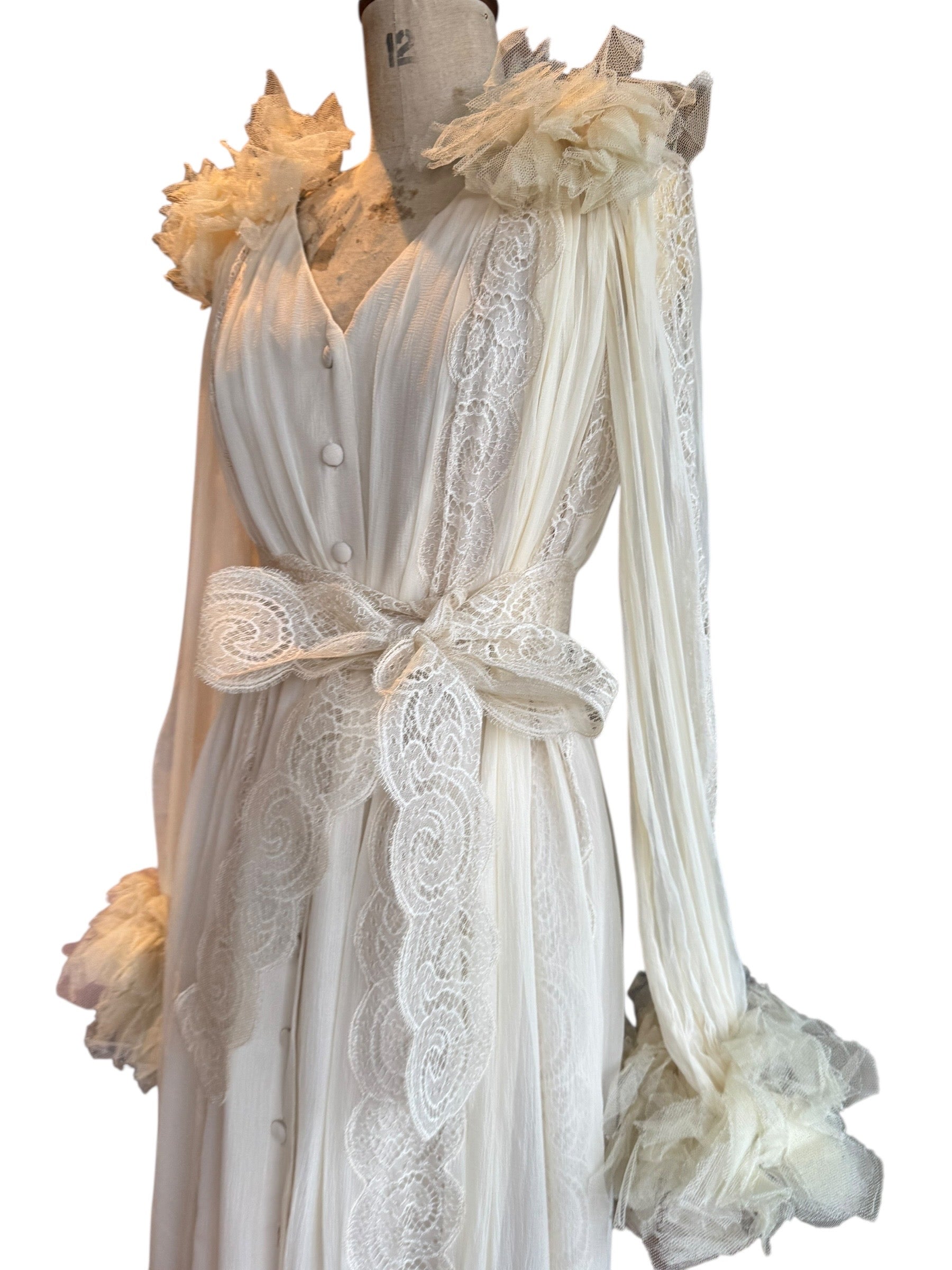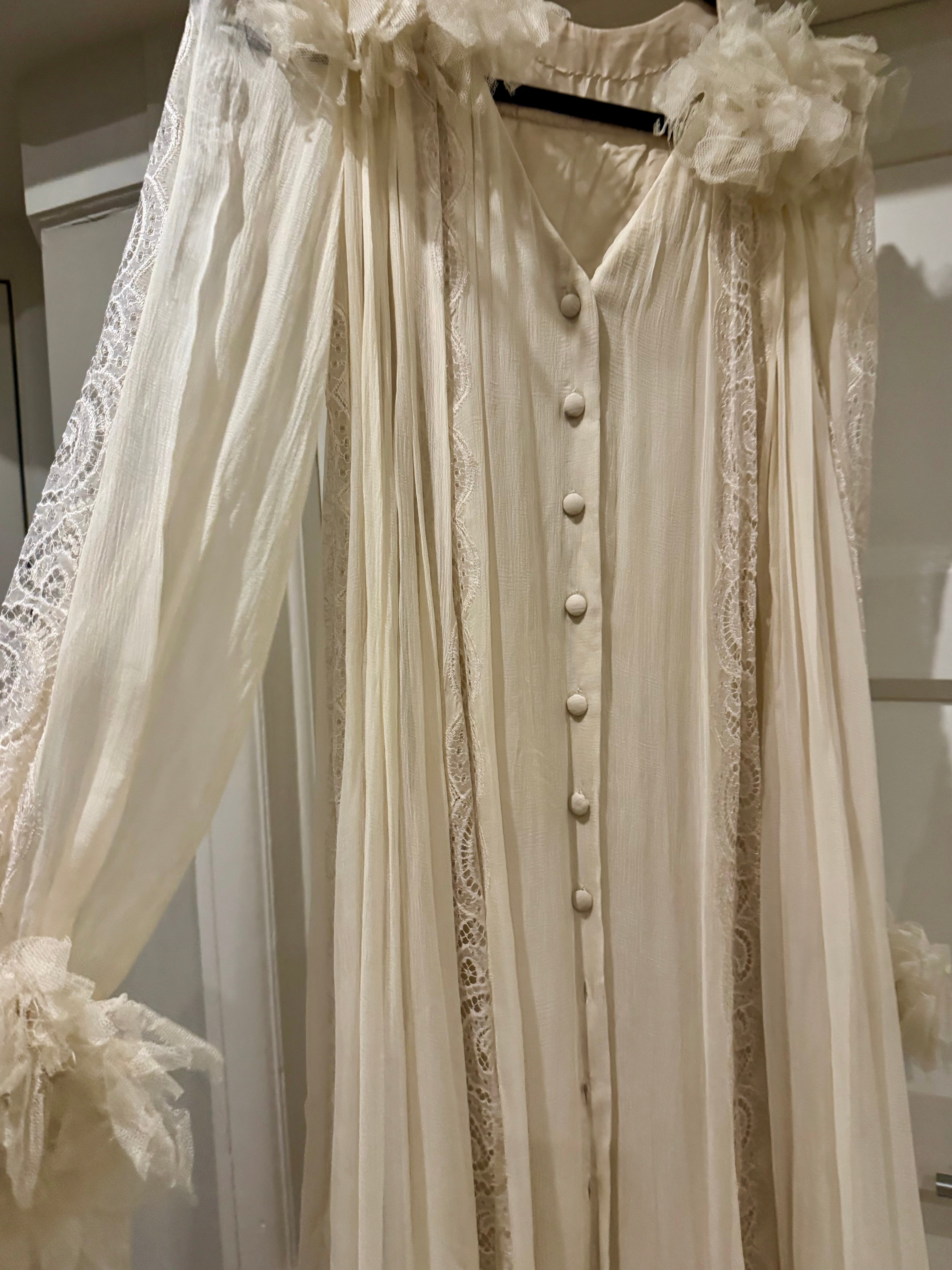 Experience timeless elegance with this early Chloé like 70s chiffon and lace dress. This ethereal white dress features delicate lace inserts on the sleeves and body and  a flattering V-neck design. Has covered front buttons and moves beautifully on the body.  Fully lined for comfort, the dress can be worn loose or cinched at the waist with the matching lace belt.
