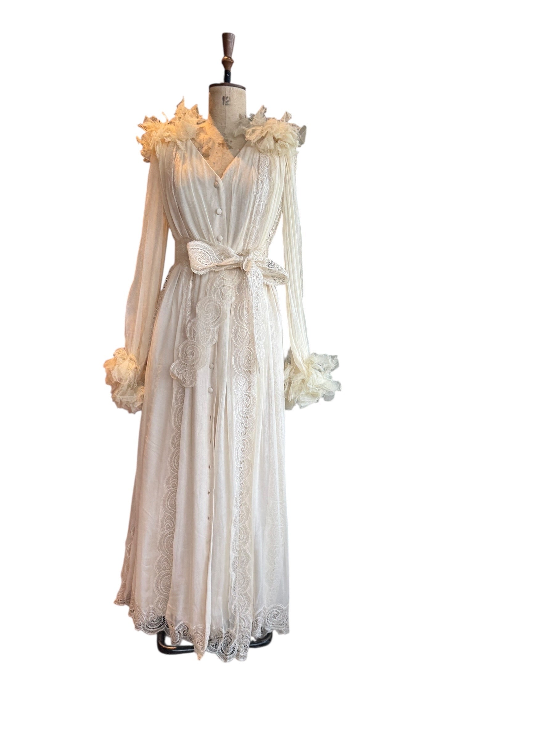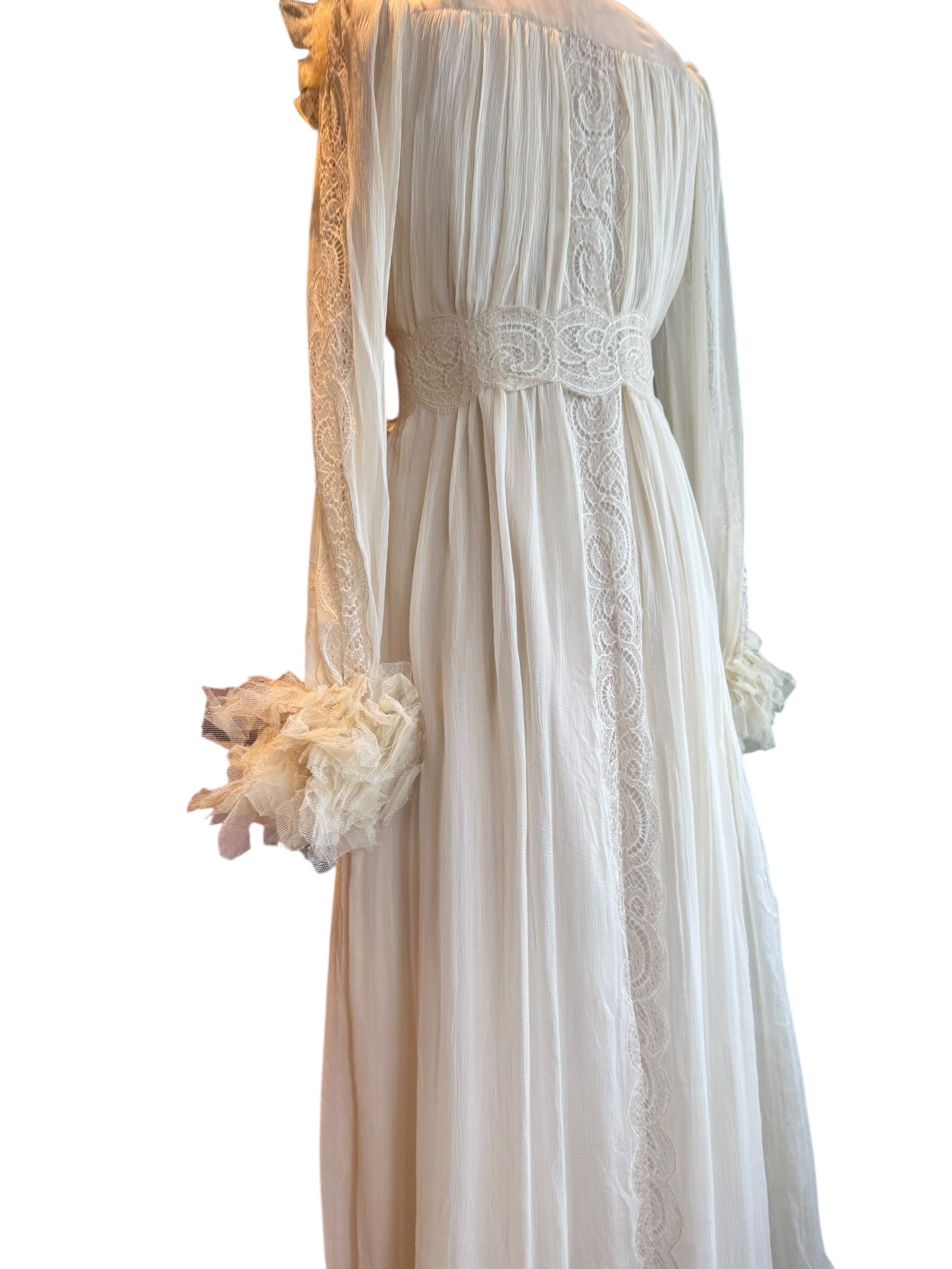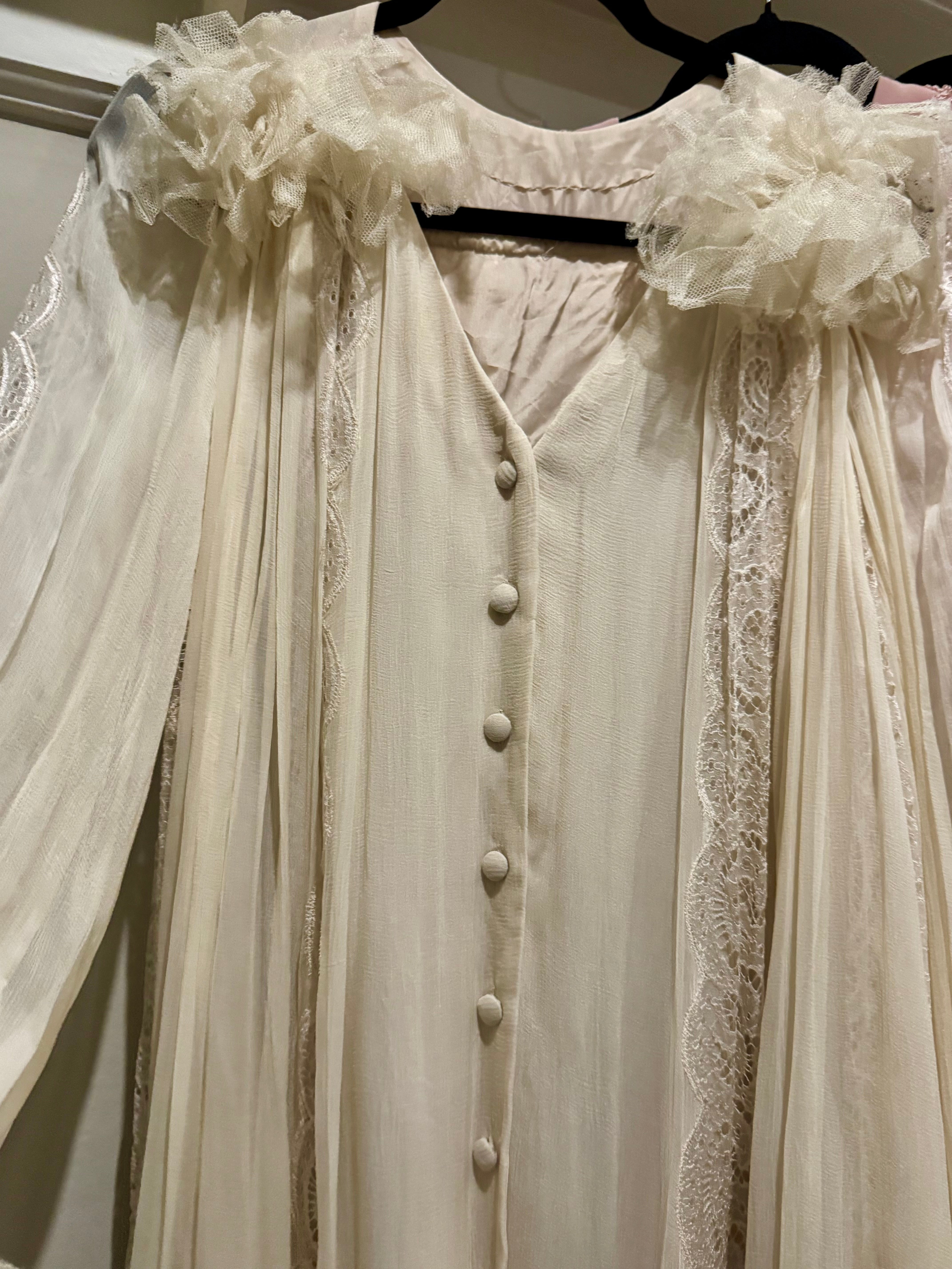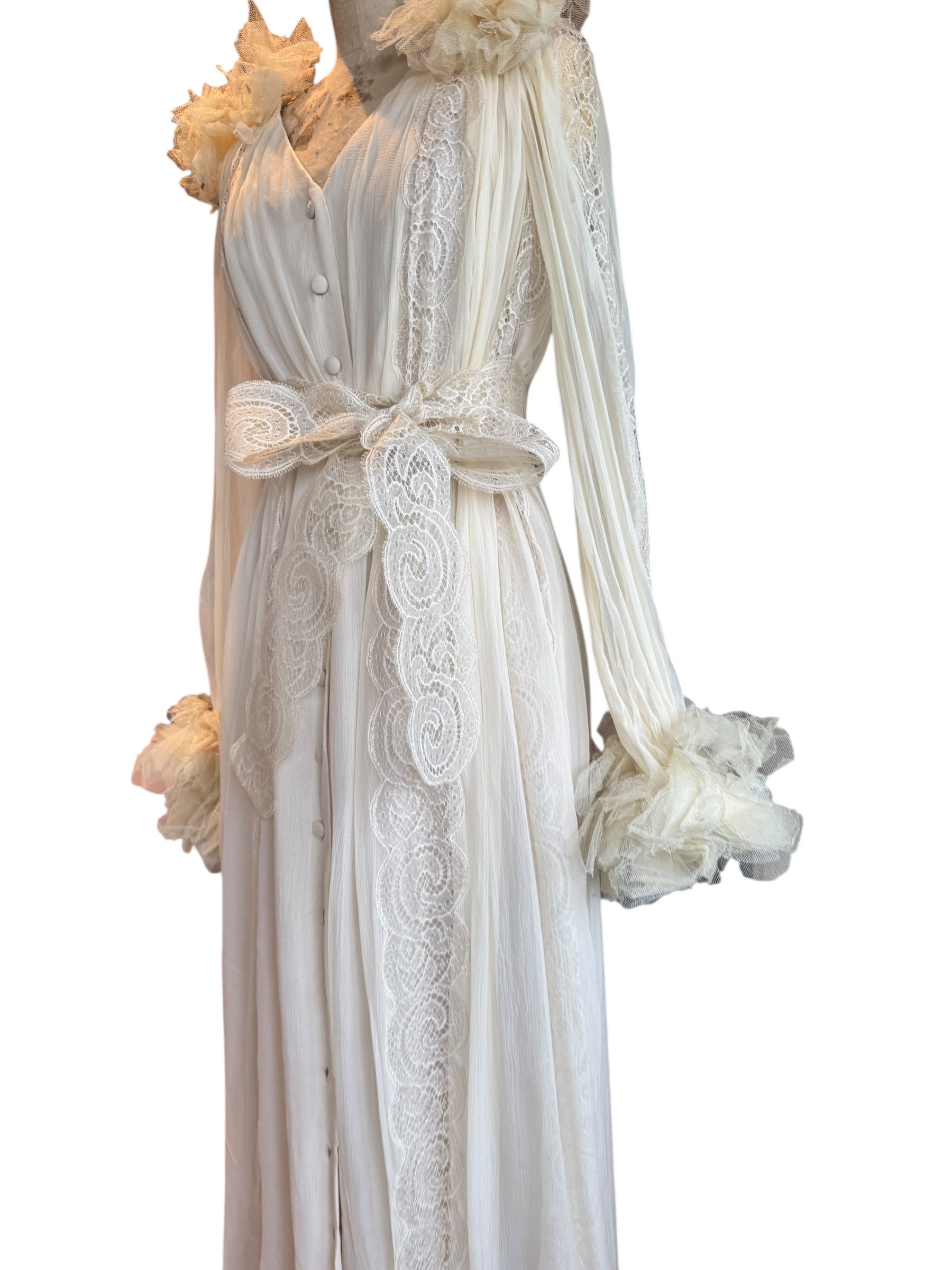 Experience timeless elegance with this early Chloé like 70s chiffon and lace dress. This ethereal white dress features delicate lace inserts on the sleeves and body and  a flattering V-neck design. Has covered front buttons and moves beautifully on the body.  Fully lined for comfort, the dress can be worn loose or cinched at the waist with the matching lace belt.