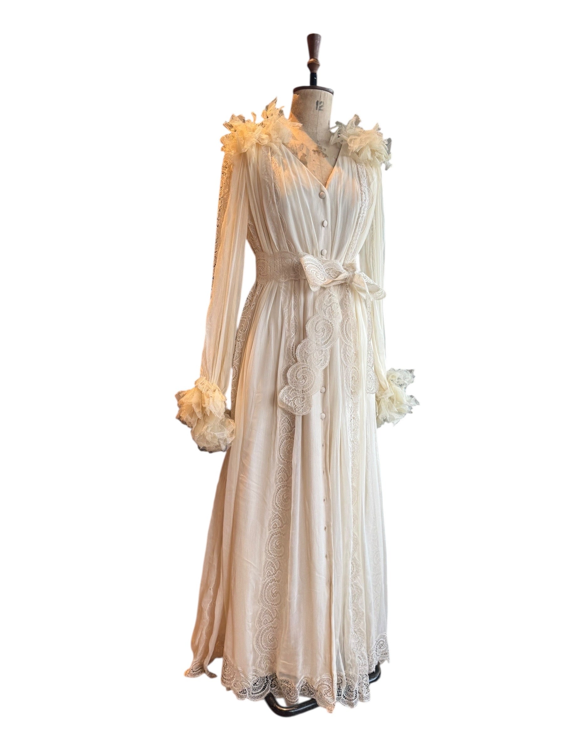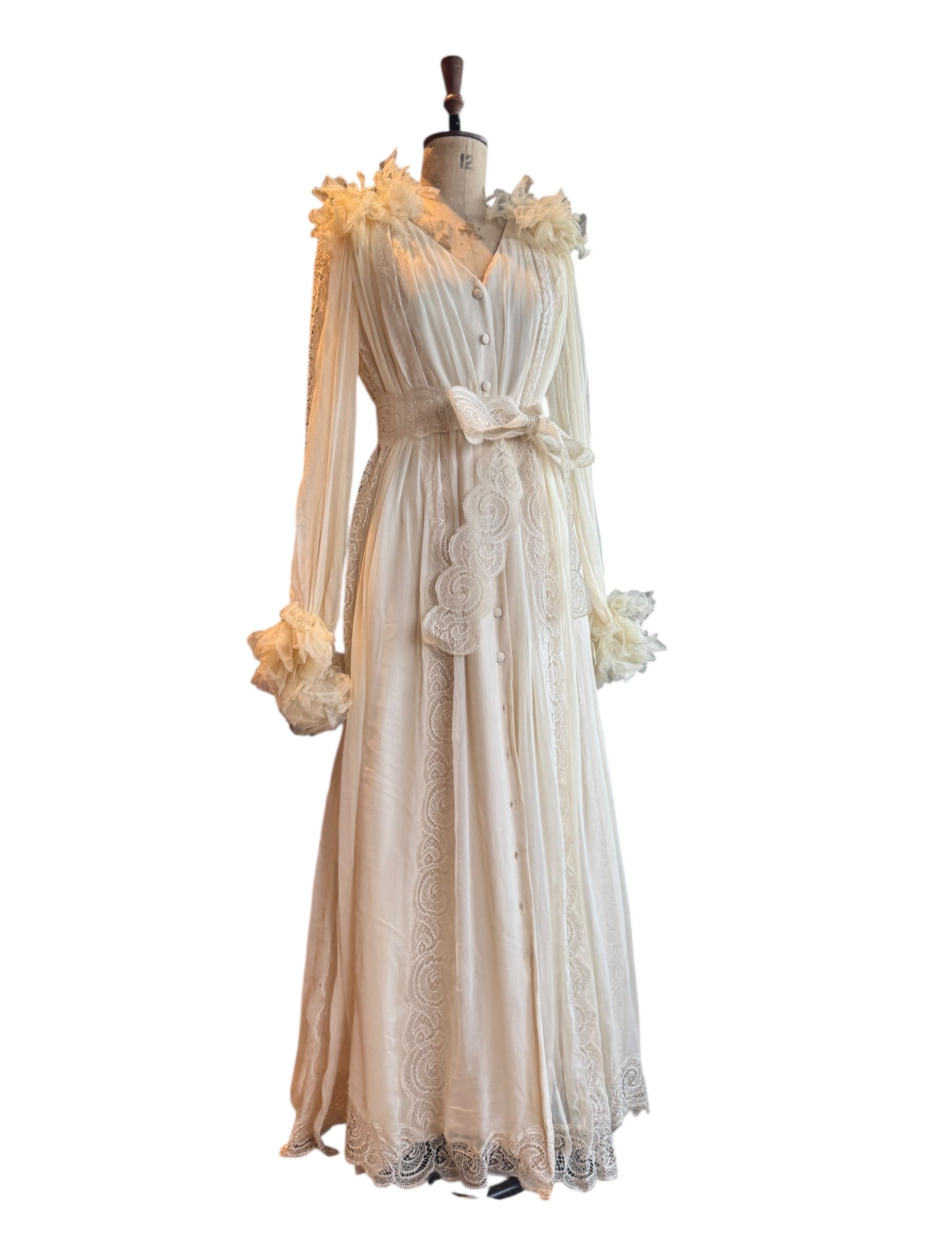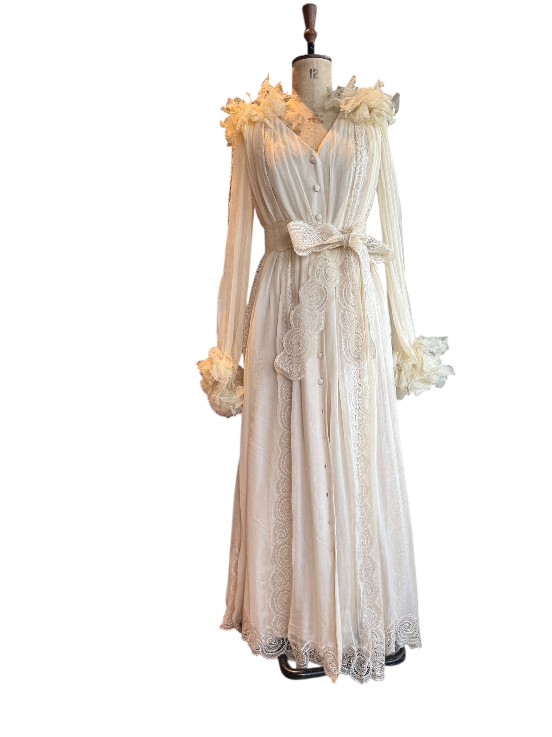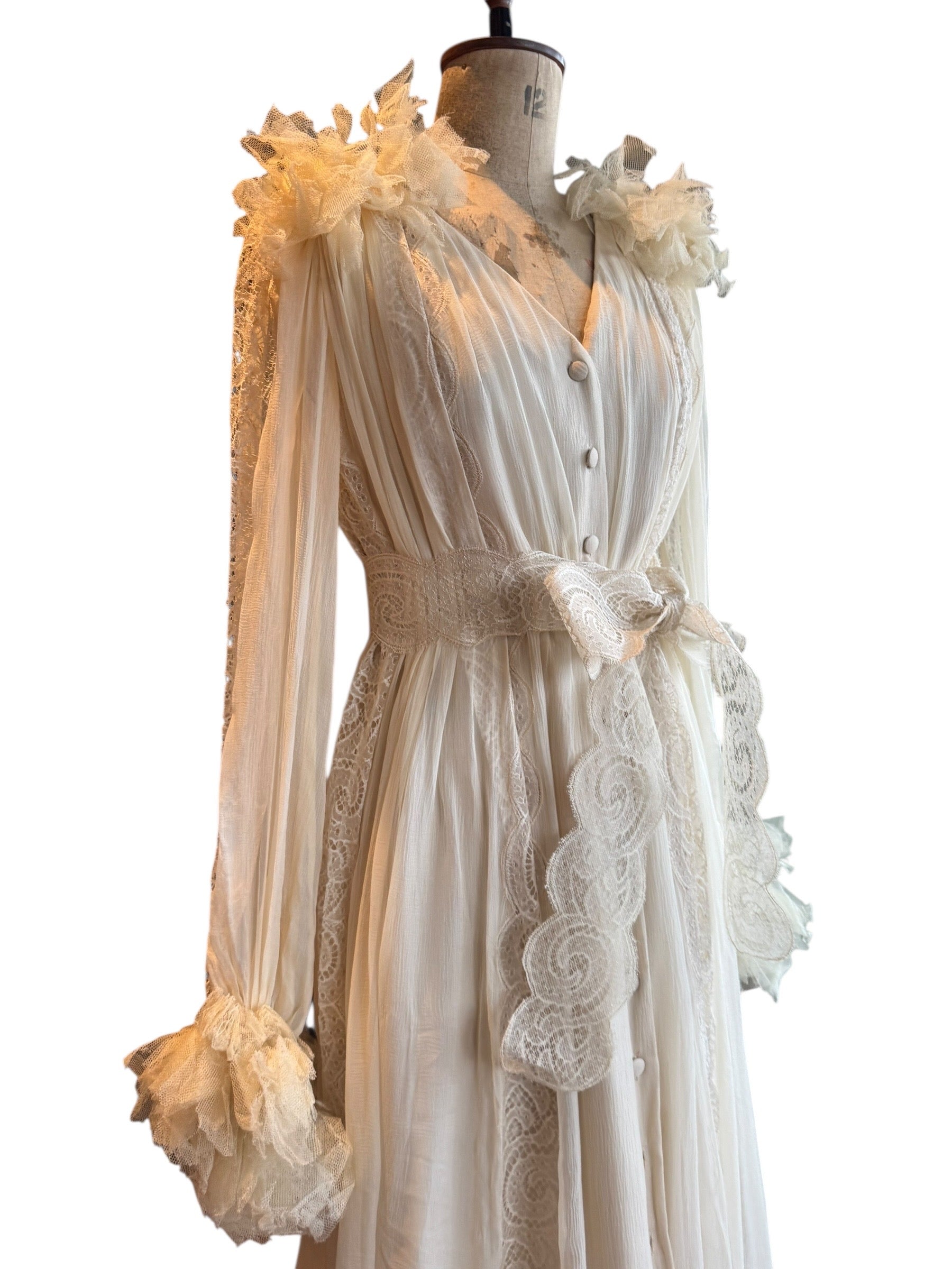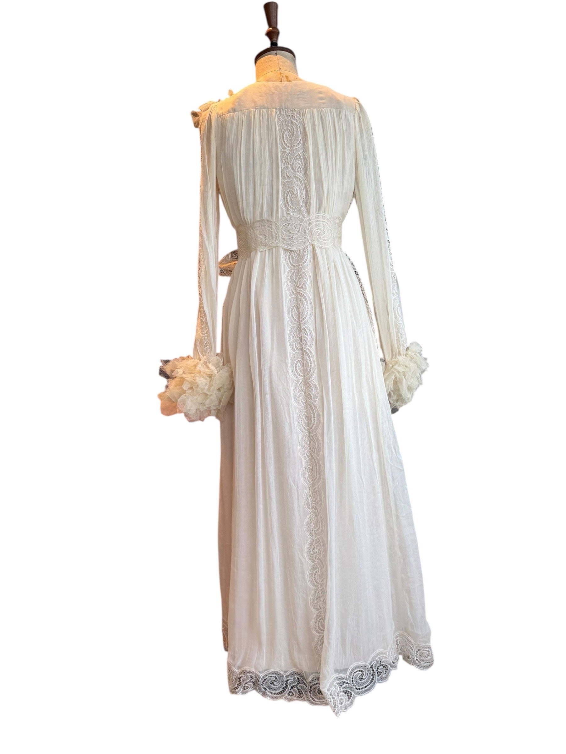 Experience timeless elegance with this early Chloé like 70s chiffon and lace dress. This ethereal white dress features delicate lace inserts on the sleeves and body and  a flattering V-neck design. Has covered front buttons and moves beautifully on the body.  Fully lined for comfort, the dress can be worn loose or cinched at the waist with the matching lace belt.