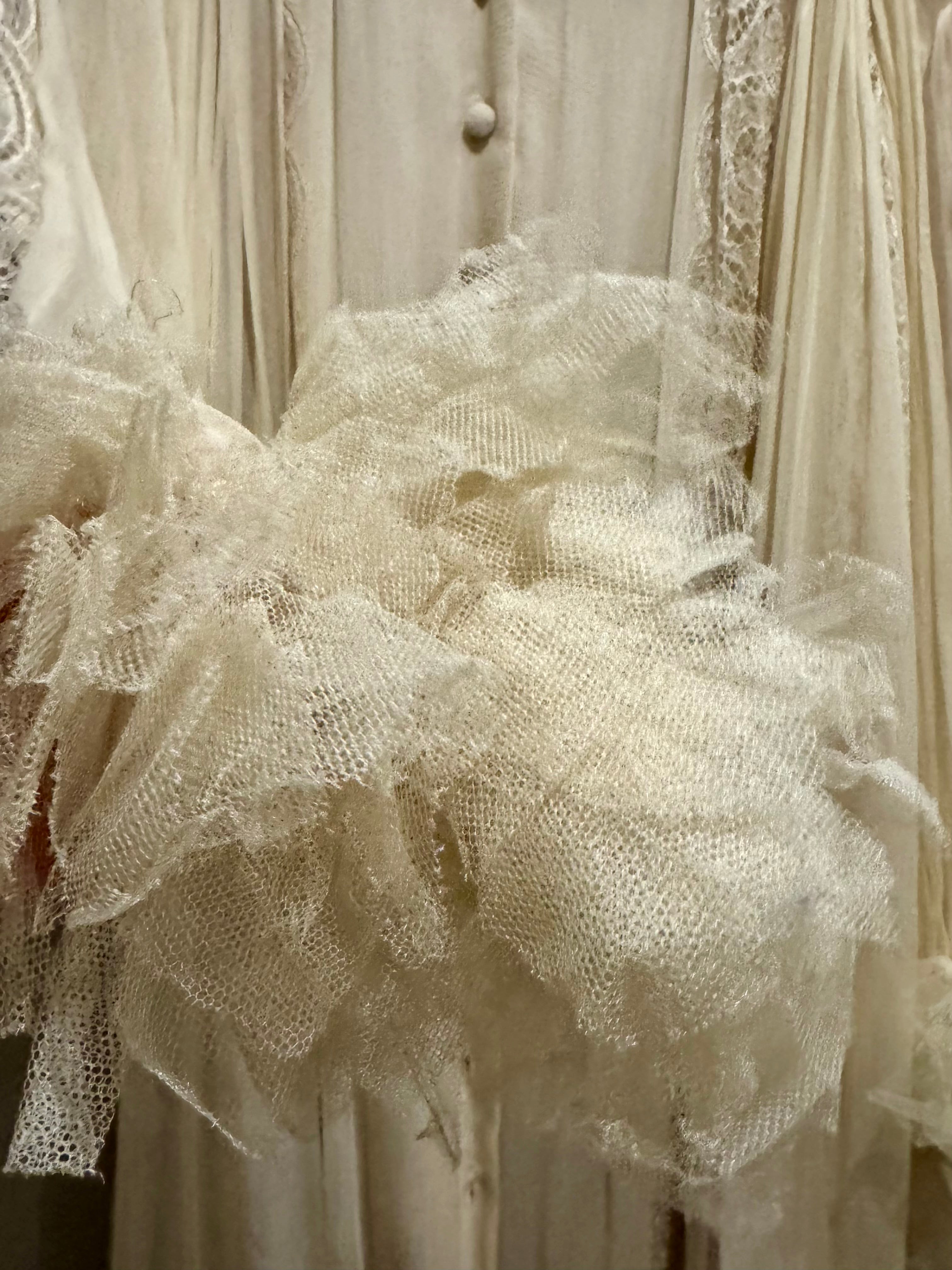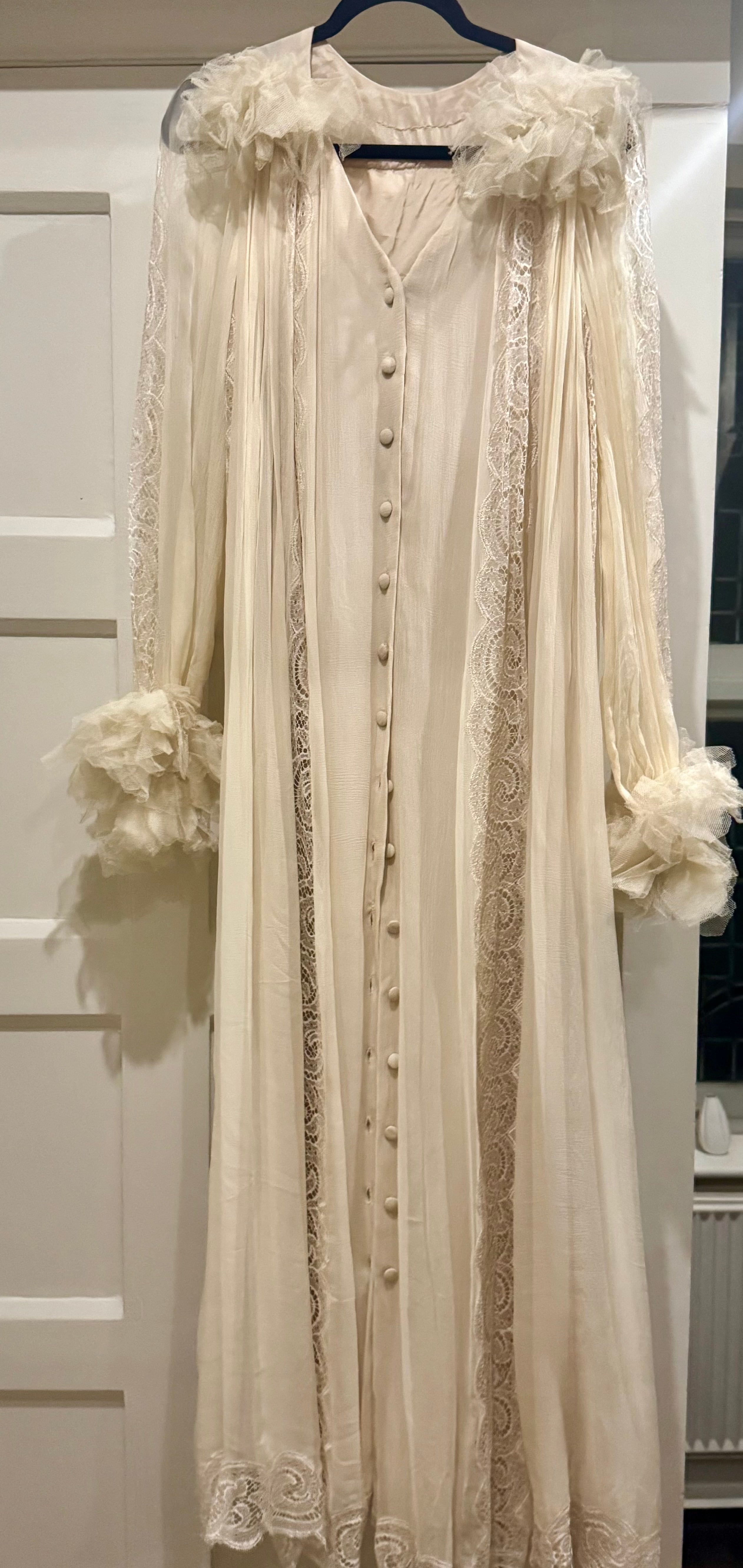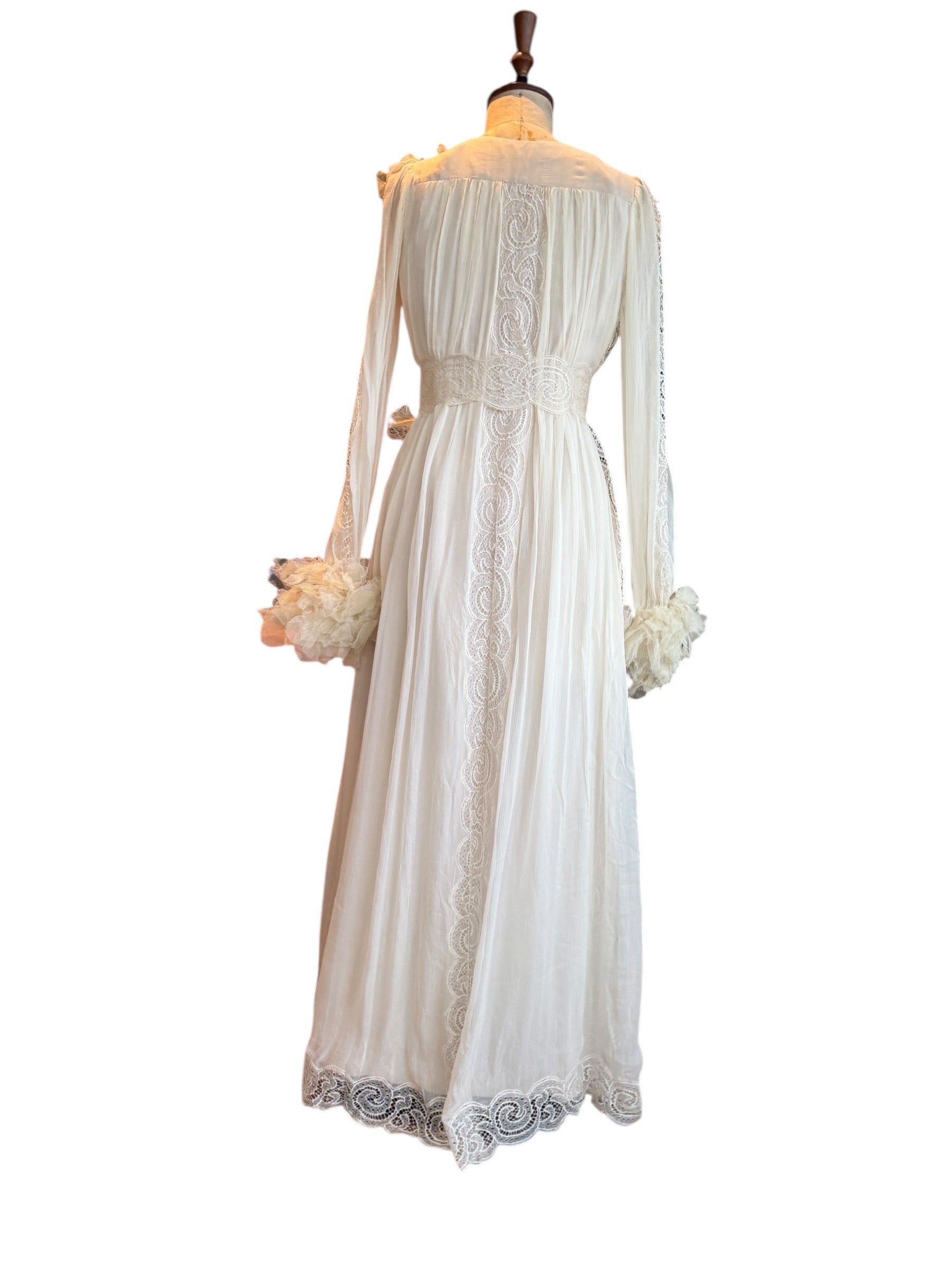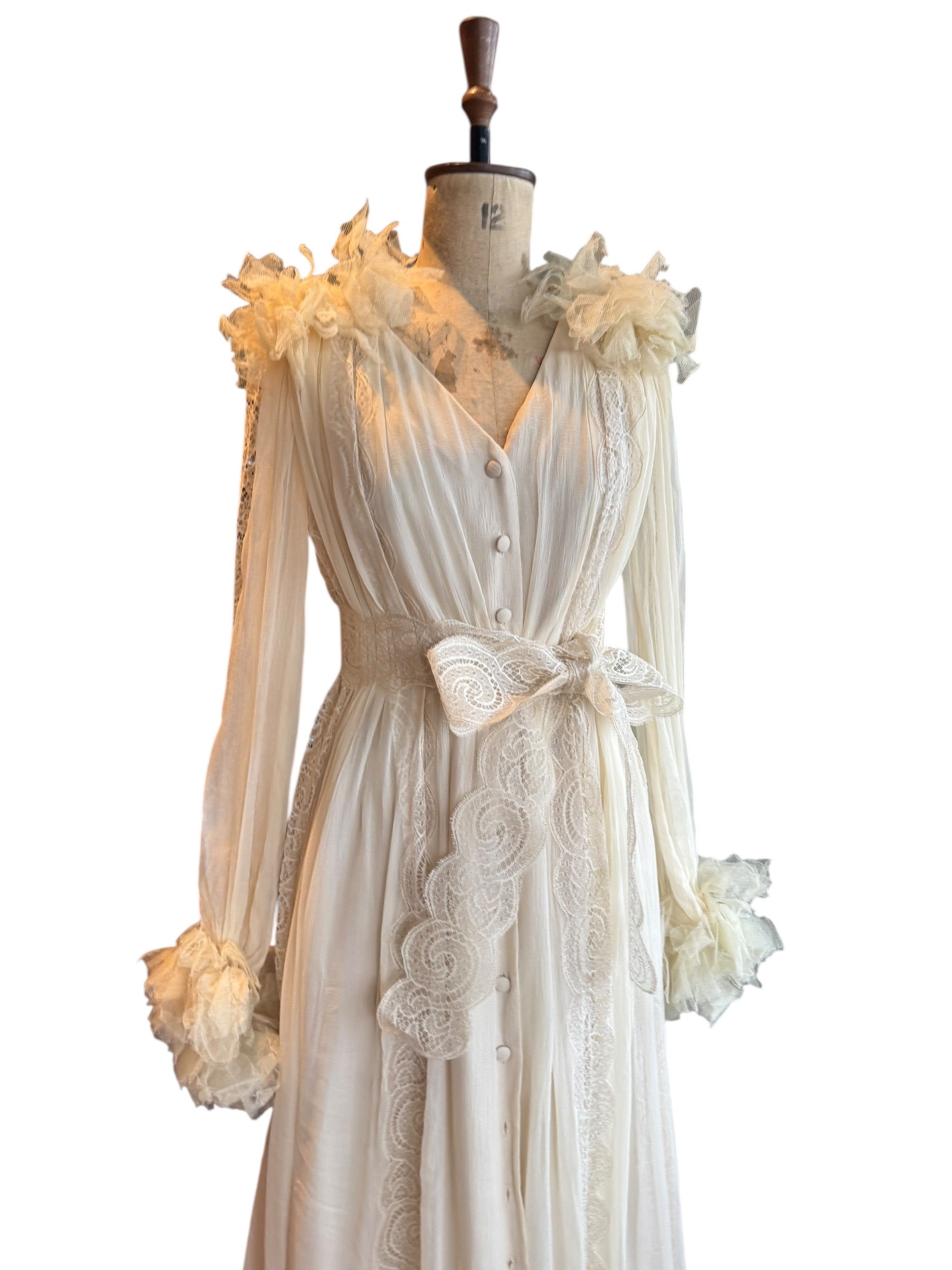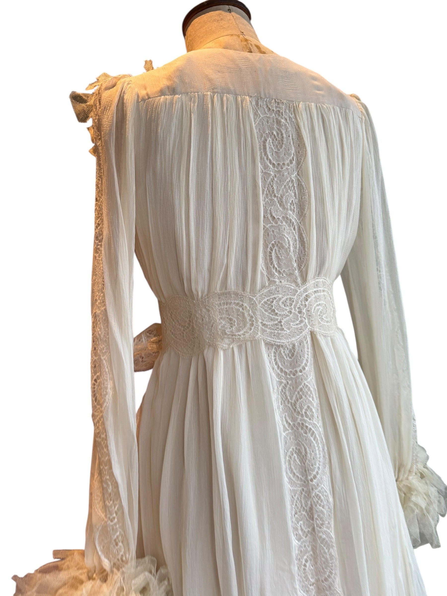 Experience timeless elegance with this early Chloé like 70s chiffon and lace dress. This ethereal white dress features delicate lace inserts on the sleeves and body and  a flattering V-neck design. Has covered front buttons and moves beautifully on the body.  Fully lined for comfort, the dress can be worn loose or cinched at the waist with the matching lace belt.