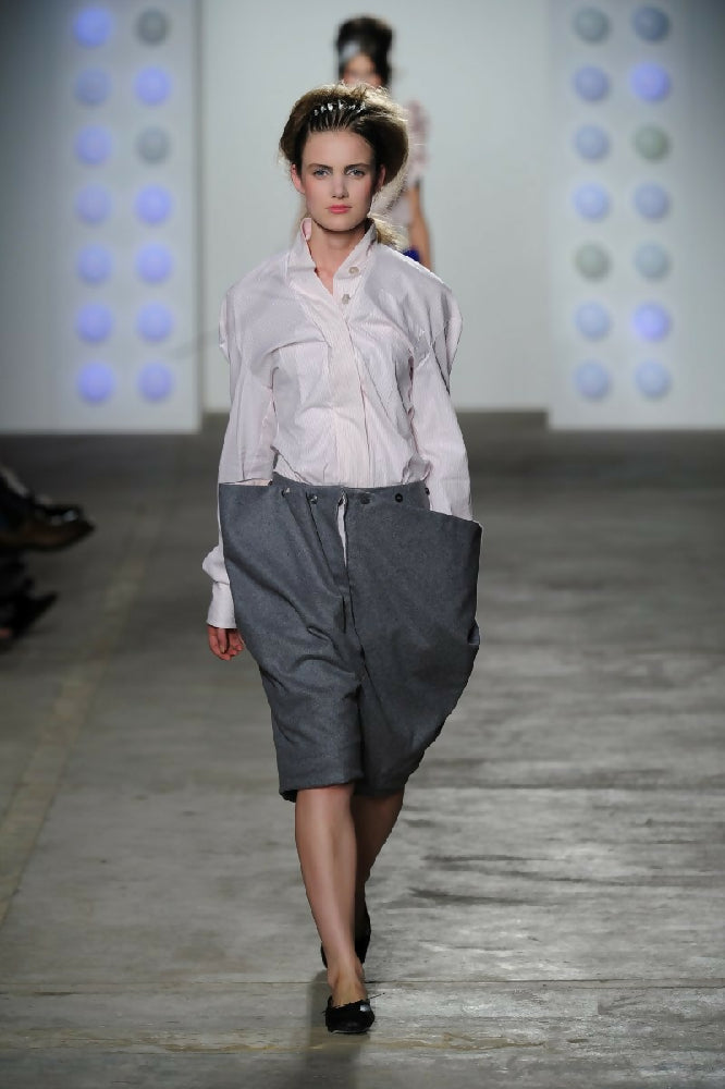 Knot shirt S/S 2011: Long sleeved bias cut fitted shirt has a centre front double placket with buttons and a side pocket. The back of the shirt is cut into an asymmetrical shape and has two centre back ties that tie into a knot. Fabric:100% cotton in light pink and white pinstripe. Size 10