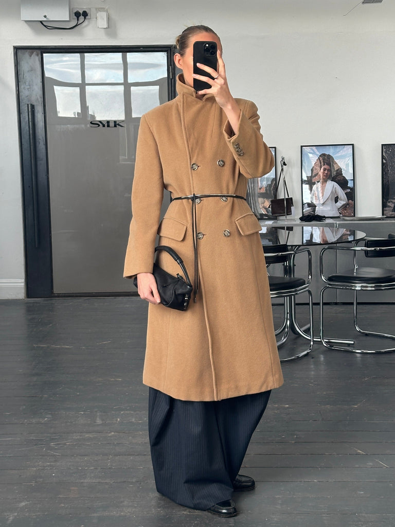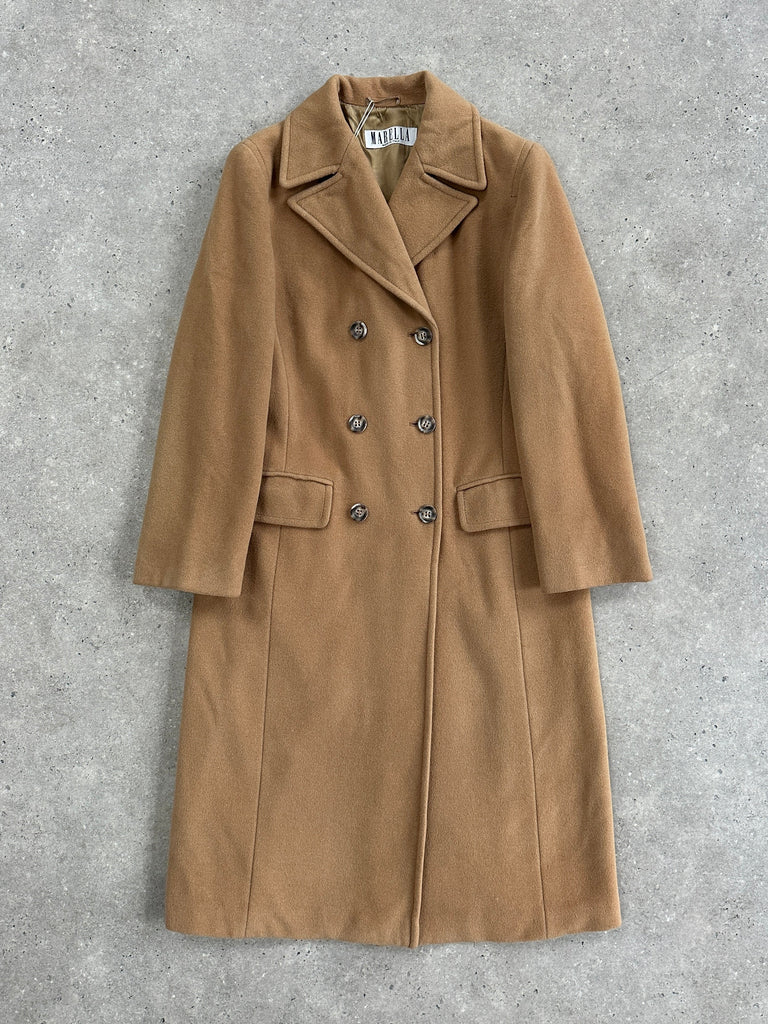 Vintage warm tan tone in a refined 1990s silhouette, this Marella double-breasted coat is crafted in Italy from a soft virgin wool and angora blend. The tailored structure and clean lines give it a timeless quiet-luxury feel.