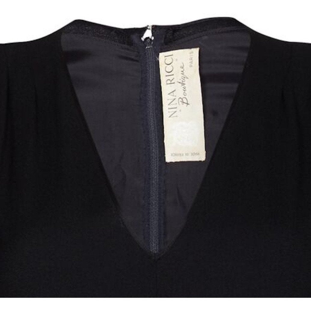 This dramatic Nina Ricci 1980s cocktail dress is silk lined with a black wool crepe overlay and a silk taffeta peplum. The peplum unfolds in soft pleats and graduates in a descending V-shape from the centre reverse at the waist and finishing at the centre front of the skirt at the hem. Pleats are stitched down towards the waistband to flatter the navel, before falling open at the front to reveal the crepe pencil-style underskirt. This showpiece is consolidated perfectly by a large taffeta bow that embellishes the accompanying sash to be worn around the waist. A sharply plunging V neckline on the bodice echoes the form of the skirt, and neatly stitched pleats atop of each shoulder accentuate the puff shoulder detail. This piece is beautifully constructed with ribbon finishing on the hems and cuffs, and interior hook and eye fastenings to further shape the waistline. There is a central zip fastening at the reverse. In superb condition, would best fit US size 2-4, UK size 6-8.