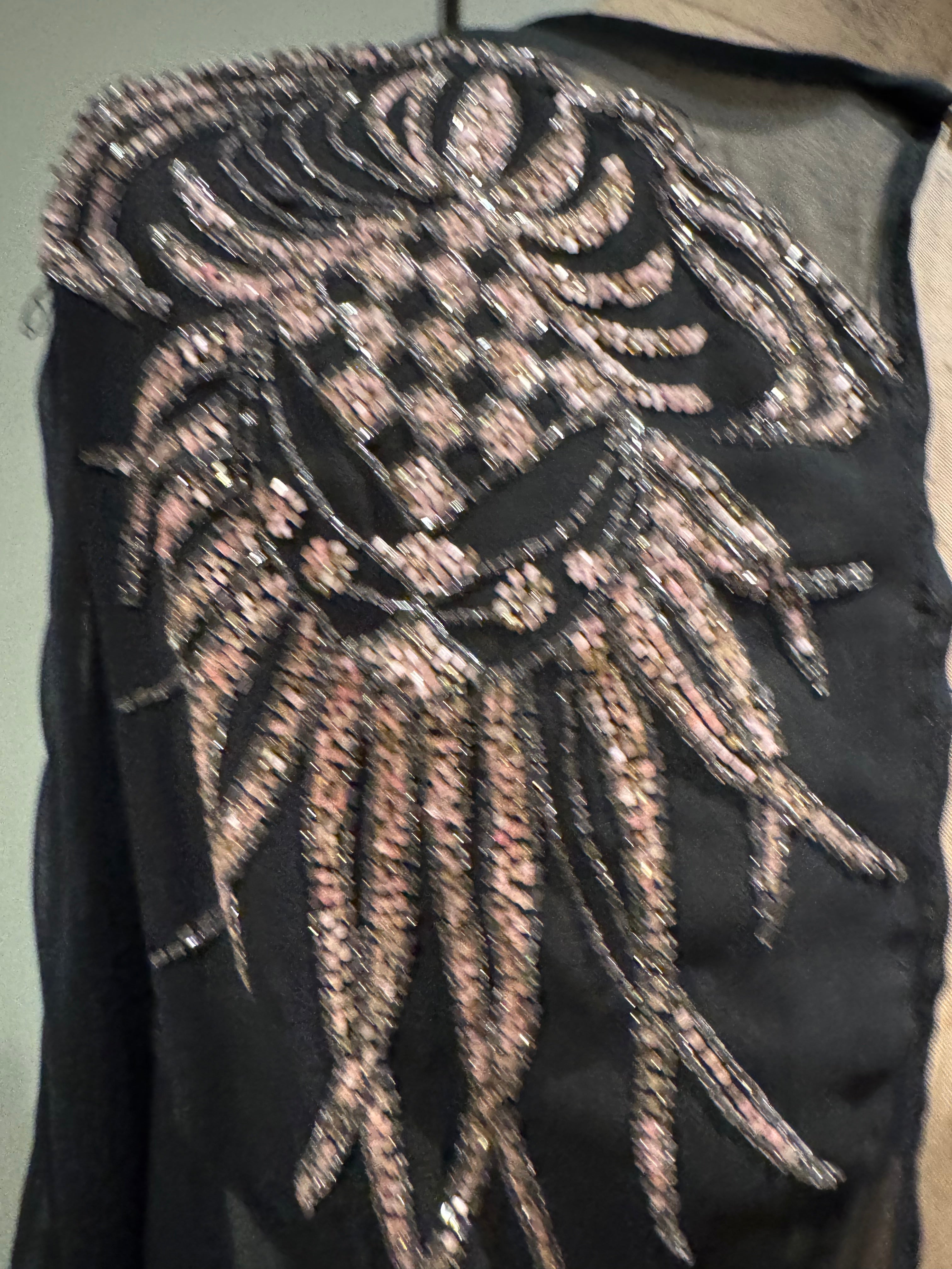 Experience the glamour of the 1920s with this one of a kind chiffon Kaftan. Made from luxurious silk, this black kaftan features an intricate beaded design in blush pink on the shoulders and back. Perfect as a cover-up forany occasion, it can be worn over a slip dress or as a beach cover up. A truly timeless and unique piece.