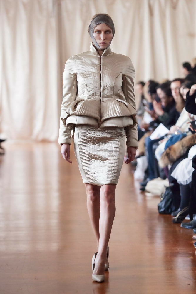 Pale Gold Structured Jacket A/W 2014: Three dimensional shaped and cut long sleeved hunched jacket, has fitted bodice on the inside to pull in outer sides, so the back outer shape pops out. The centre front, sides, sleeves and back of the jacket has padding sewn inside the outer fabric with heavy stitching sewn on top of the outside. The centre front has hook and eye closures for opening and closing. The collar stands high with a slight curve around the edges. The back of the jacket is cut into an oval shaped curve, with seams starting from the top back sides of the shoulders down to hem. This gives the back of the jacket an oval shape. Two front peplums on each side of waist gives the jacket an exaggerated shape. Outer Fabric: 53%SE, 41%PL, 6%PA in pale gold. Lining: 53%SE, 41%PL, 6%PA in pale gold. Size 10 LAST ONE