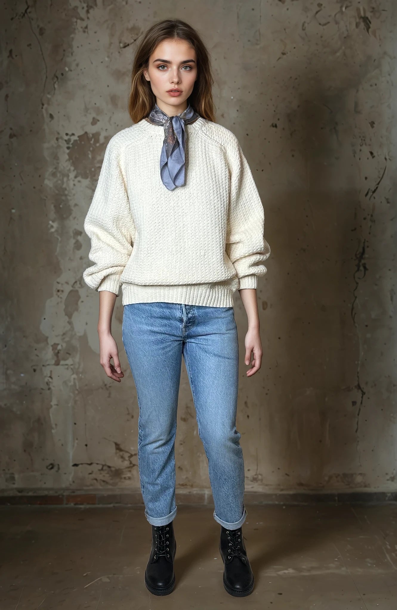 This chunky knit jumper made from a wool mix, provides comfort and warmth. UK size 8-14, the classic style and neutral cream colour makes it a timeless and versatile wardrobe essential for this season.