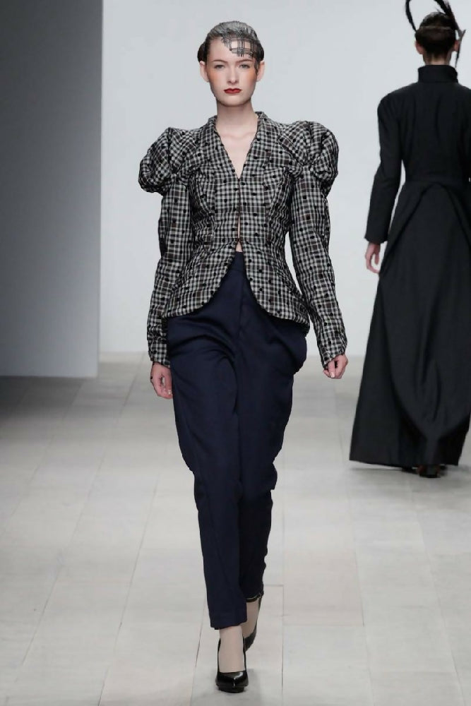 Rolled Padded Jacket with Dot Overlay A/W 2012: Fitted Jacket is cut into several panels, and has shaped sleeves that are gathered around the shoulders, a round front neckline with hook and eye closures sewn in the centre front. The Jacket has a tulle overlay with a small black dot. Outer fabric:100% cotton in black, dark green and red check on off white, 100% nylon tulle in black polka dot. Lining:100% silk satin in black. Size 10 LAST ONE