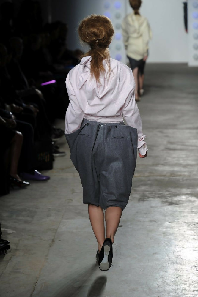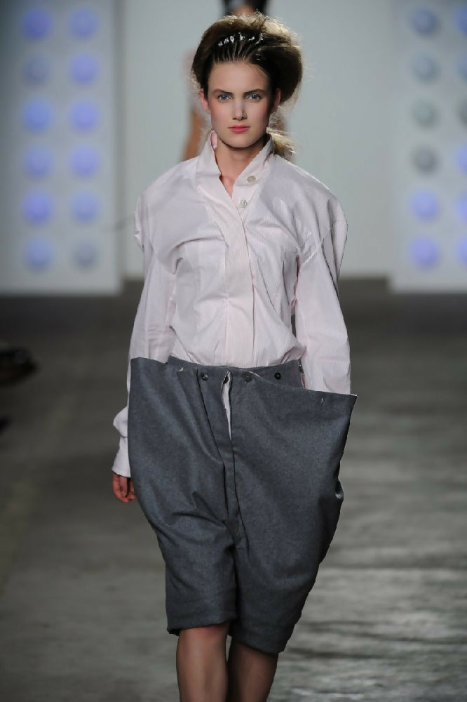 Schoolboy Short S/S 2011: Double layer short has buttons sewn around the top of the inside fitted short, and, button holes sewn in around the top of the outside larger short. The outer part of the short is cut larger with a low crotch and has button holes around the top edge which loop over the inside buttons around the top part of the inside fitted short. The back of the outer short has two jet pockets sewn in the short. Fabric: 90% wool 10% ws in grey. Lining:100% cotton in light pink and white pinstripe. Size 10 LAST ONE