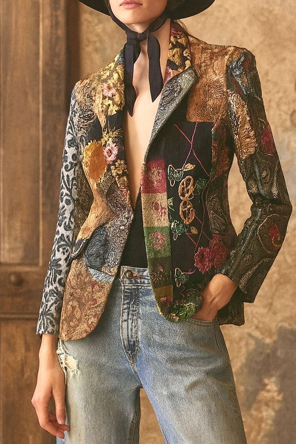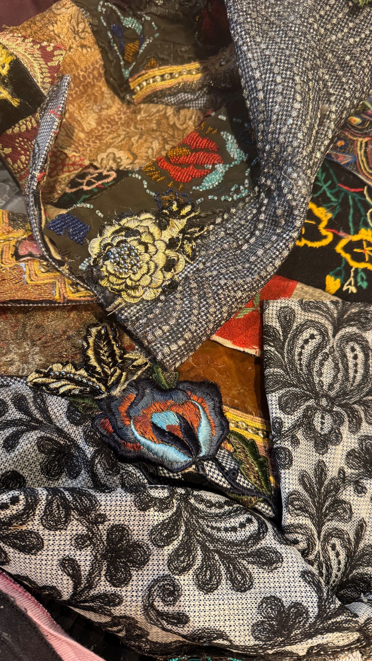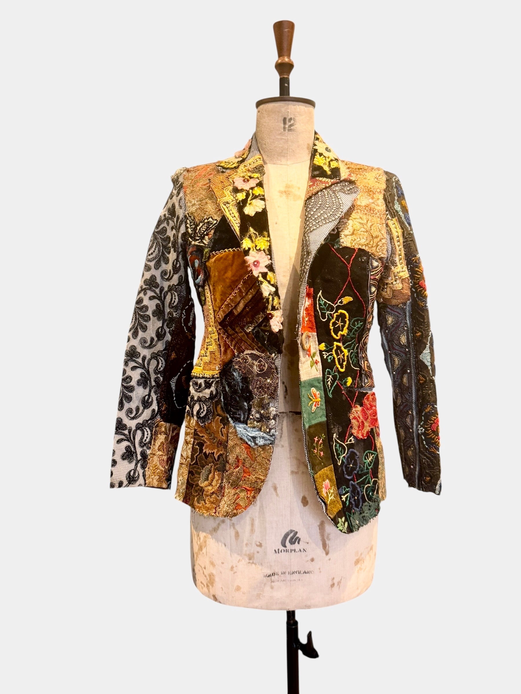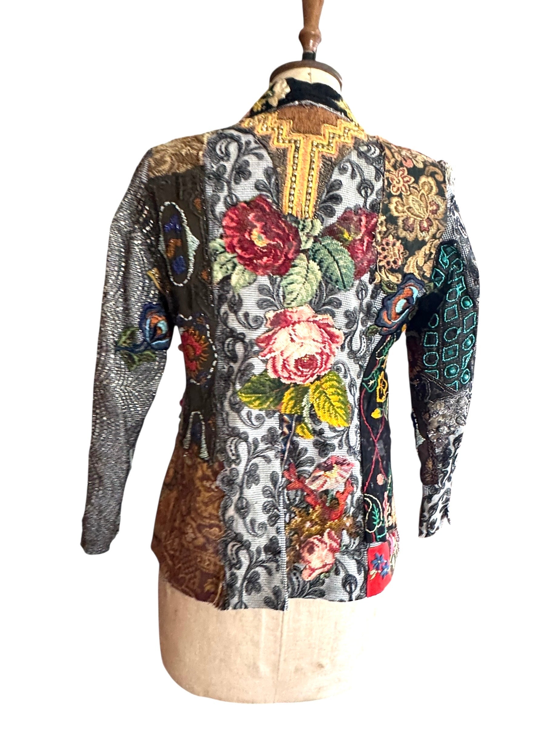 This well cut 70s single breasted jacket is a stunning reworked jacket and one-of-a-kind piece that features a medley of rare and collectible beadwork and embroidery from the 18th and 19th century. With long sleeves, lapel's, and a vintage two-tone button, this jacket exudes elegance and sophistication.