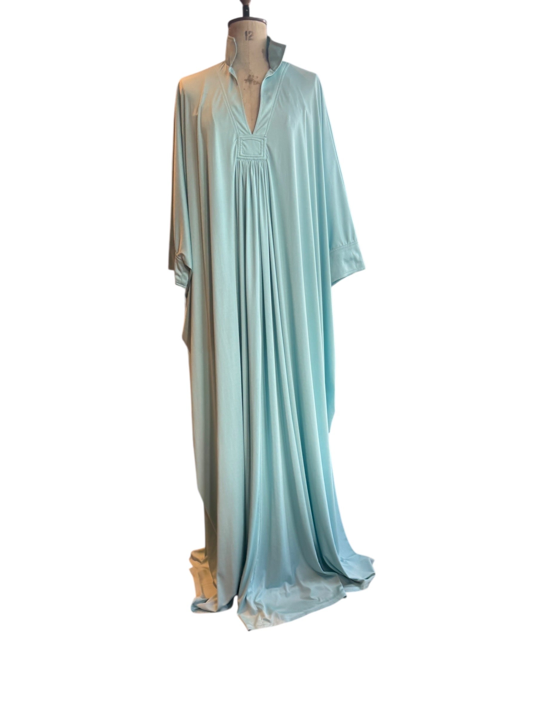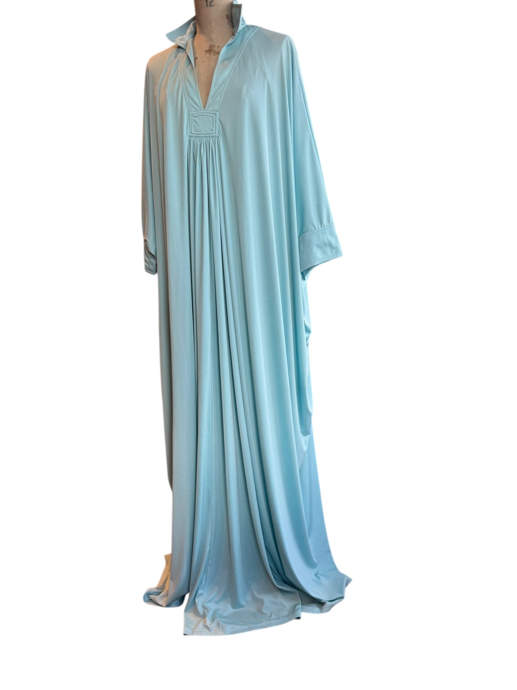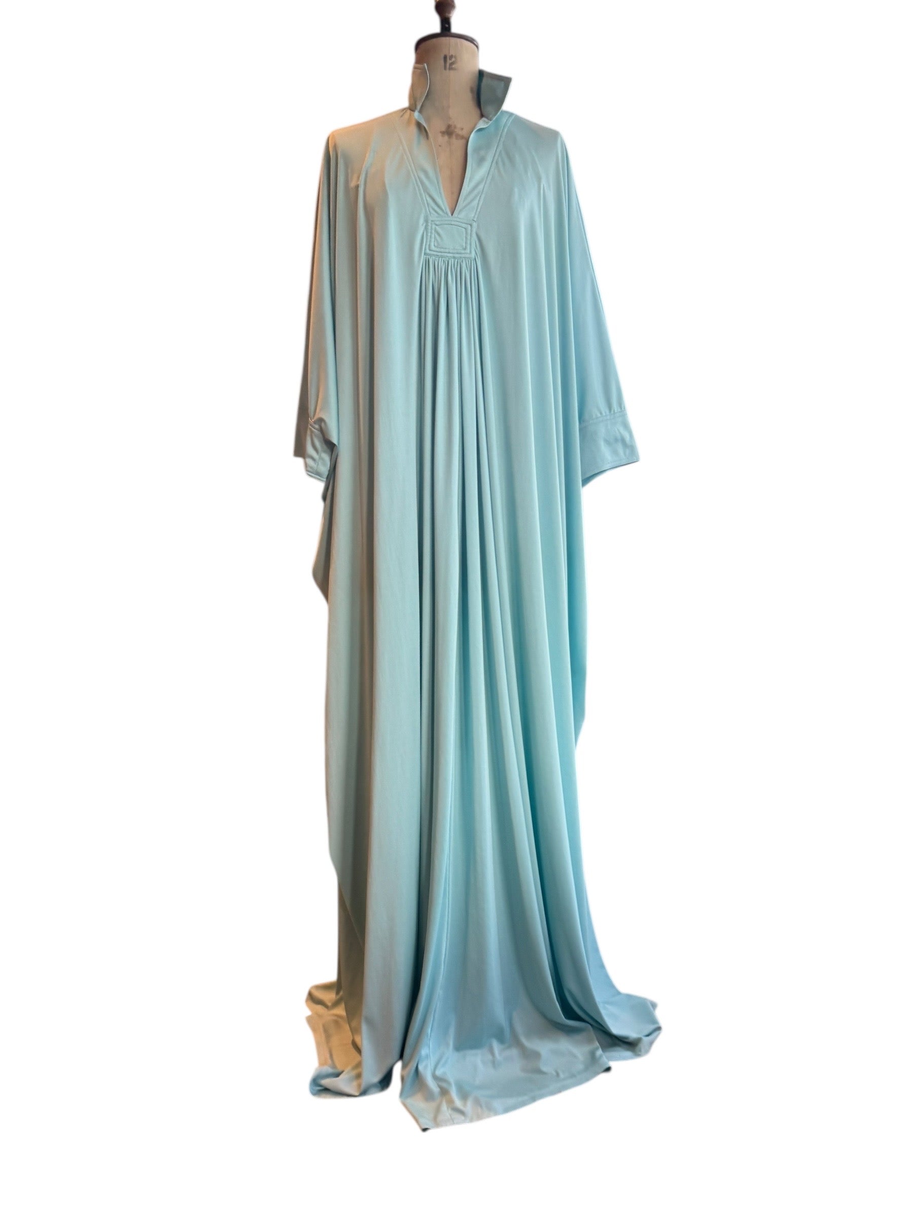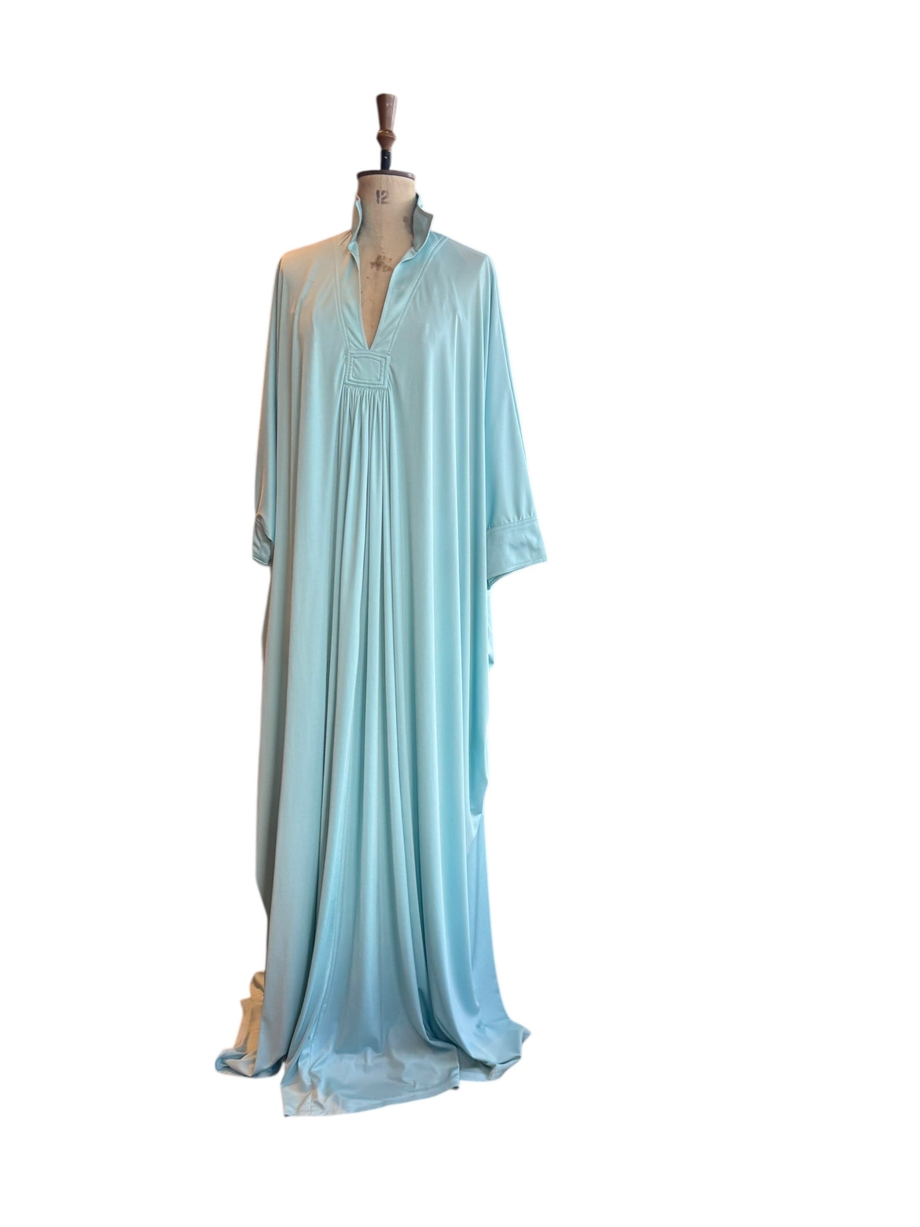 Fabulous Iconic Yuki  70s silk jersey powder blue kaftan dress. This rare and collectible piece features a V-neck line, angel batwing sleeves, and a floor-sweeping design. Perfect for poolside lounging or paired with boots for a bohemian look.