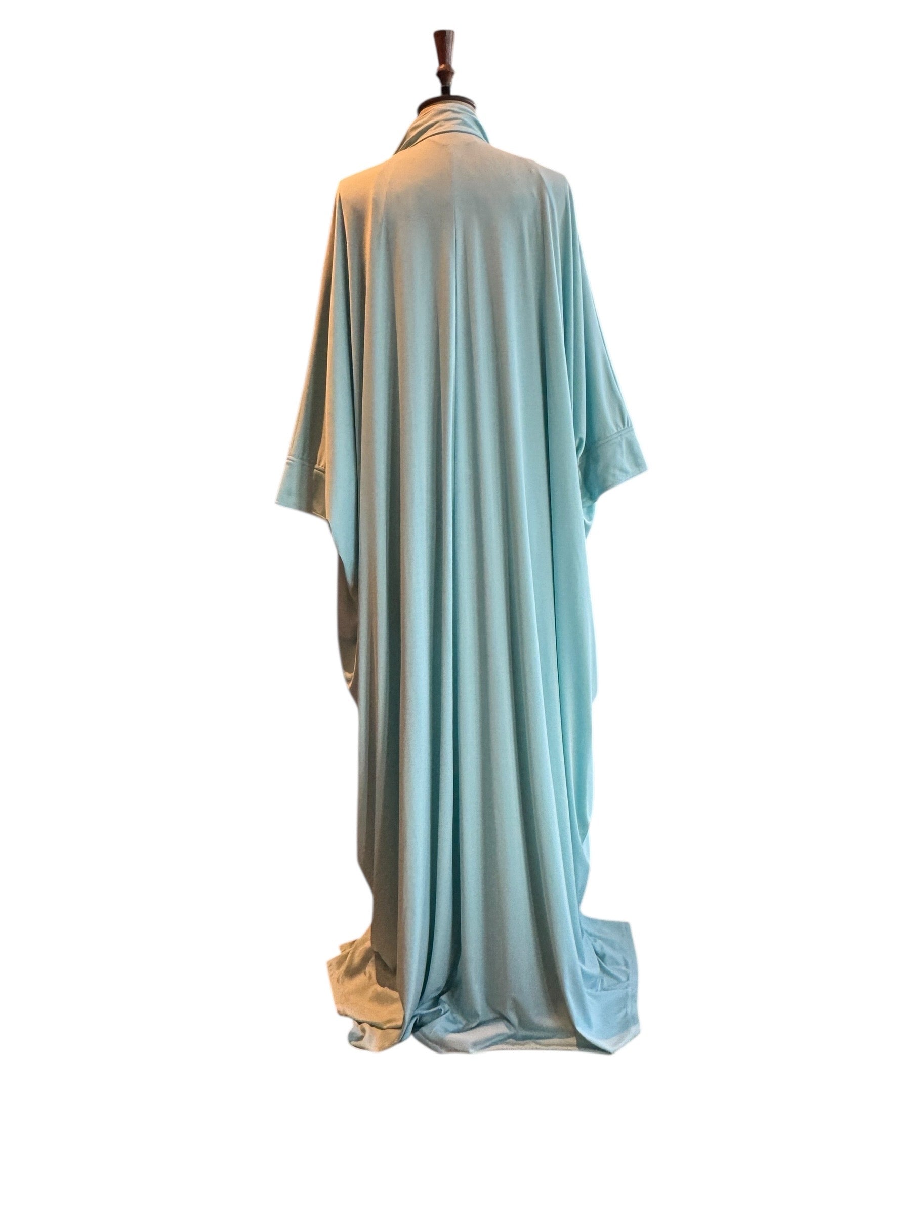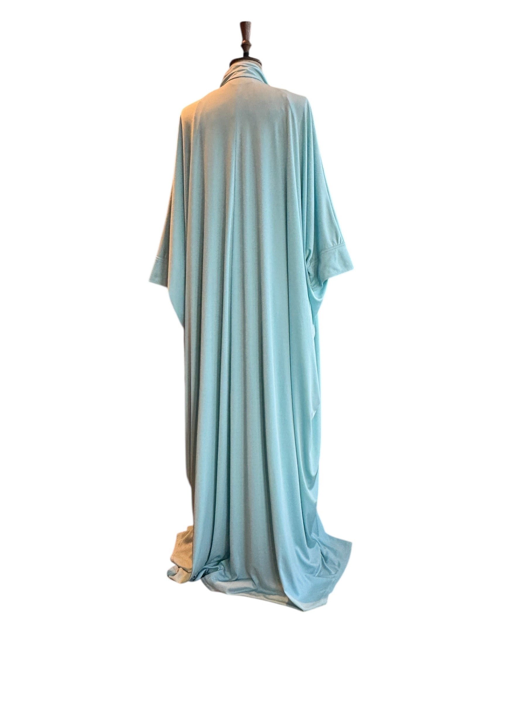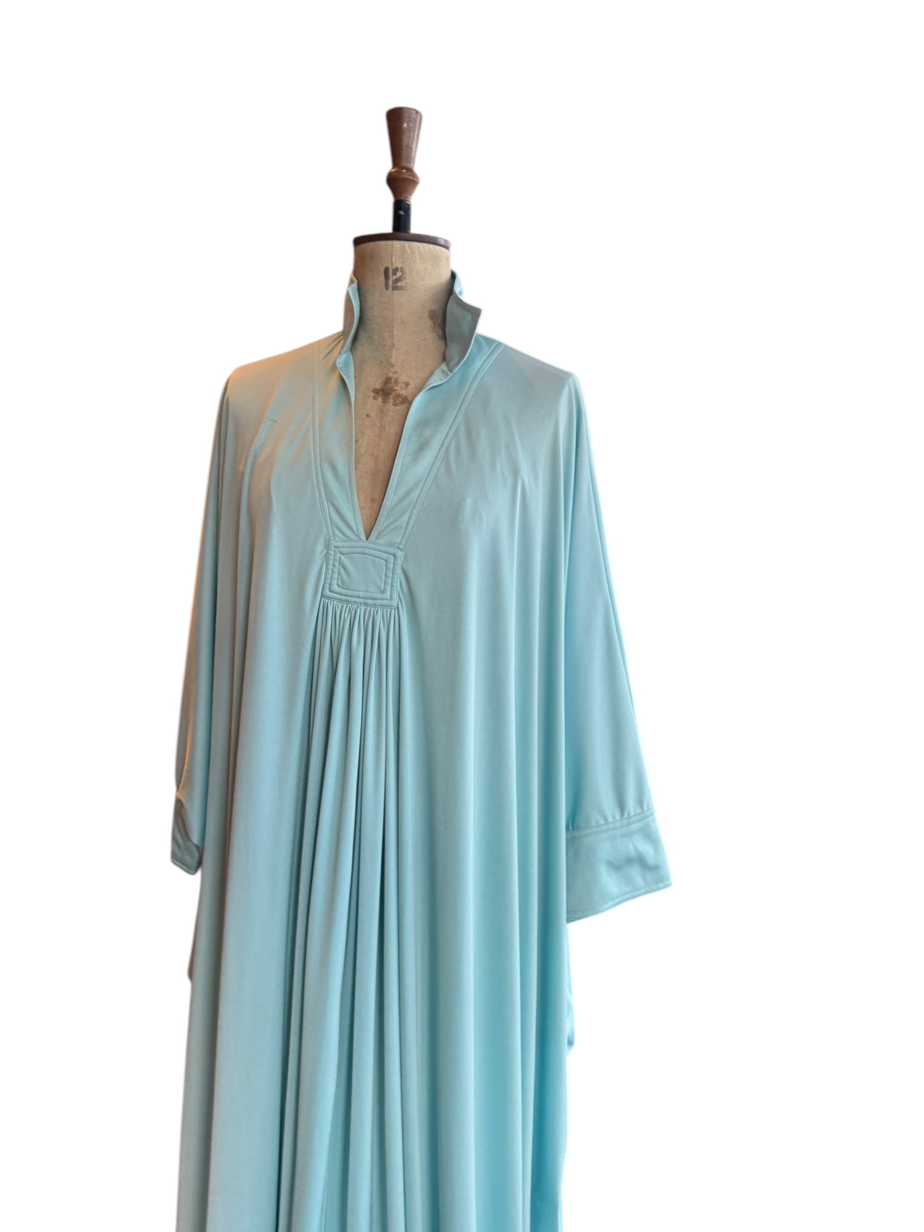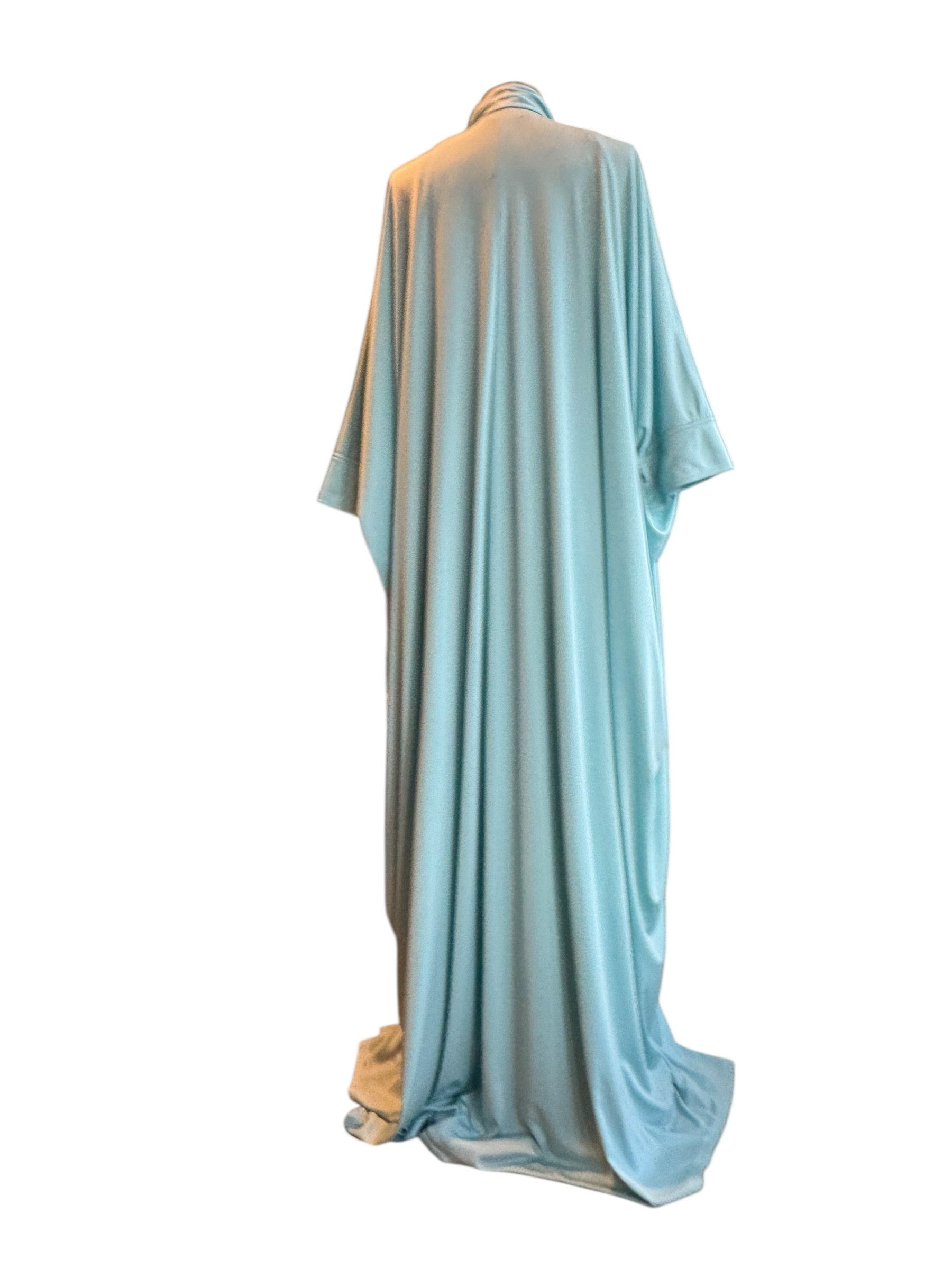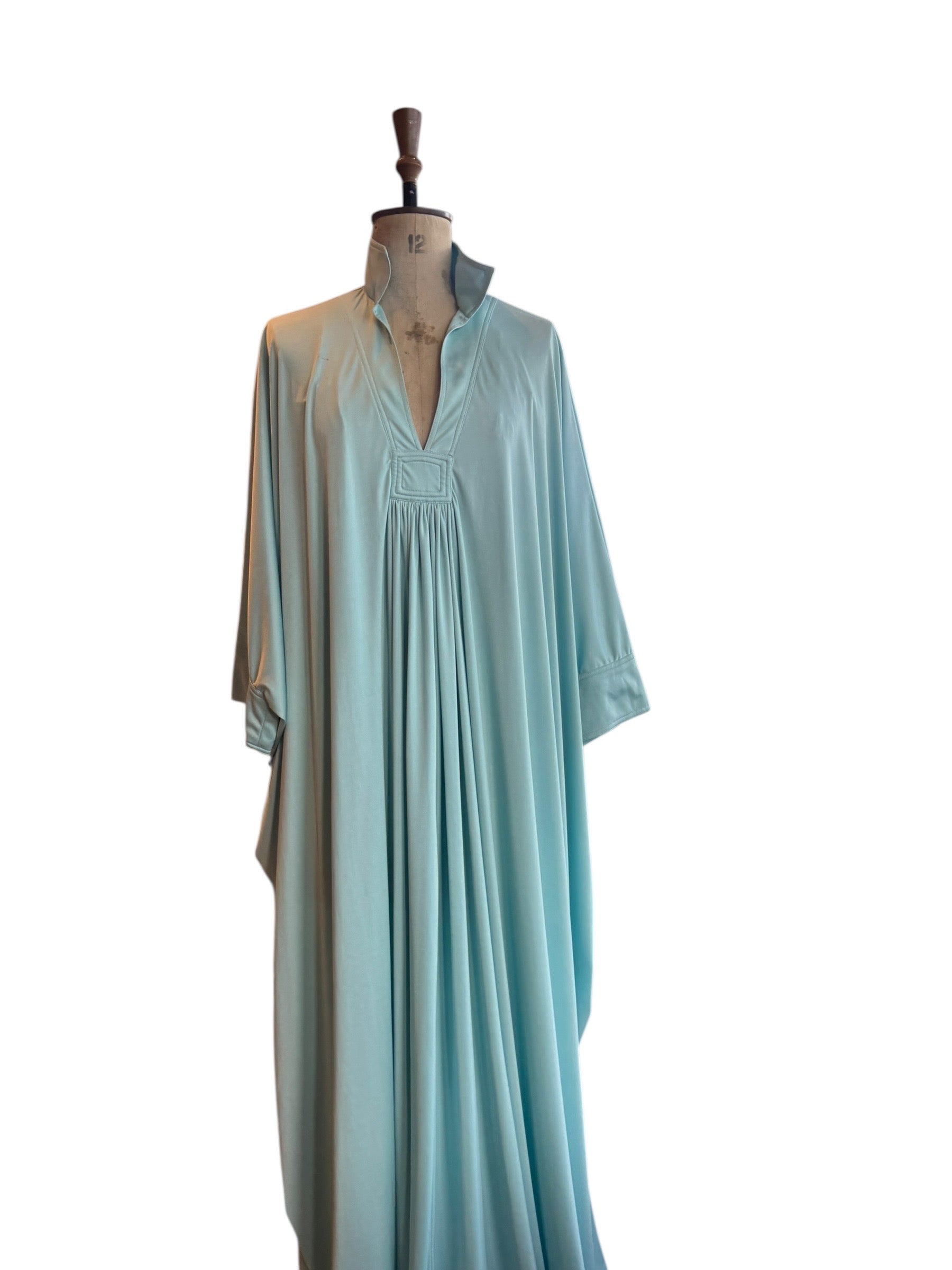 Fabulous Iconic Yuki  70s silk jersey powder blue kaftan dress. This rare and collectible piece features a V-neck line, angel batwing sleeves, and a floor-sweeping design. Perfect for poolside lounging or paired with boots for a bohemian look.