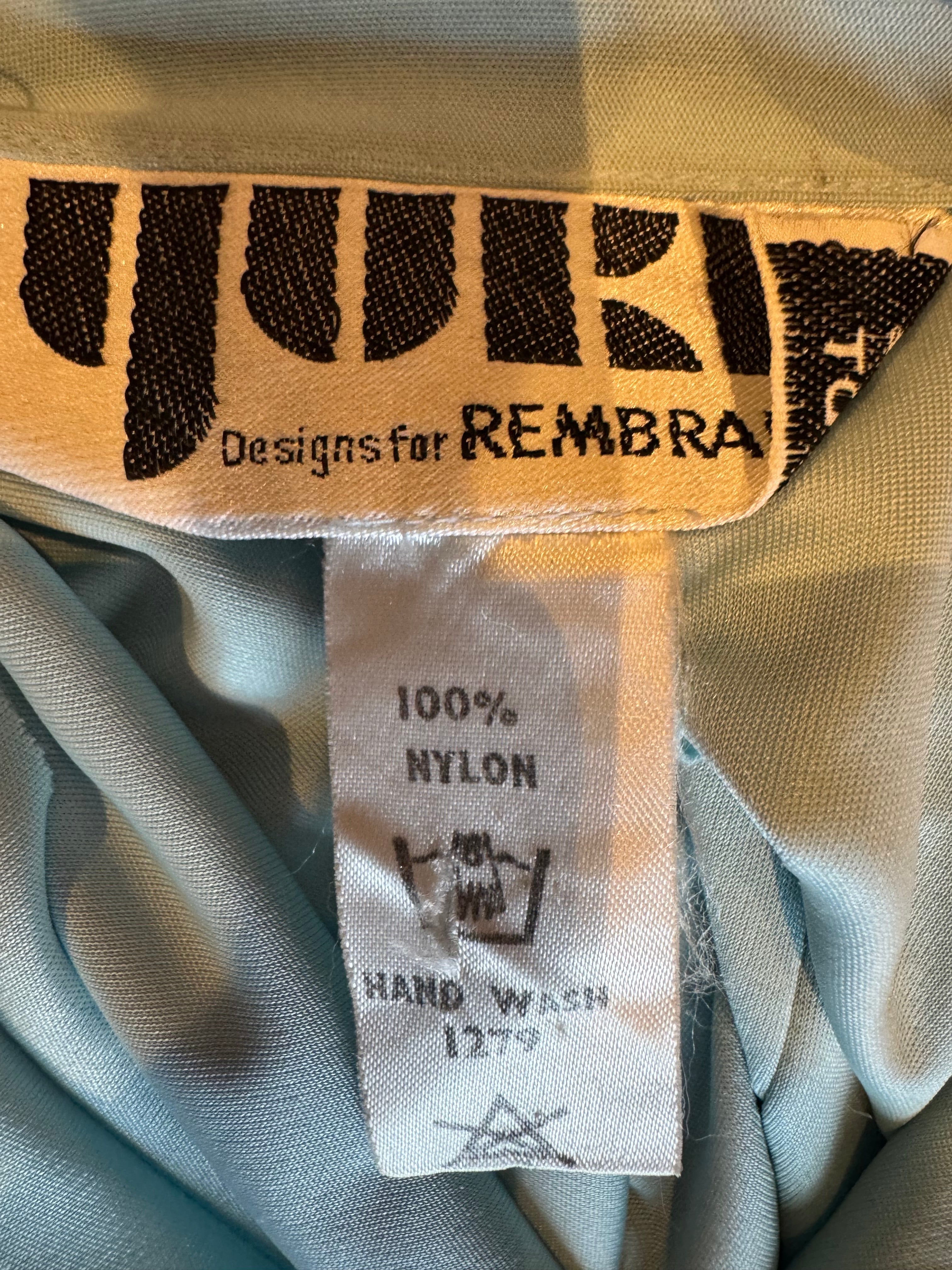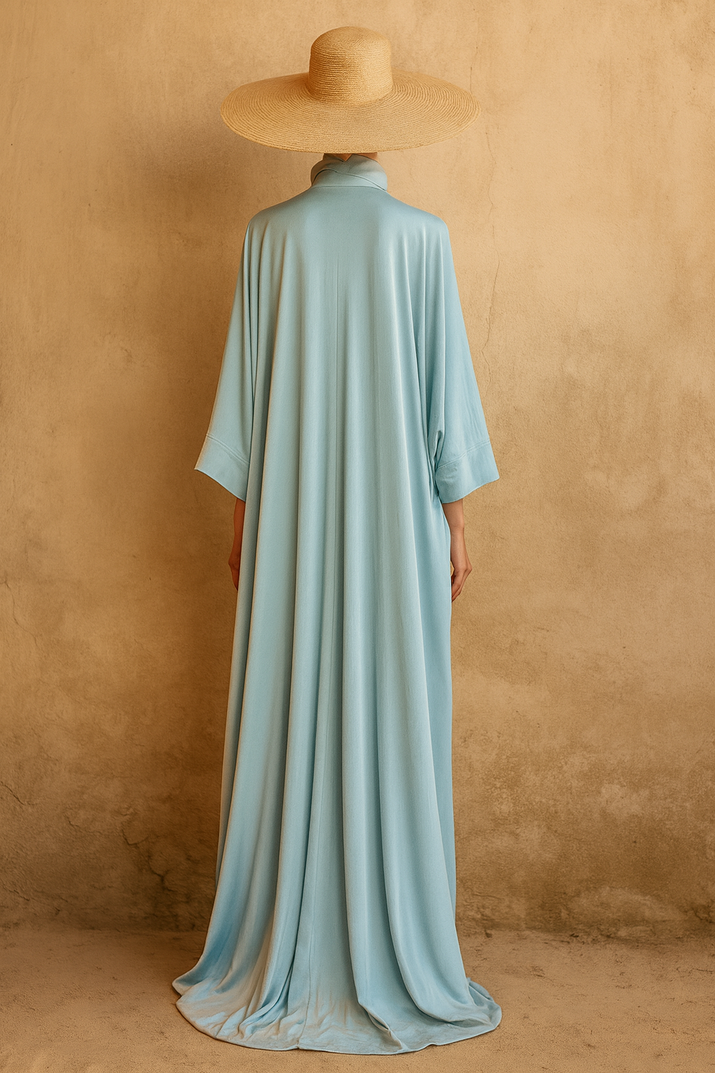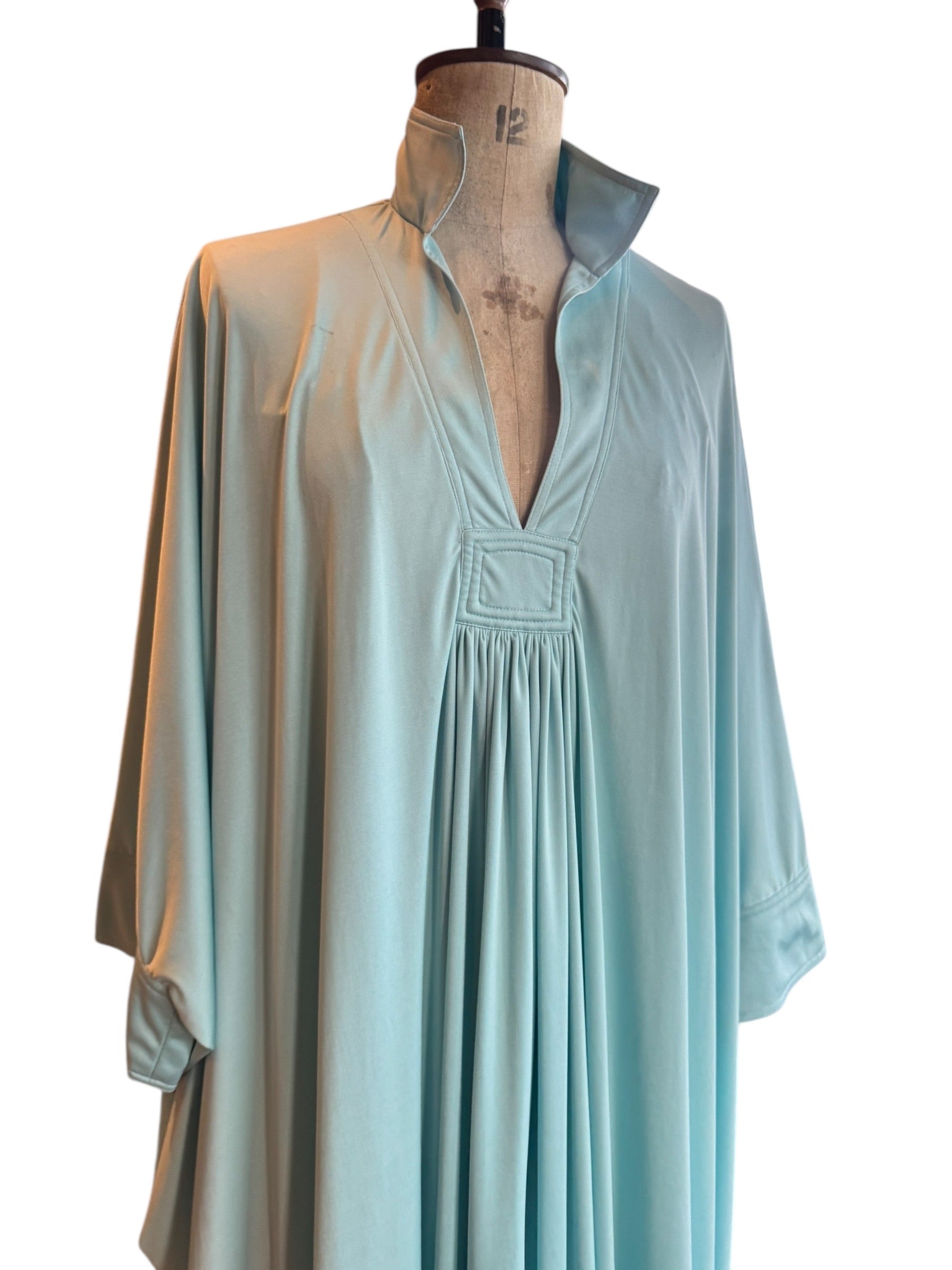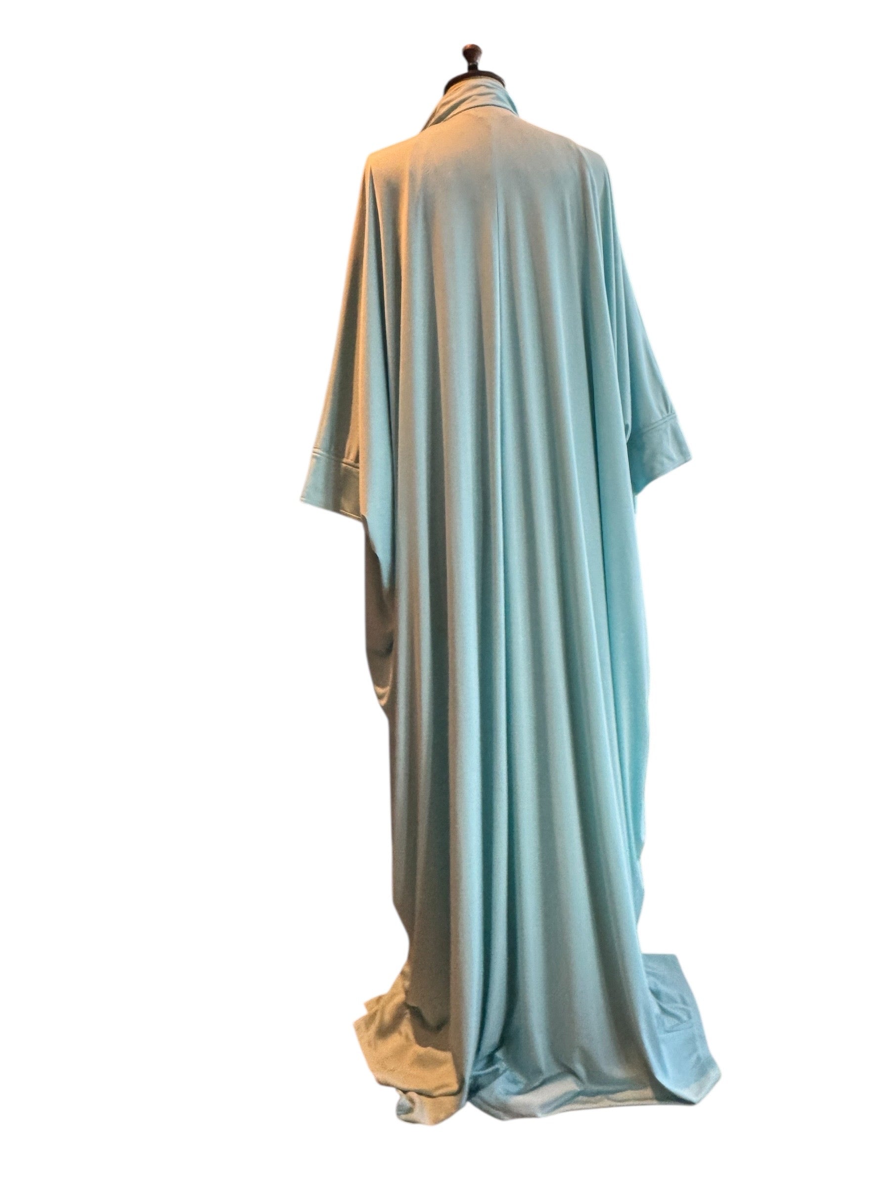 Fabulous Iconic Yuki  70s silk jersey powder blue kaftan dress. This rare and collectible piece features a V-neck line, angel batwing sleeves, and a floor-sweeping design. Perfect for poolside lounging or paired with boots for a bohemian look.