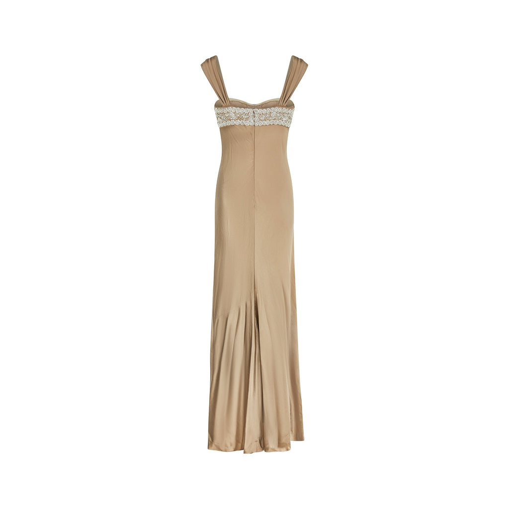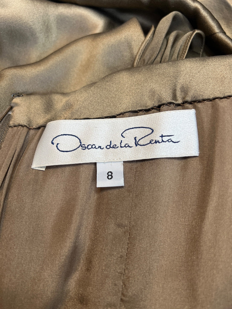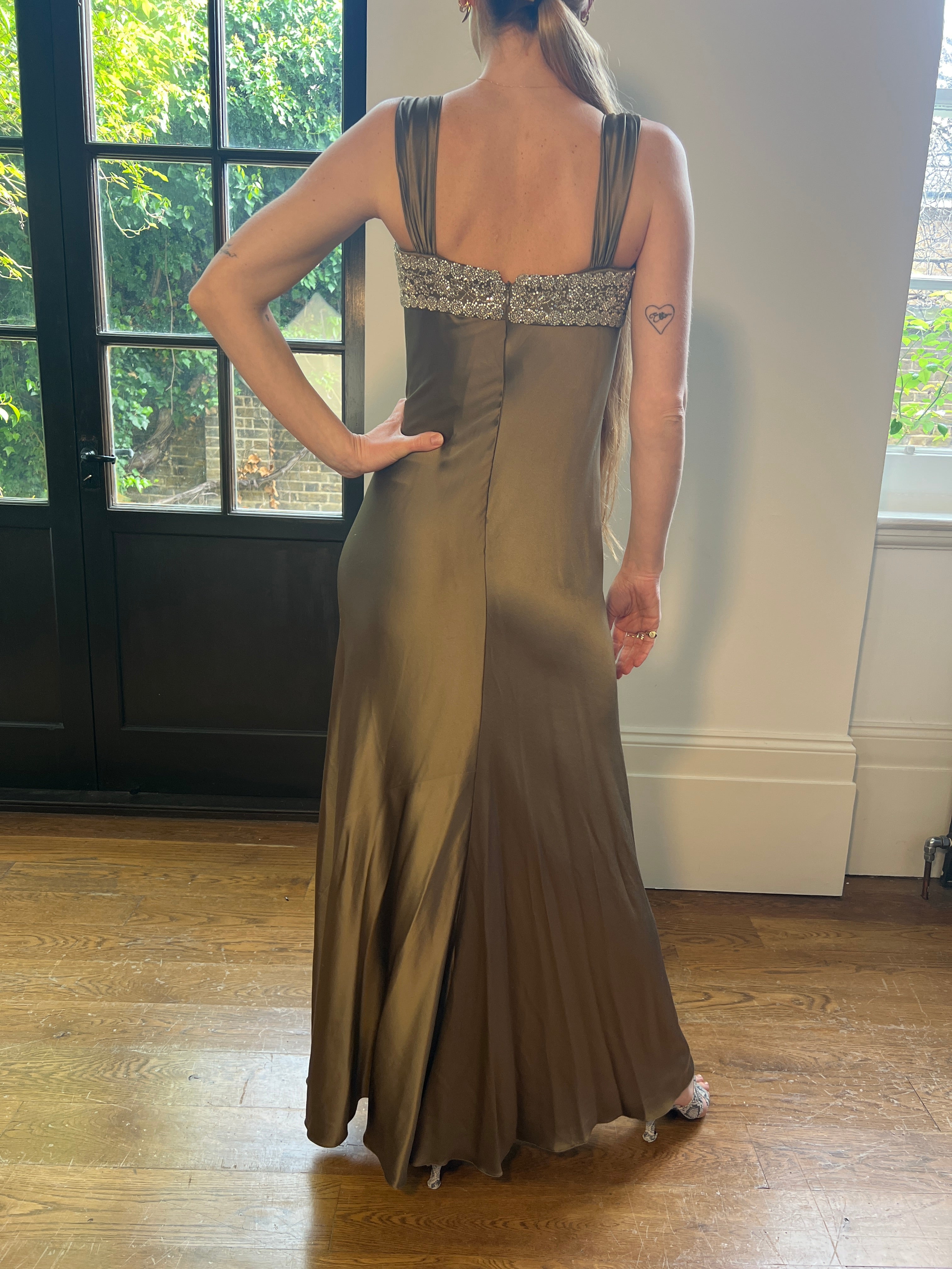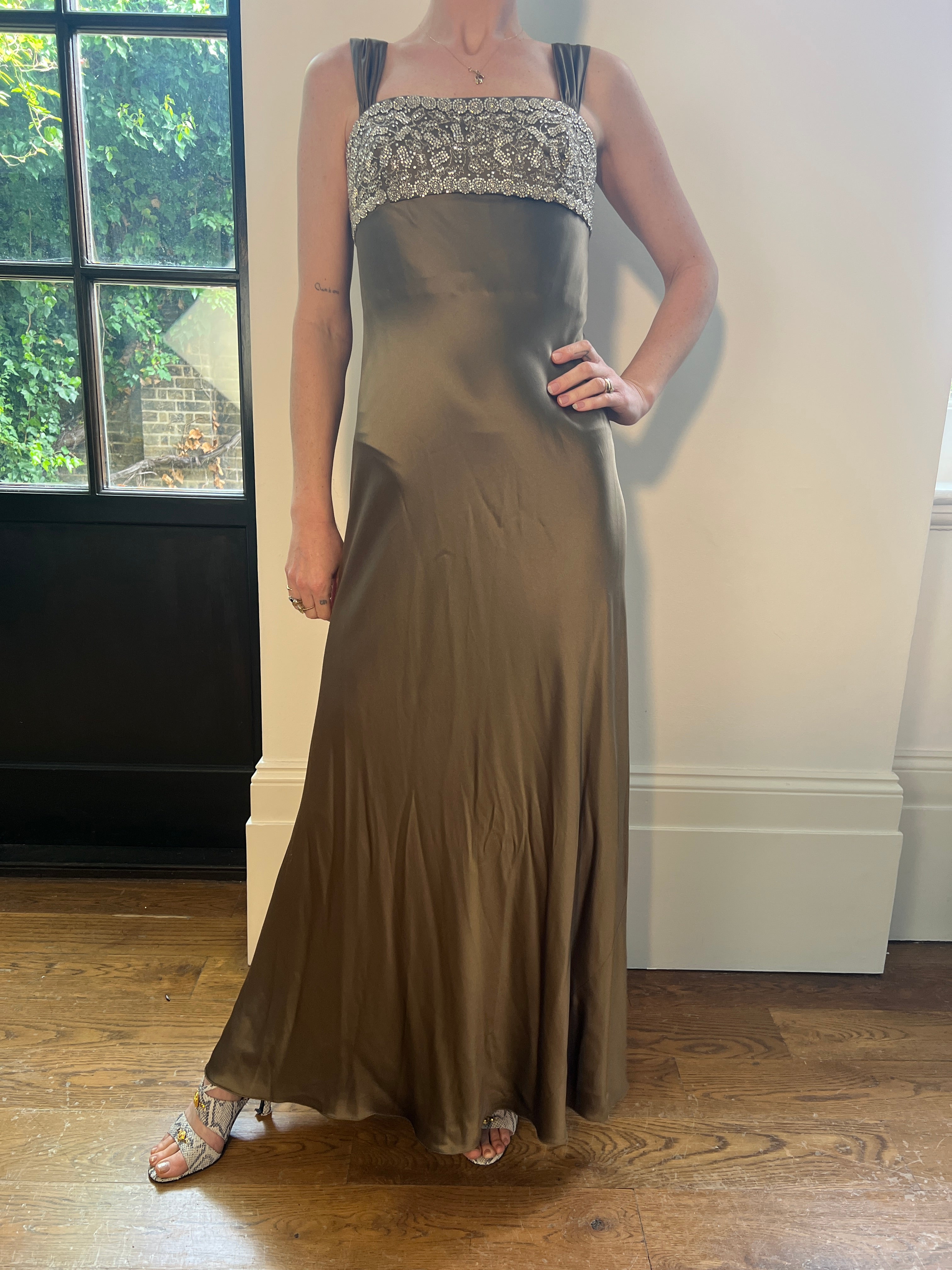 In the review for Oscar De La Renta’s Fall 2005 collection, Vogue described the label as “always elegant and invariably luxe”. Look 52 of 66 from the runway presentation, this graceful, bias-cut gown is tailored from rich mocha silk and is a floor-sweeping length. Signature elaborate embellishments adorn the bust and continue around the back, detailed with botanical shapes created from rhinestones and silver beadwork. The pretty, wide sleeves are crafted from coordinating mocha silk. Oscar De La Renta’s ability to flatter the feminine silhouette is seen in the internal corsetry. Trimmed with grosgrain ribbon, there is an internal zip that holds this corset in place and a silk-covered weight hangs from the inside of the bust, ensuring the neckline sits on the décolletage as the designer intended. With the original Oscar De La Renta tags still attached to the label, this stunning gown is a show-stopping addition to any event wardrobe and is in excellent unworn vintage condition. Labelled a US 8, this equates to a UK 12 and was sold in Bergdorf Goodman for $7800 + taxes. Our model (5ft 11in / 180 cm) is a UK 8-10, this dress fit her well.
