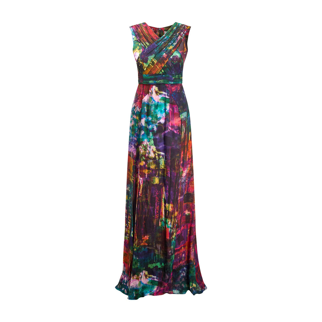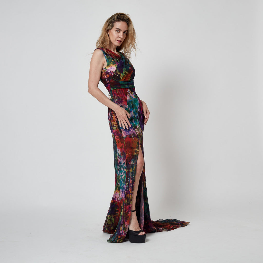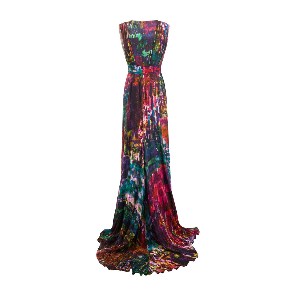 This striking Erdem maxi dress walked the runway as look 33/34 for the brand’s Fall 2011 show. Crafted from smooth silk, the print was uniquely designed by Erdem itself; an abstract, painterly pattern of rainbow hues offset by deeper, autumnal tones. The dress has a dramatic silhouette; cut with a long train, it puddles on the floor around the wearer like a spilled paint palette. The skirt has a high slit in the front. The gown is cut in a column silhouette that has been cinched by pleated panels of fabric which cross-over at the bust and wrap around the waist. It is lined with black silk-satin at the bust. The skirt is unlined. It fastens at the back with a hidden black zip.