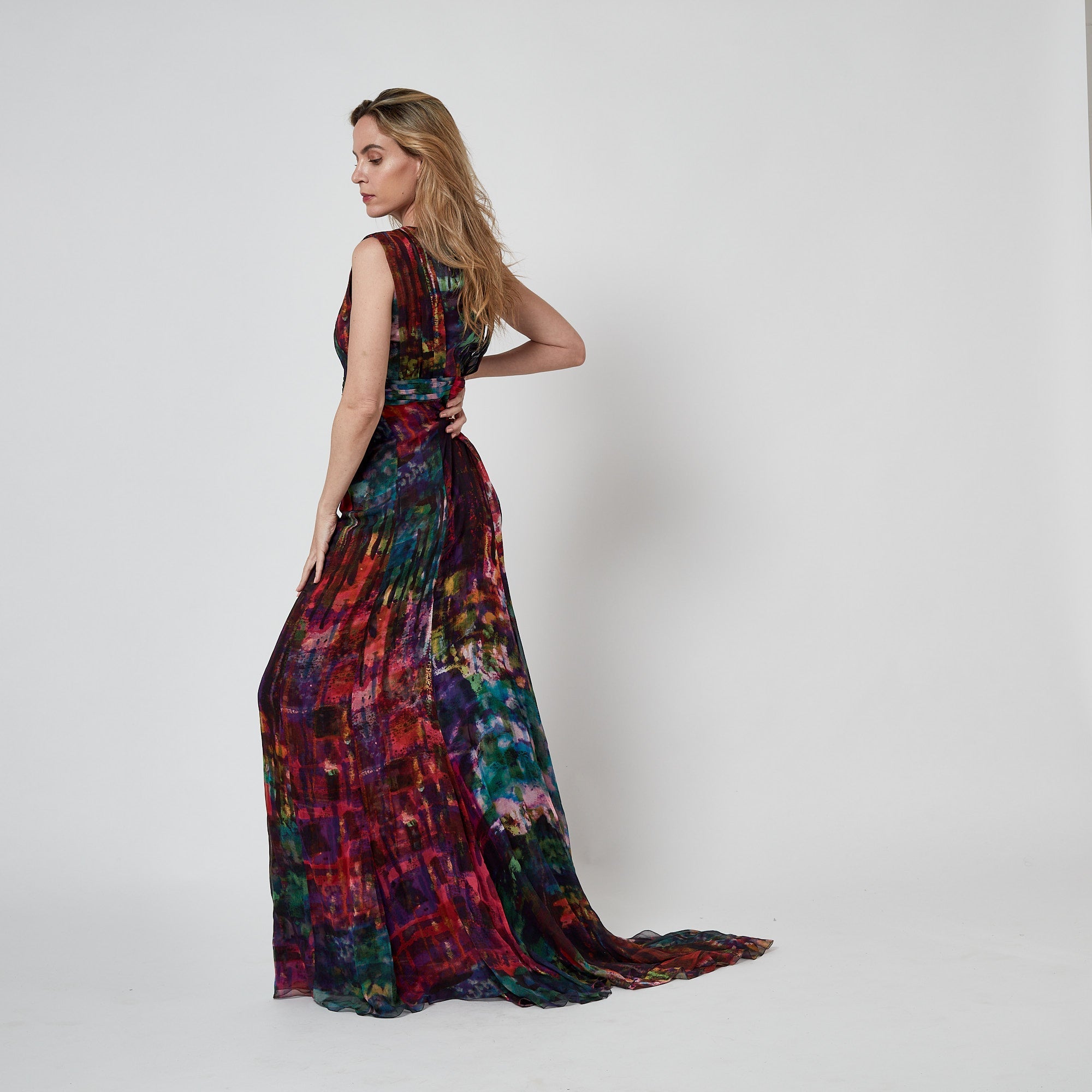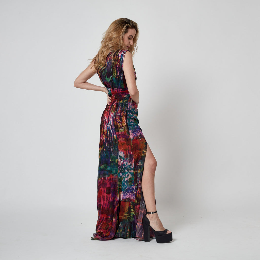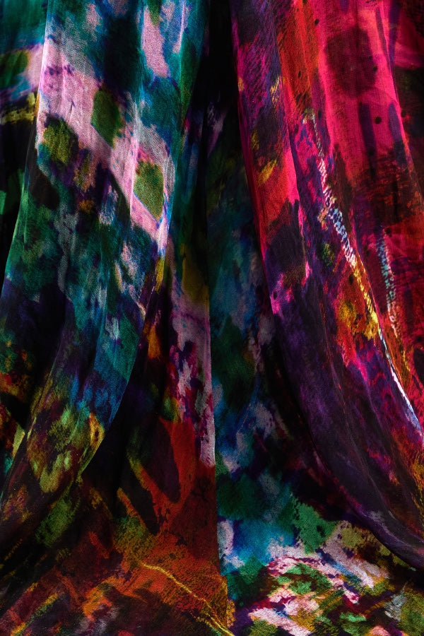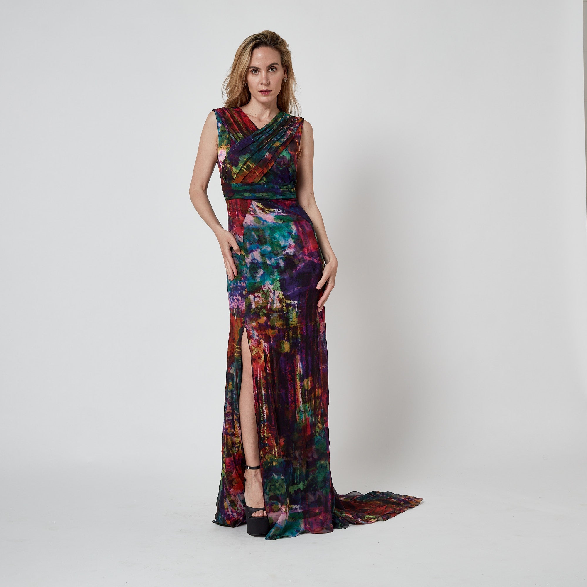 This striking Erdem maxi dress walked the runway as look 33/34 for the brand’s Fall 2011 show. Crafted from smooth silk, the print was uniquely designed by Erdem itself; an abstract, painterly pattern of rainbow hues offset by deeper, autumnal tones. The dress has a dramatic silhouette; cut with a long train, it puddles on the floor around the wearer like a spilled paint palette. The skirt has a high slit in the front. The gown is cut in a column silhouette that has been cinched by pleated panels of fabric which cross-over at the bust and wrap around the waist. It is lined with black silk-satin at the bust. The skirt is unlined. It fastens at the back with a hidden black zip.
