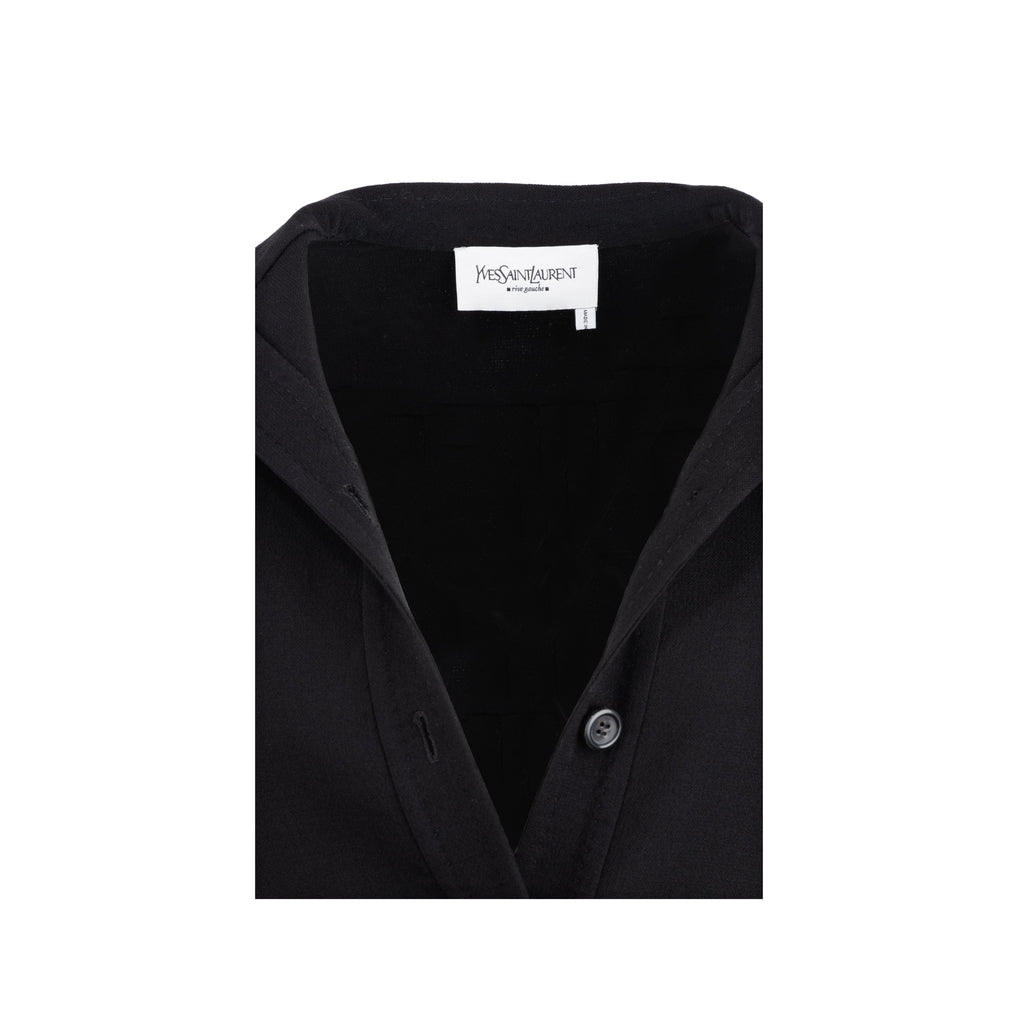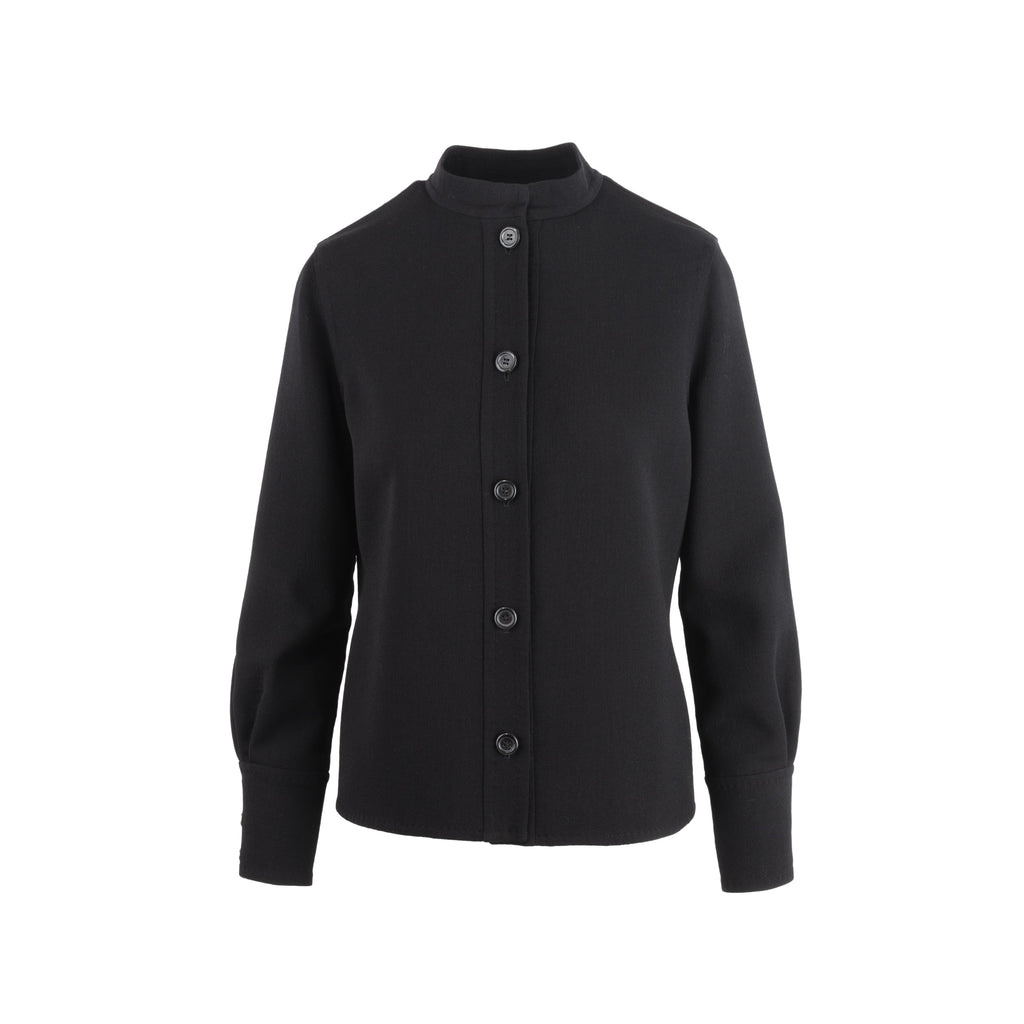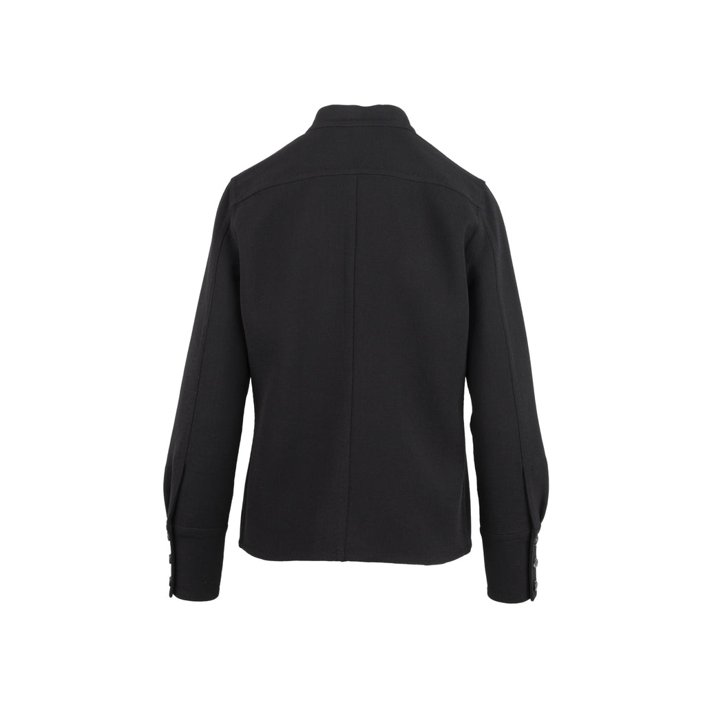 Yves Saint Laurent black wool jacket, Korean style with mandarin collar, front button placket and black buttoned overlay cuffs.