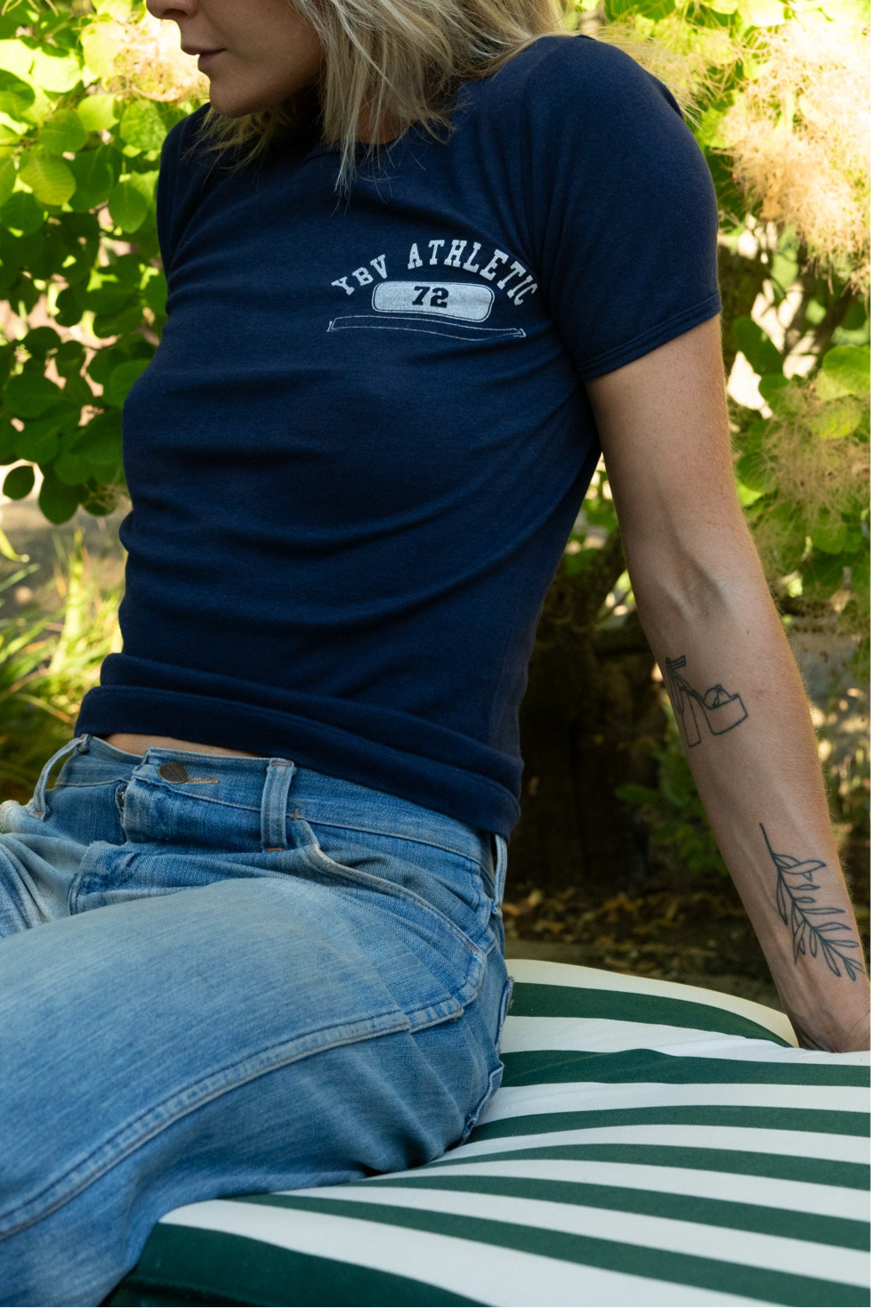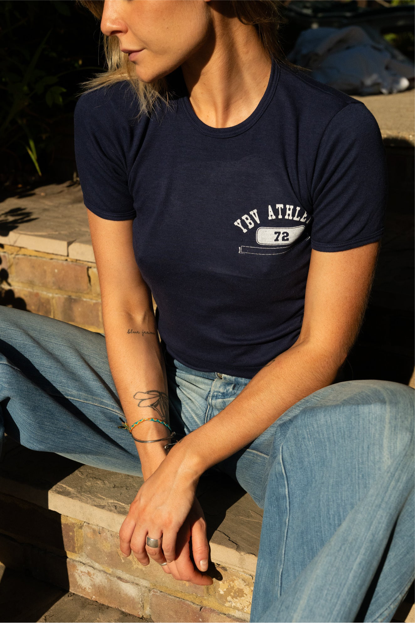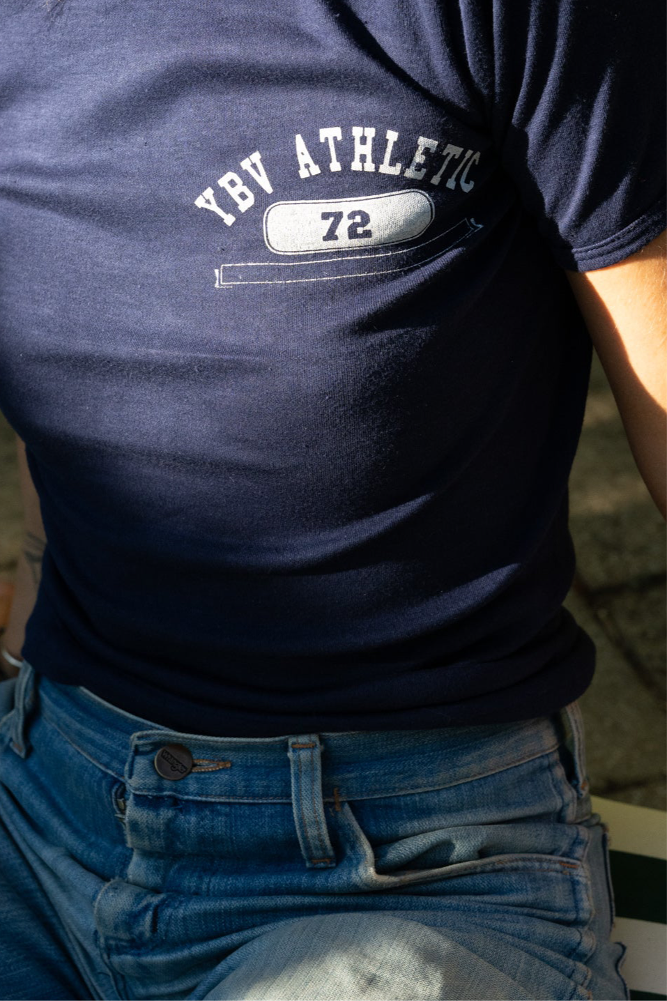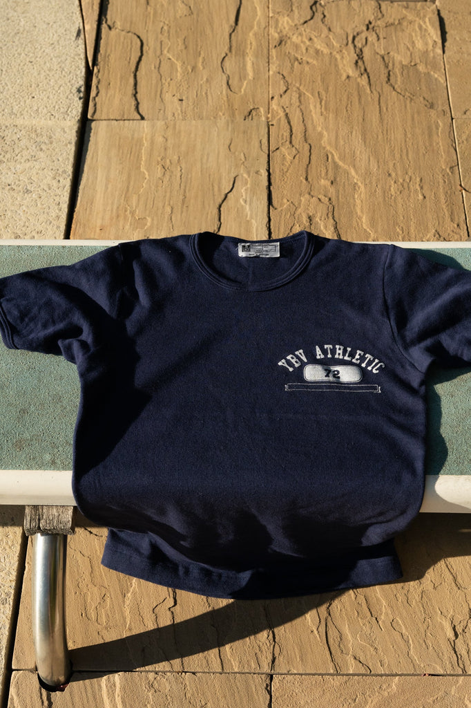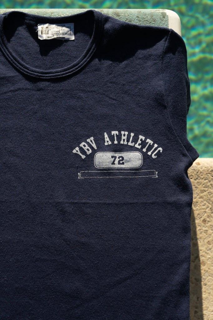 1970s navy blue T-shirt with our custom printed YBV ATHLETIC graphic on the chest